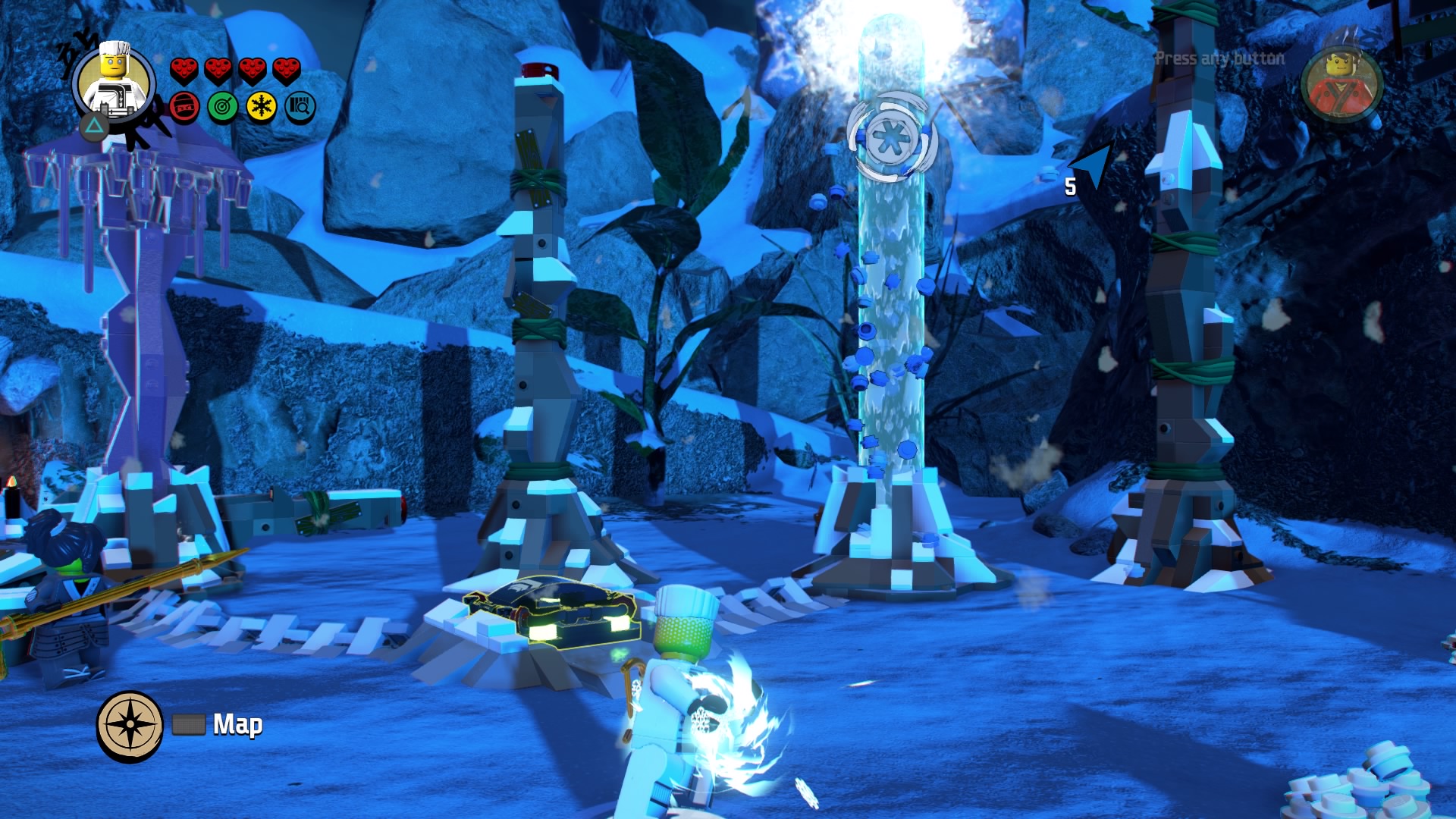 At the start of the level, you’ll have a full team including an un-caged Lord Garmadon. Approach the crash site and smash the glowing LEGO engine. Multi Build with Lloyd – construct on the left, then on the right. Hit each of the hammer markers to generate a geyser of water. Freeze the water with Zane, including both geysers on the right. Then you’ll be able to hop up the pillars.