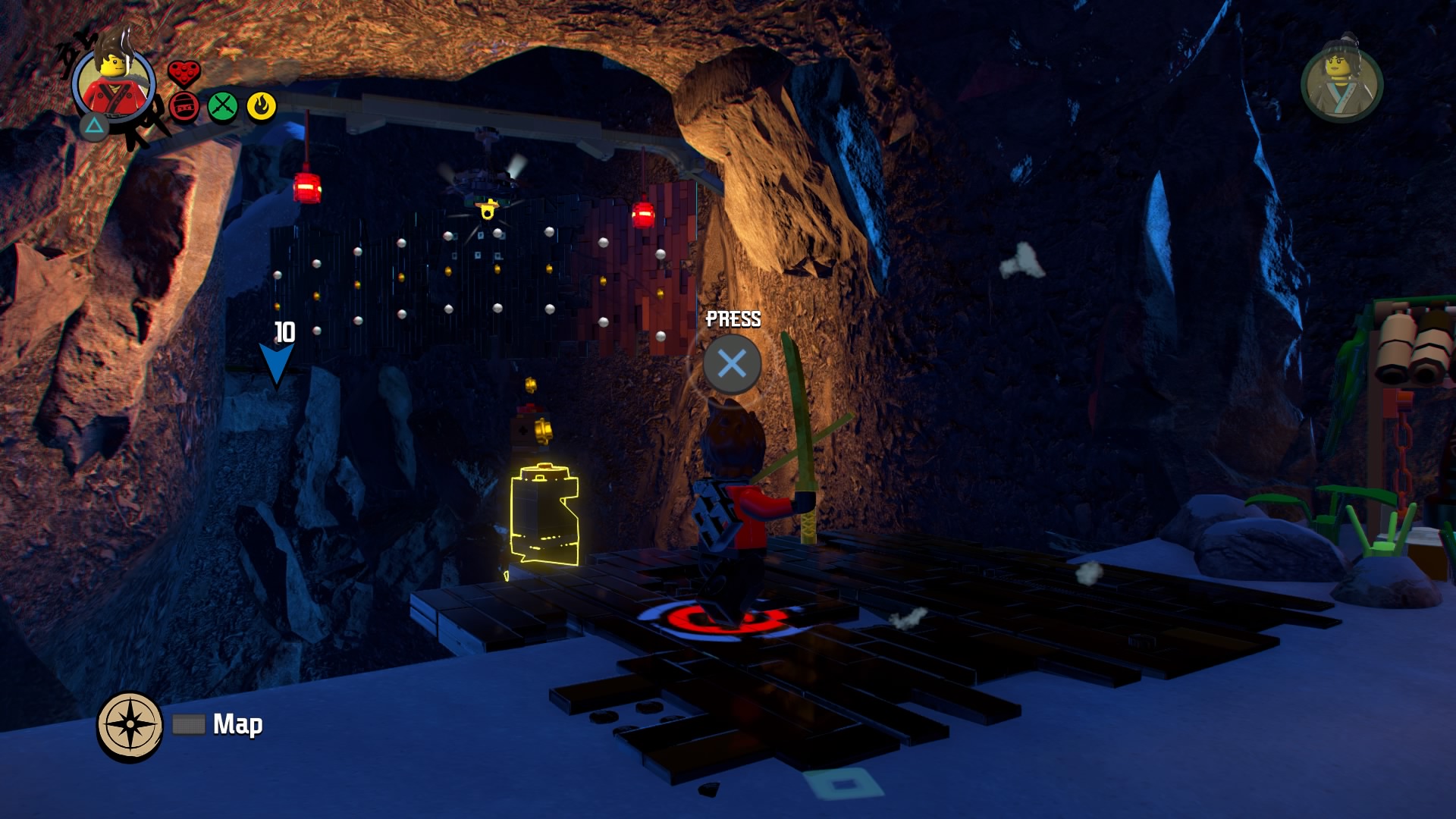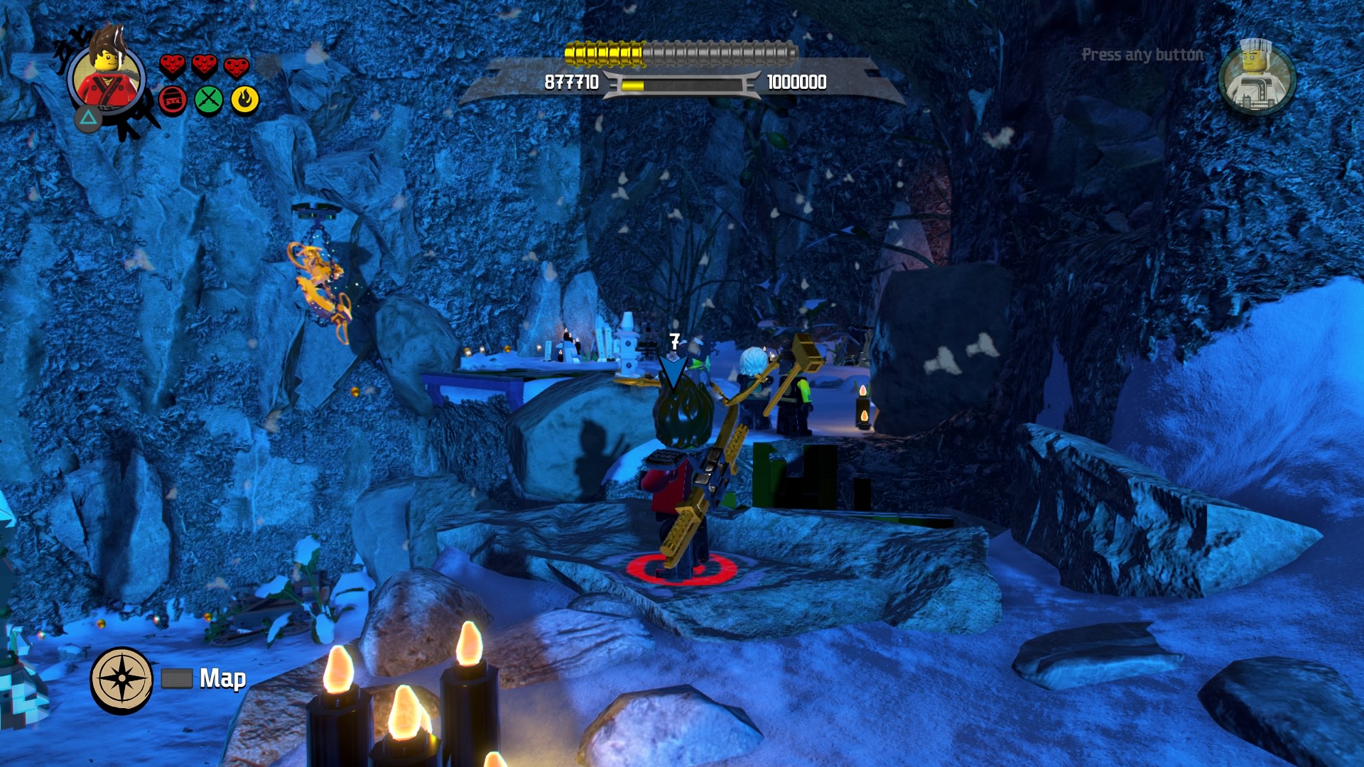 Melt the ice wall with Kai. There’s a cracked LEGO wall here, but you can ignore it for now. Continue into the large open area ahead – there’s a weird purple ball rolling down a track toward a green LEGO dragon statue. Hit the red marker twice with spinjitzu to turn the dragon. Summon another purple orb by jumping on the handle to the right of the statue, above the red LEGO circle.