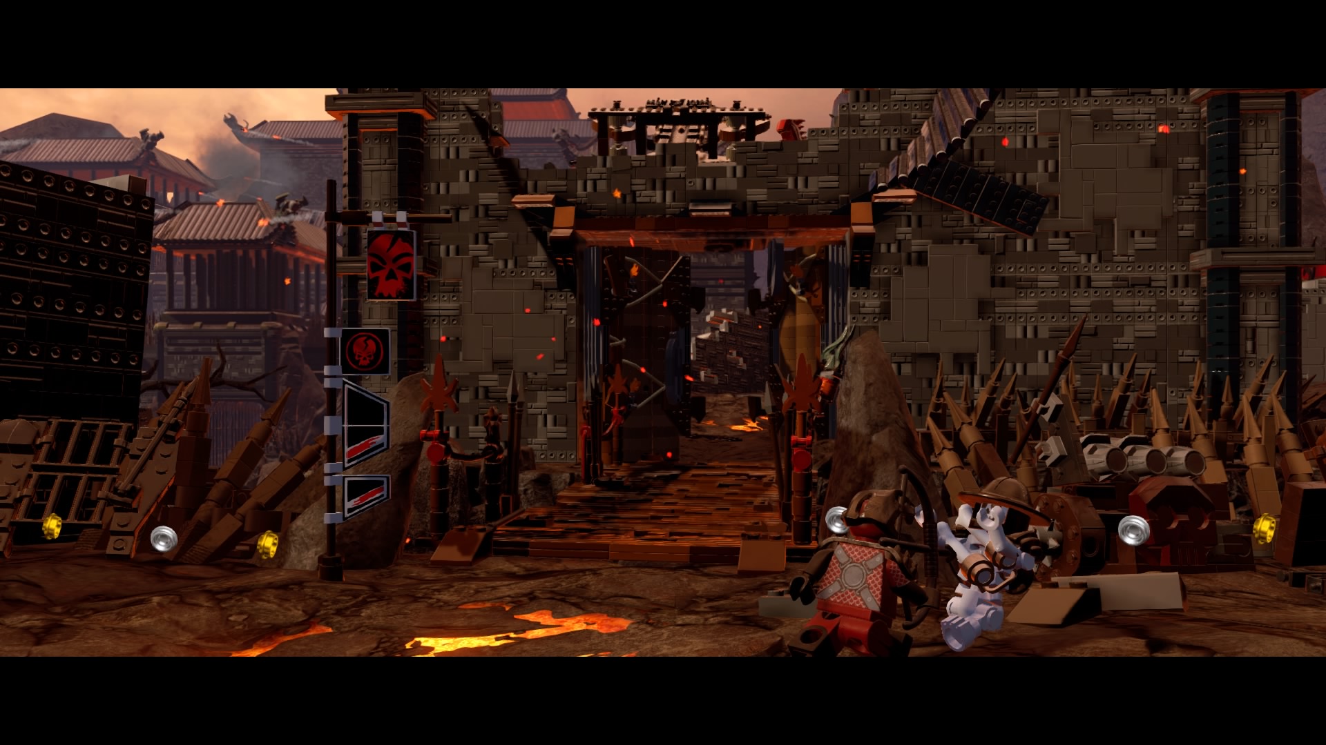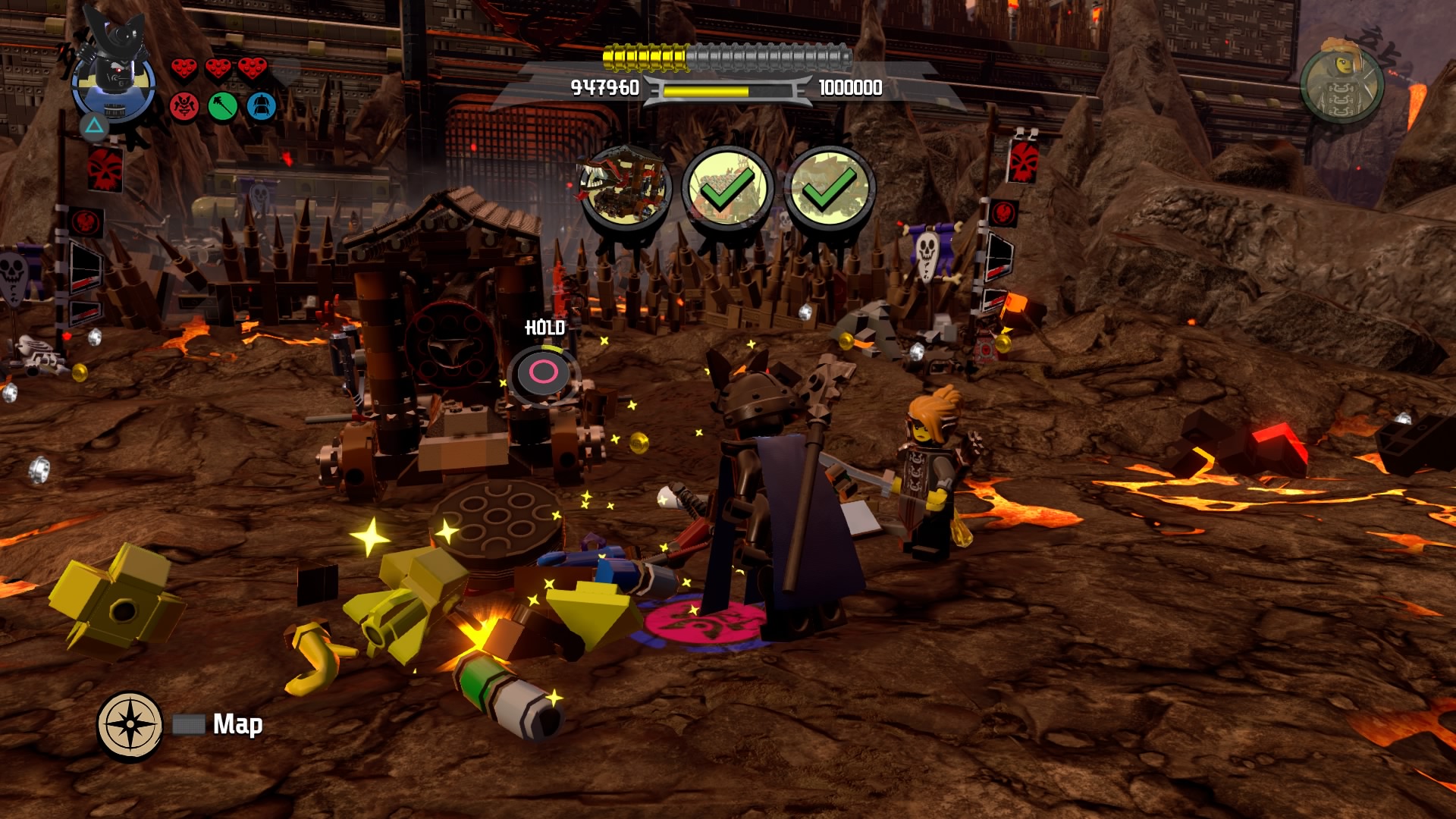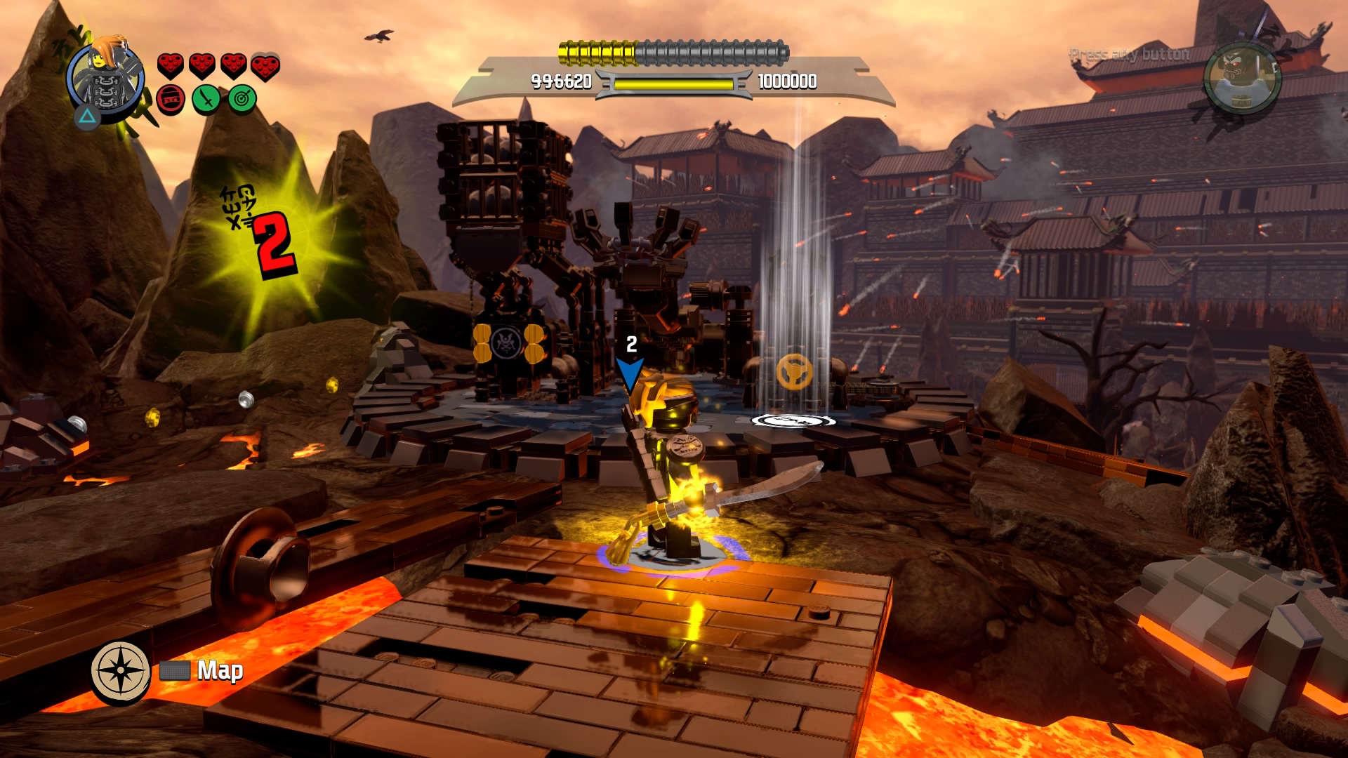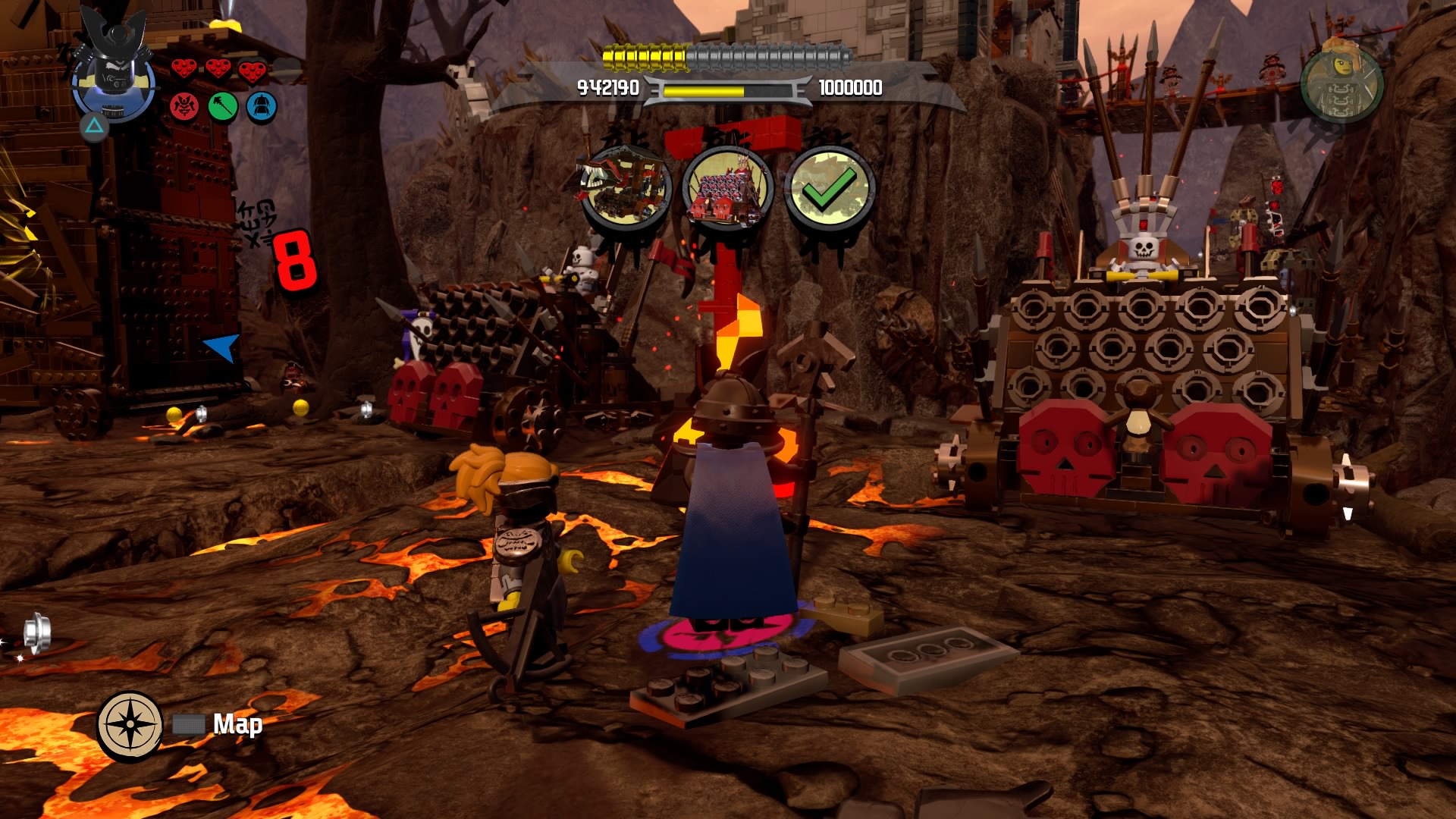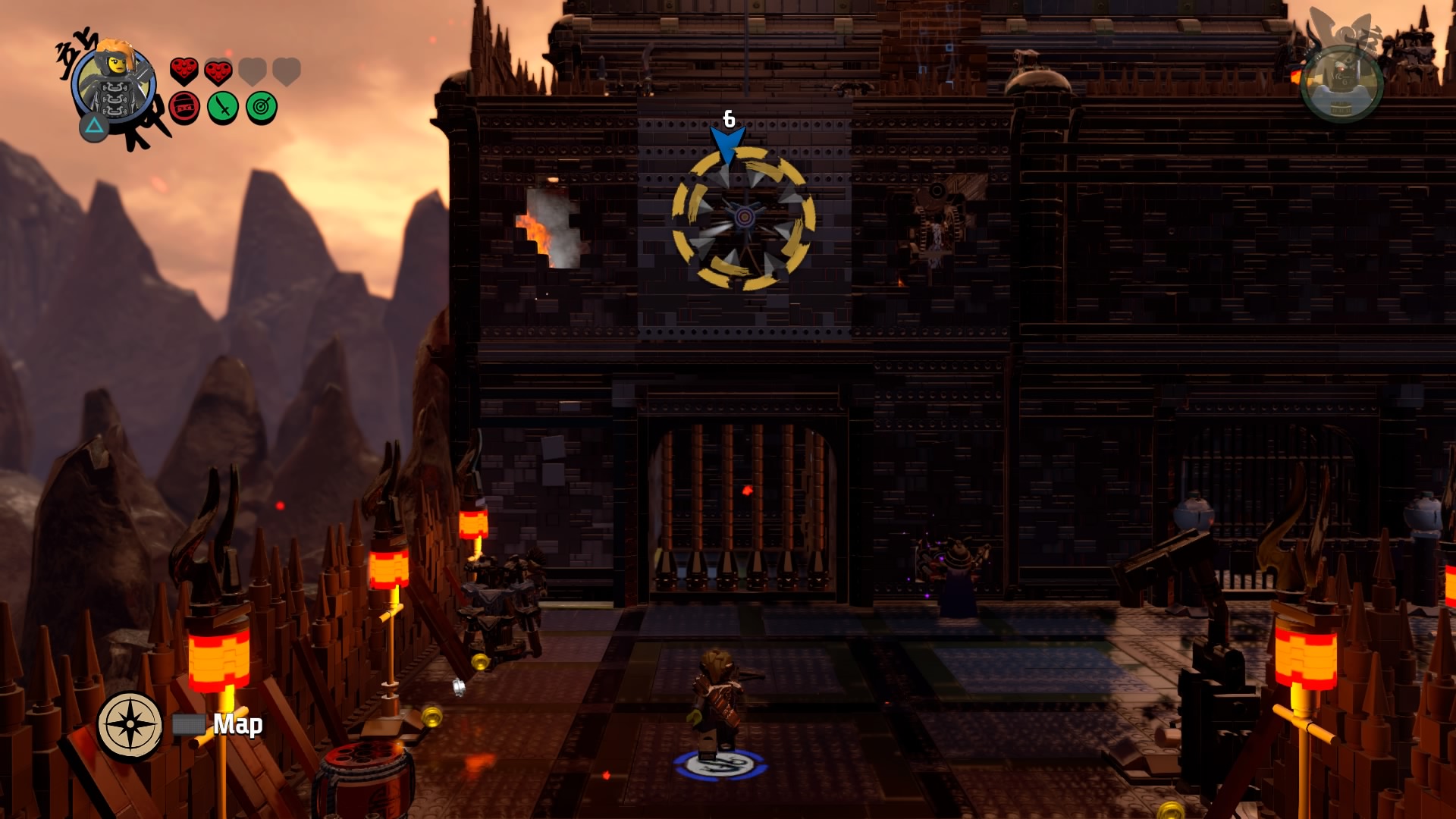 Break the Warlord LEGO object with Lord Garmadon and build the pieces into a firework. Hop on the pad to launch and signal your catapult to destroy the first piece of siege equipment. The second piece of equipment are two launchers. Defeat the minions and destroy the Warlord LEGO object. Launch the rocket and these two devices are destroyed.