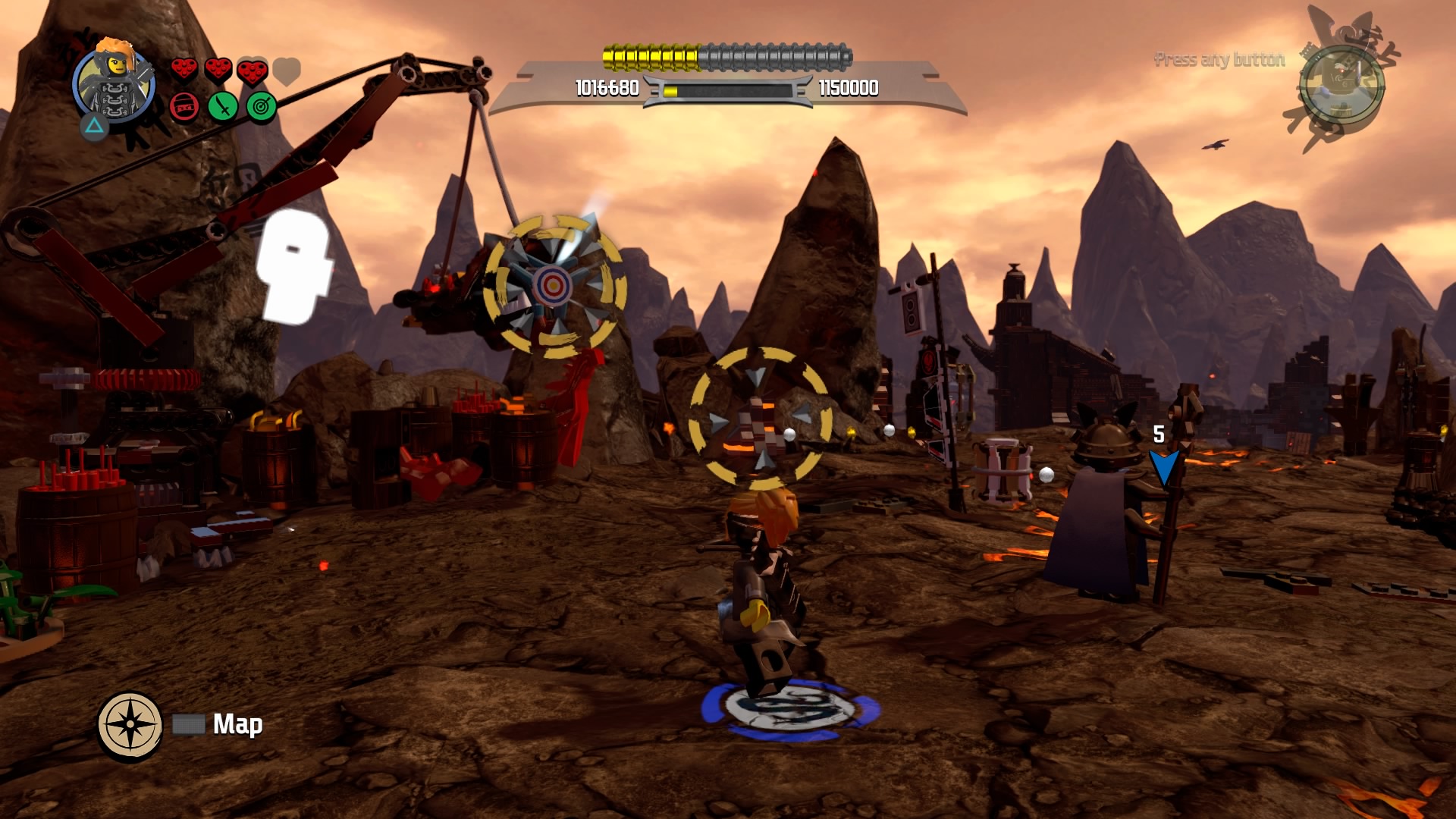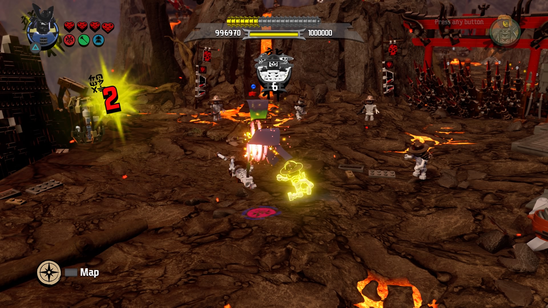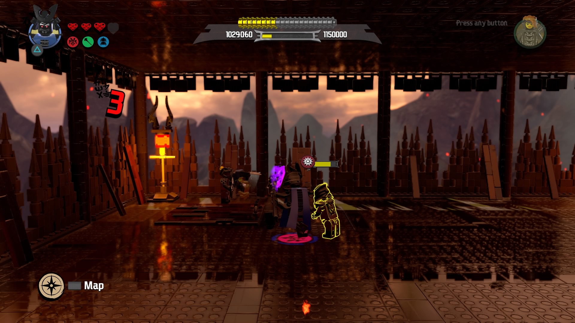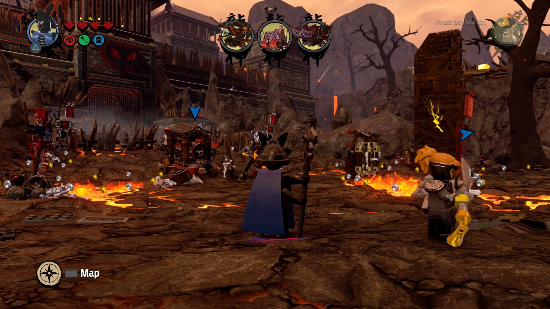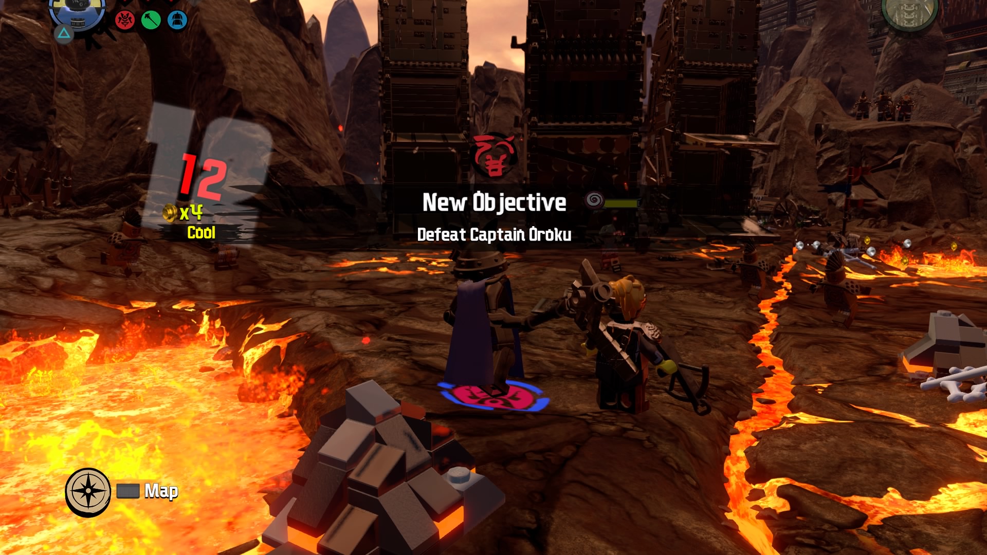 Break the Warlord LEGO object with Lord Garmadon and build the pieces into a firework. Hop on the pad to launch and signal your catapult to destroy the first piece of siege equipment. The second piece of equipment are two launchers. Defeat the minions and destroy the Warlord LEGO object. Launch the rocket and these two devices are destroyed.