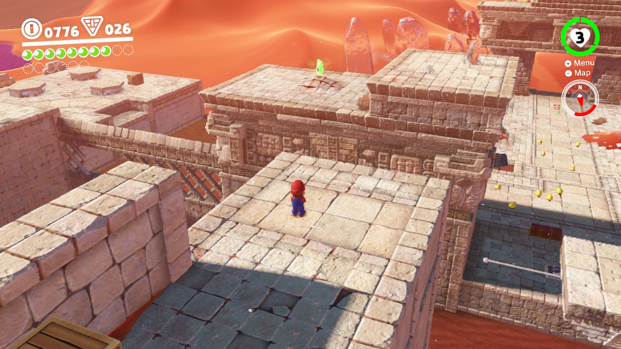 From the Moe-Eye Habitat and moving toward the Inverted Pyramid, Mario will find a stone circle with a skeleton inside. Talk to him – he’s missing three sheep! Run behind the sheep to lead them back into the enclosure. They’re all pretty close by.