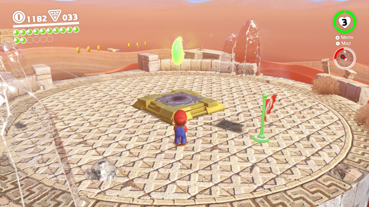 Enter the 2D Mario section in the stone tower at the Tostarena Ruins Round Tower flag. Before jumping up to the top of the tower, move into the area to the left (the platform will move under your platform) to find this easy-to-miss secret.