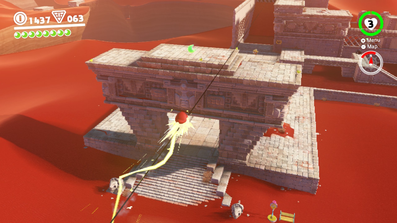When Mario reaches the second Bullet Bill launcher in Tostarena Ruins, look to the right to spot a Moon on a leaning pillar. It looks too far to reach – unless you capture a Bullet Bill! Grab one and fly it over to the Moon.