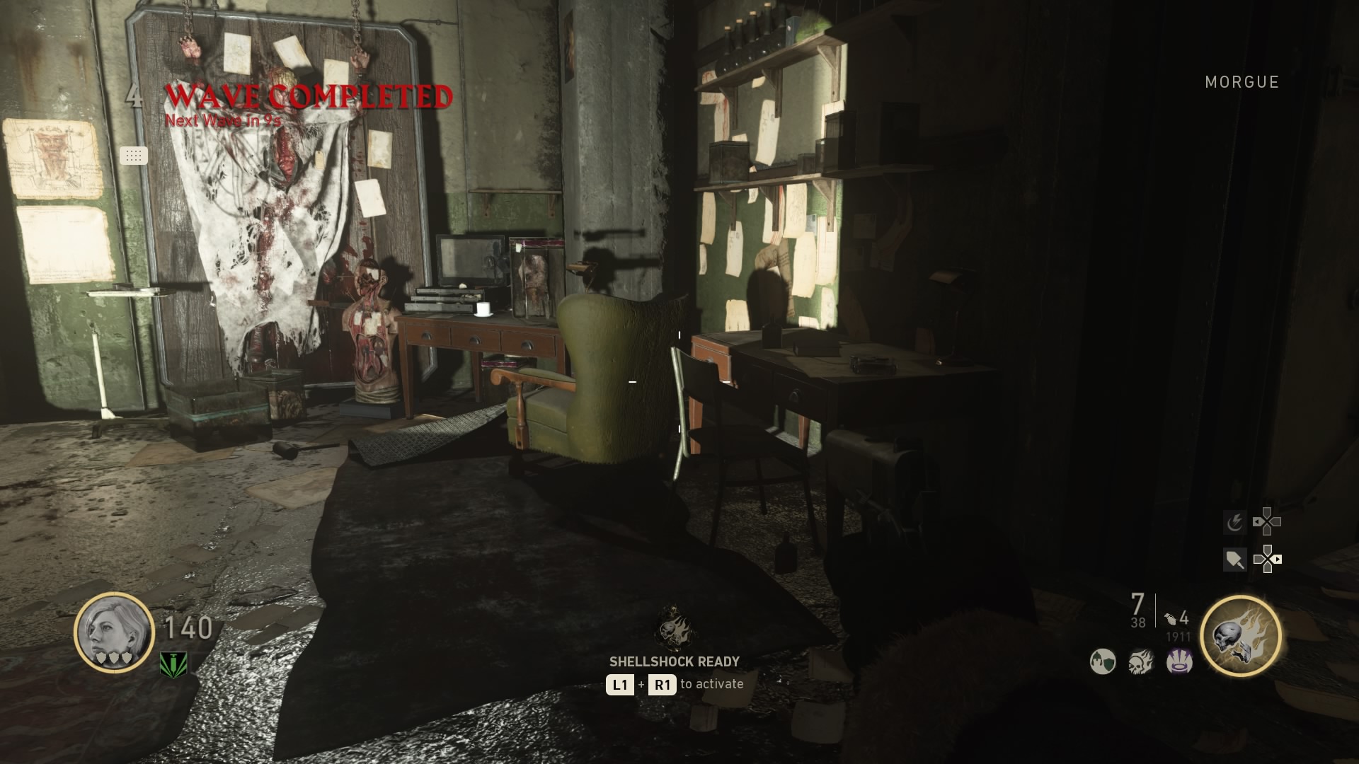 - Recorder Spawn Location #12: Morgue – Go through the hallway to the left of the Tesla Gun weapon part machine. To the left of the stairs leading down, there’s a table with a recording device.