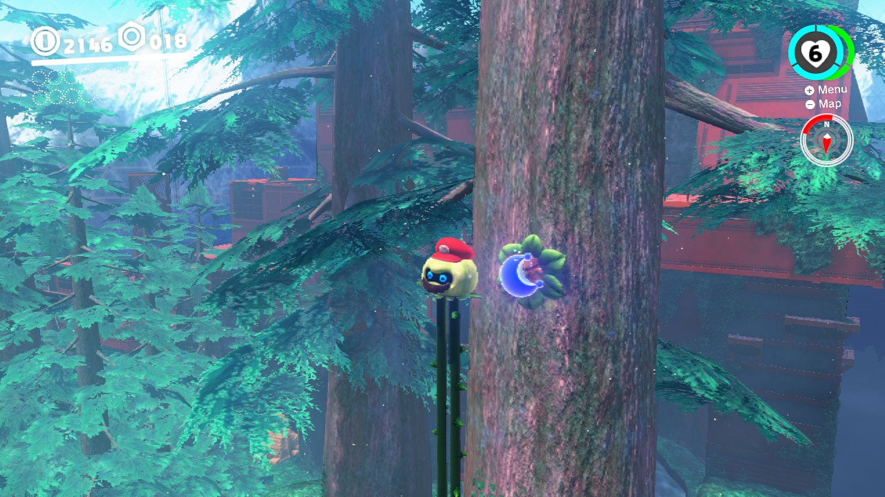 In the area with the stretching creatures Mario can capture, in the southeast corner of the map, look for a tall tree with a platform sticking out. Capture a stretcher, and stretch to each platform until you find a hard shell plant. Jump on the shell a few times with the stretcher to reveal a Power Moon.