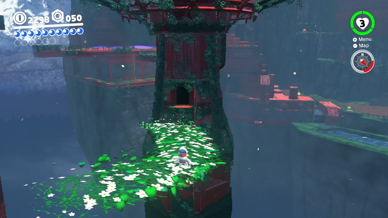 The full area can’t be explored until after you’ve defeated the robotic big boss in the Secret Flower Field at the end of the main story quest. When he’s beaten, you can return to the top of the Iron Mountain and activate platforms to reach the Observation Deck. Here, at the highest point on the map, you can capture a friendly glider guy. You can spin circles around the Wooded Kingdom and skip entire platforming areas to earn easy Power Moons — if you can spot the nuts from far away.