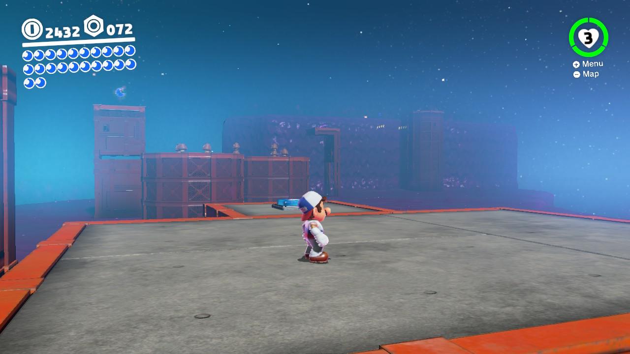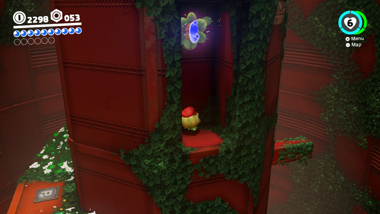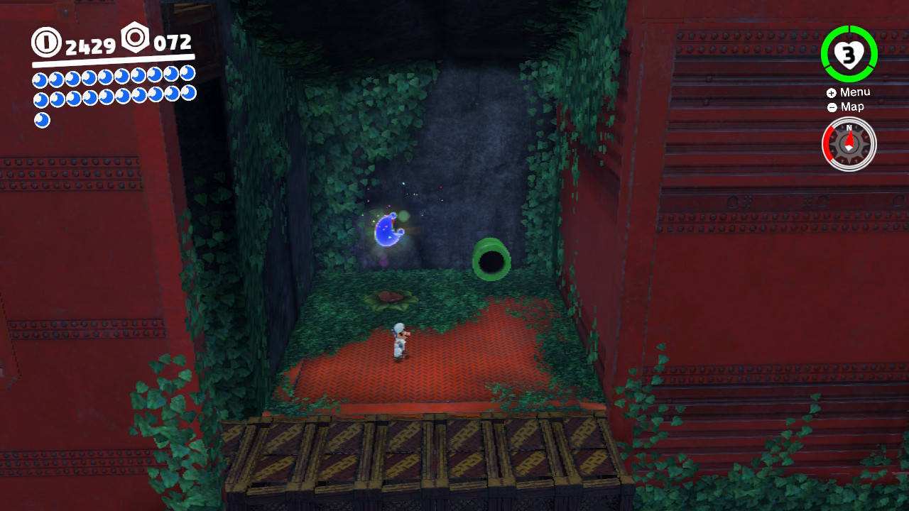 Grab the Glider at the Observation Deck after defeating the boss and fly east of the island to spot spinning platforms. Fly over and complete the obstacle course (or drop from the end of the 2D Mario section) to reach a green pipe, leading to a nut.