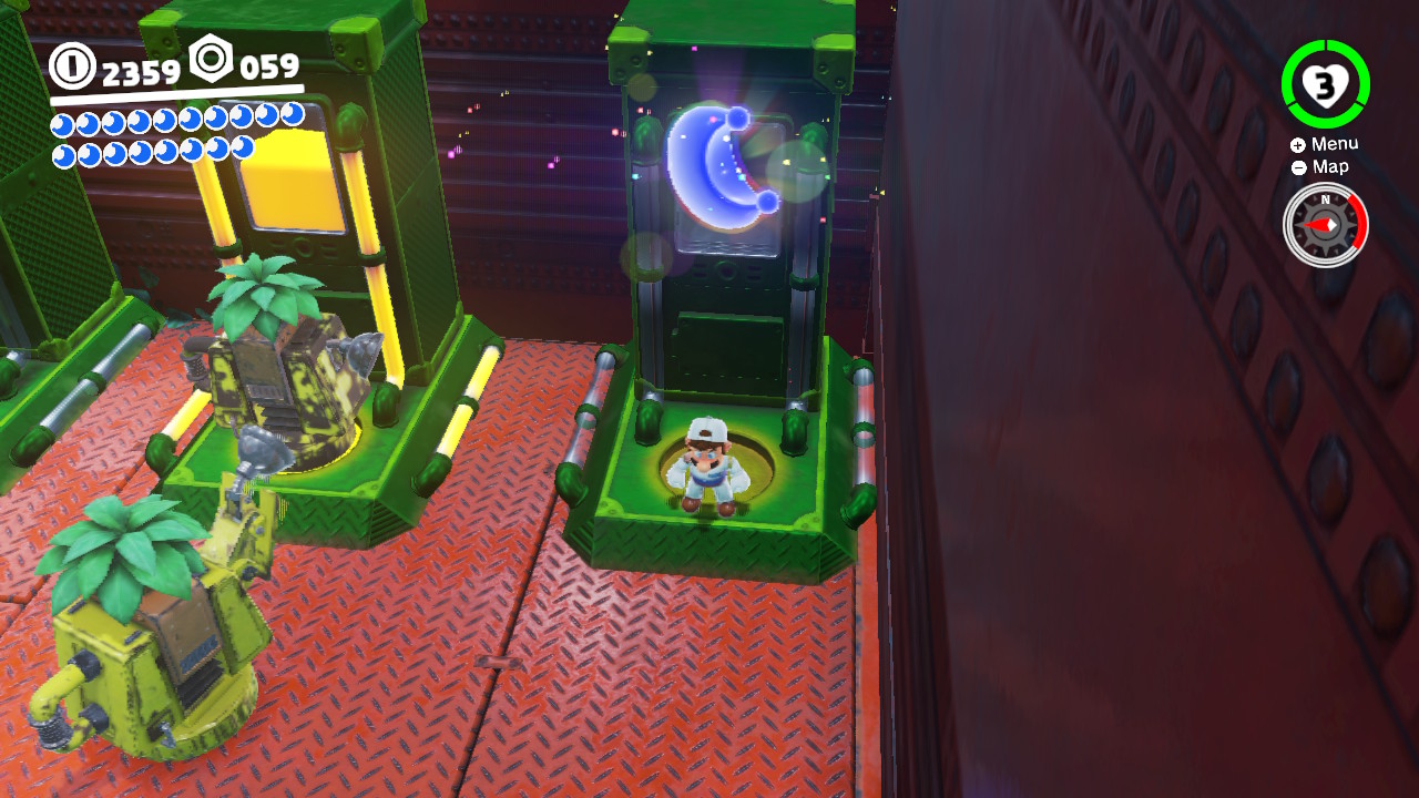 Defeat the massive mechanical boss in the Secret Flower Field to get three Power Moons. To defeat the boss, you’ll need to capture a stretchy enemy and stretch into the glass bottom, then do the same thing to smash all three of its weak points to make him vulnerable again. Avoid the lasers and stretch / jump to escape incoming attacks between phases.