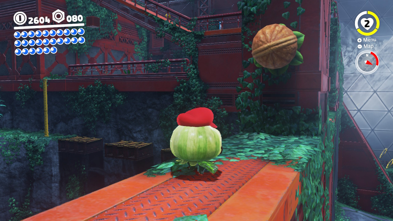 From the Odyssey Landing Area, climb the outer wall to an upper area with stretching creatures. Capture one and enter the stream tunnel and unlock the door. Next, climb the cliffs to the right to reach this nut.