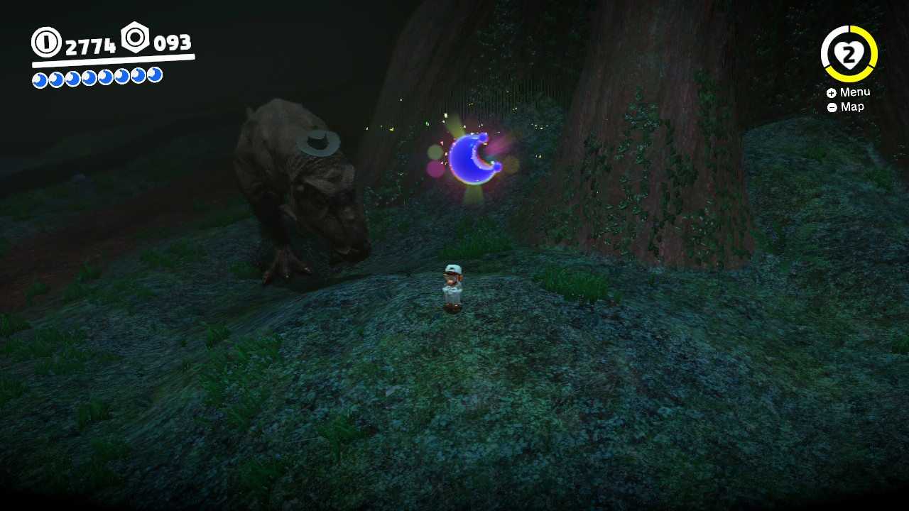 Near the top of the Deep Woods hill, capture the T-Rex and smash a pile of rock blocks to reveal a glowing spot. Ground pound the spot to make this Power Moon appear.