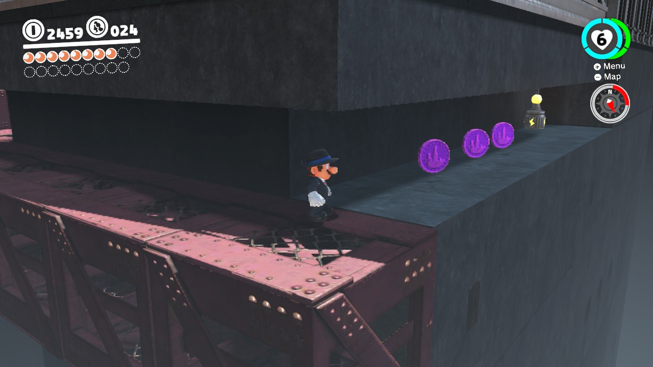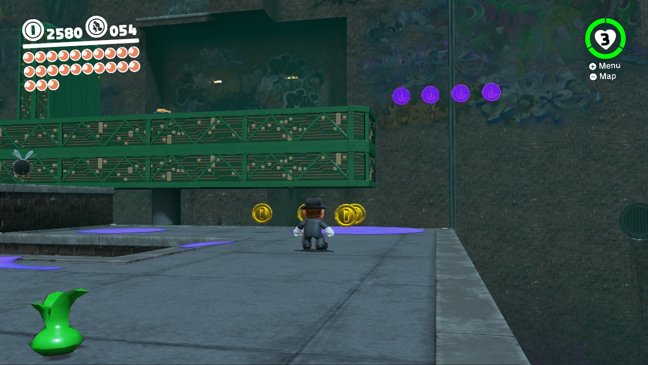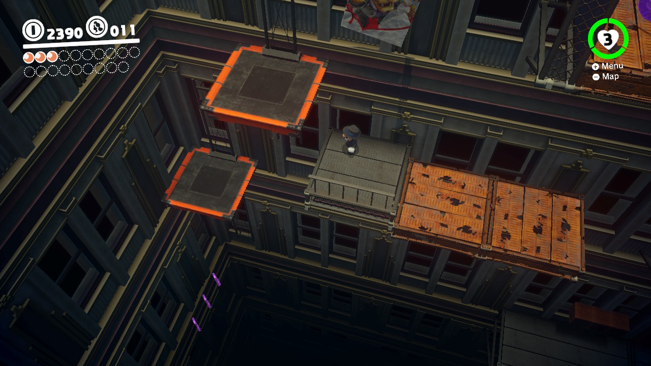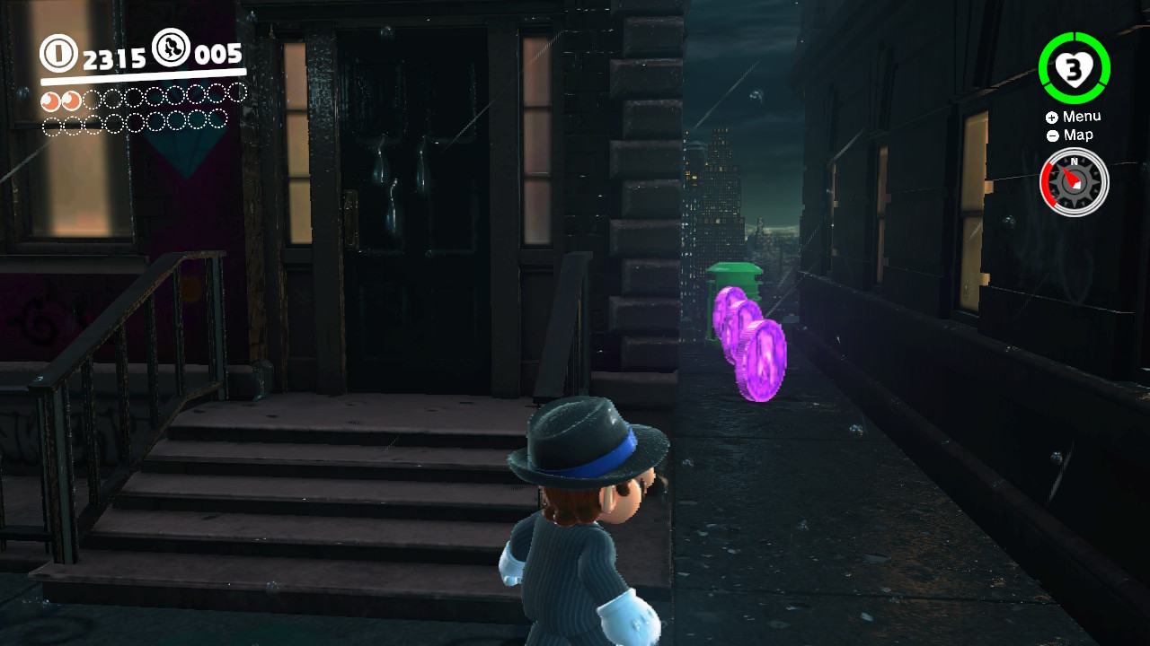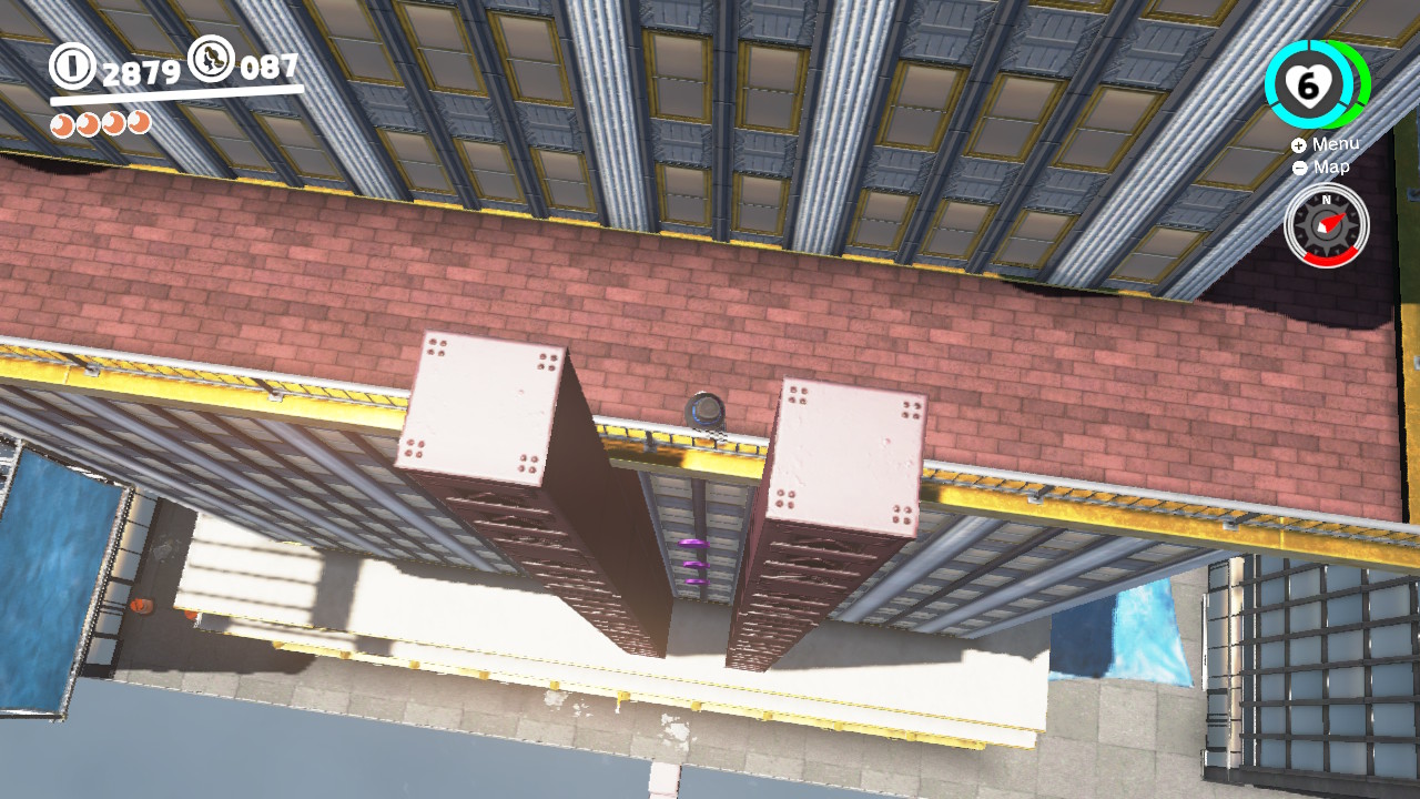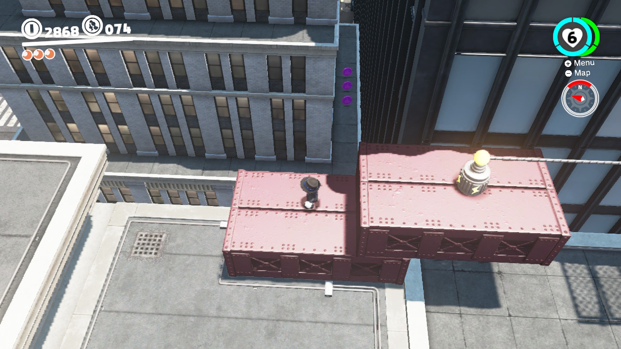 - 3 Coins: On the girders that lead from the Odyssey Landing Zone to the electricity wire that takes Mario into New Donk City proper.