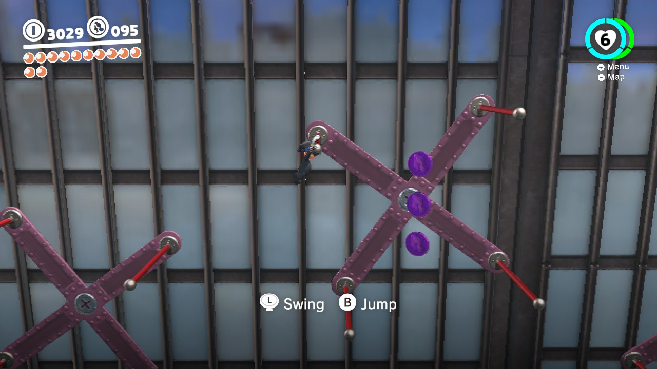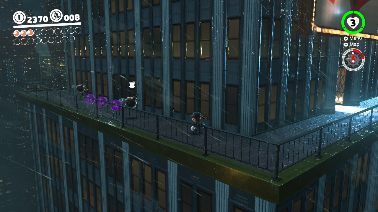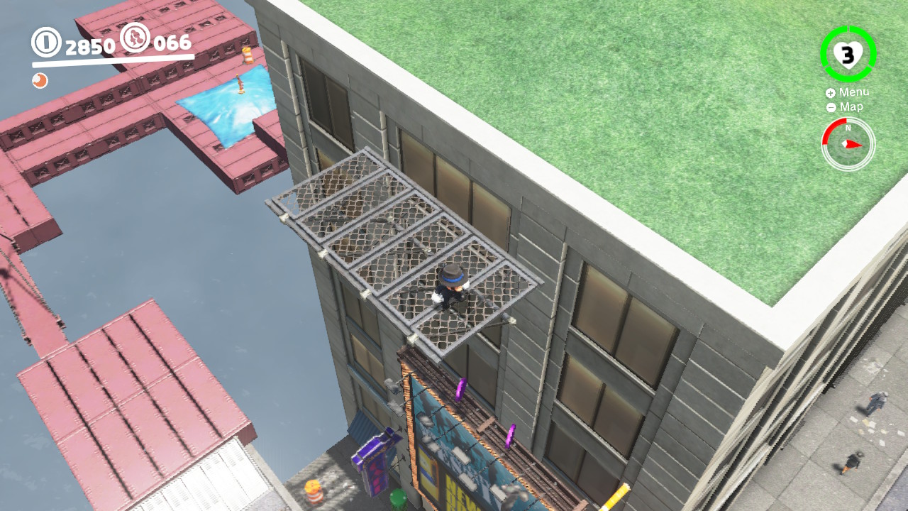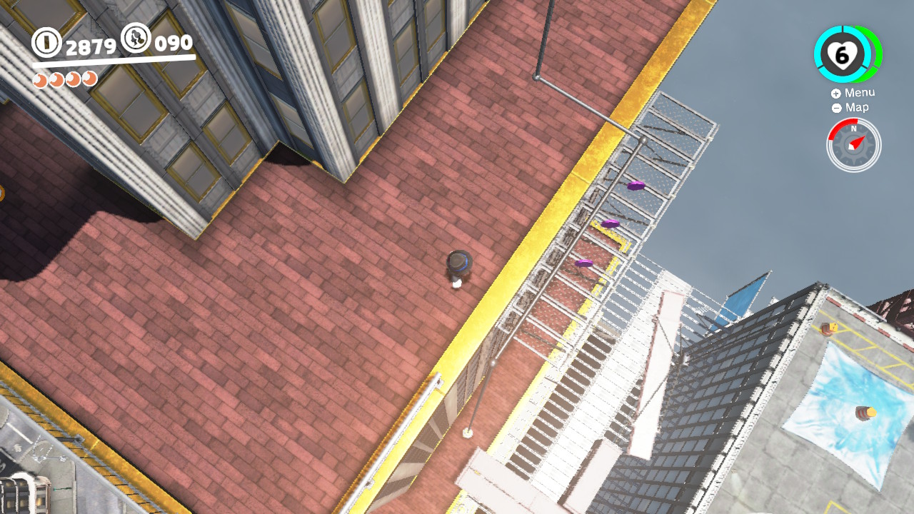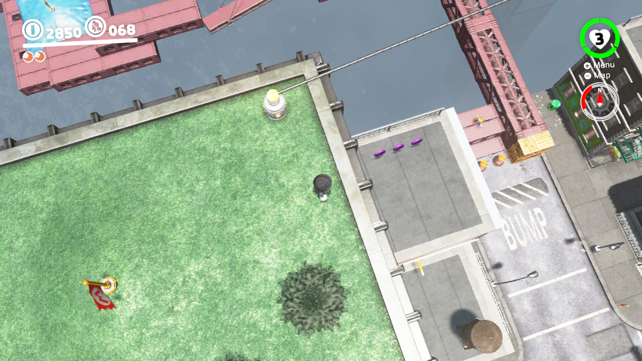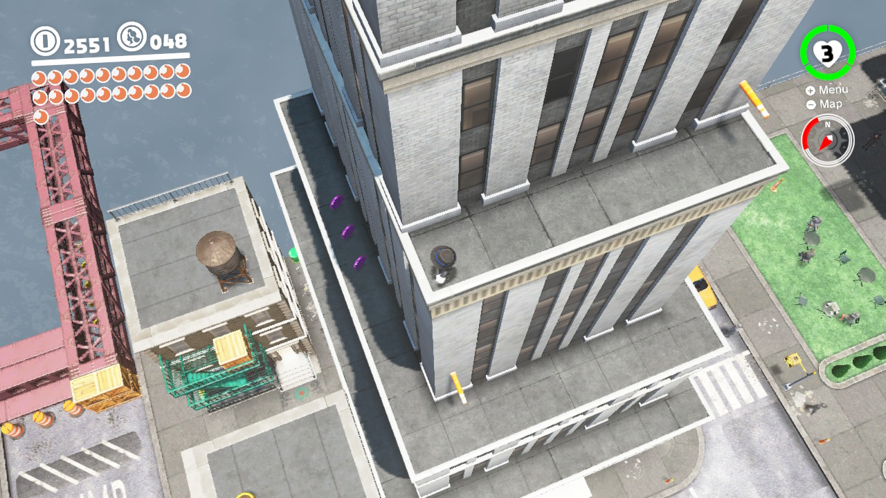 - 3 Coins: On the girders that lead from the Odyssey Landing Zone to the electricity wire that takes Mario into New Donk City proper.