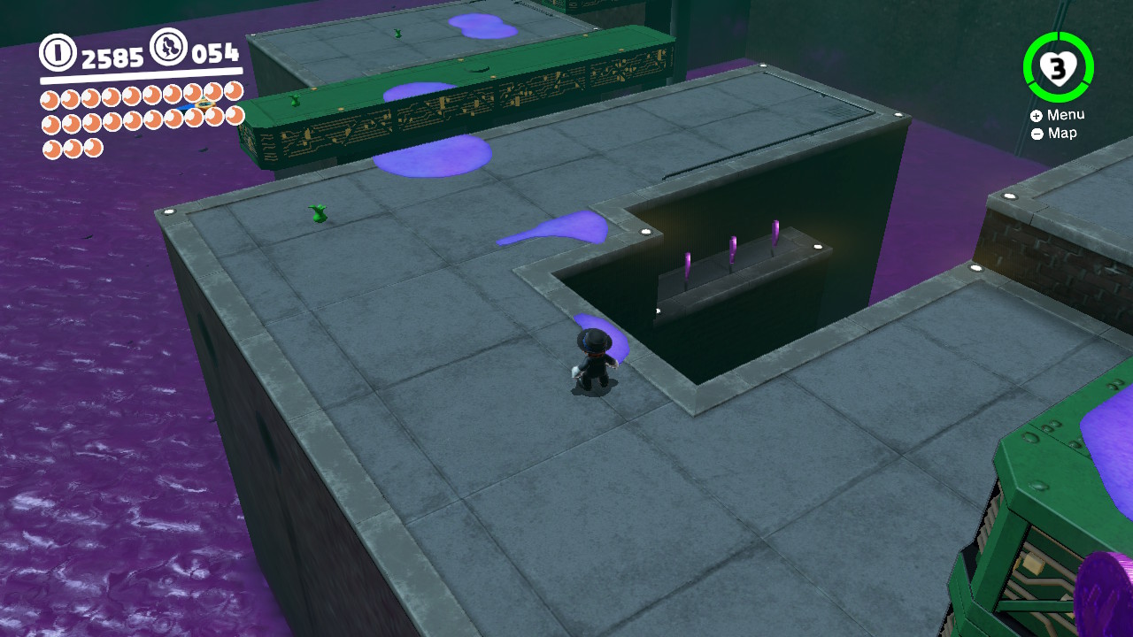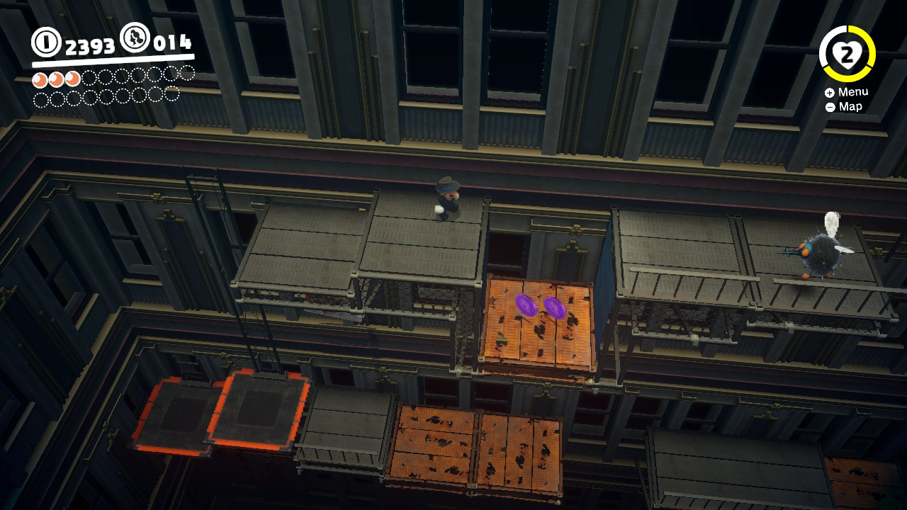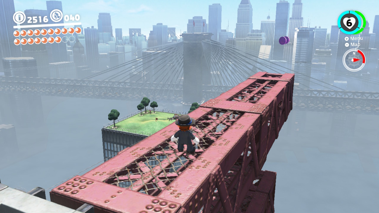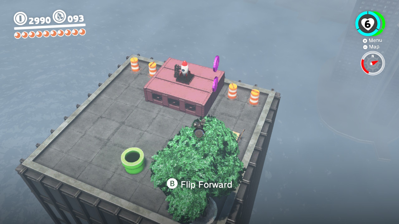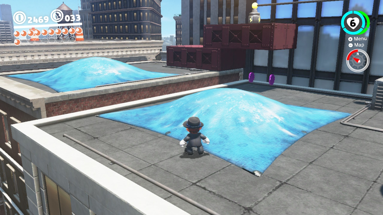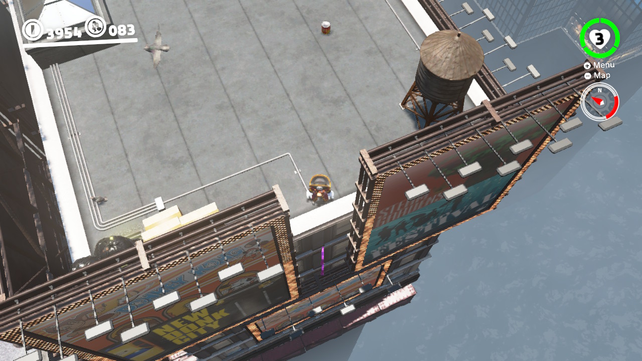 - 3 Coins: On the girders that lead from the Odyssey Landing Zone to the electricity wire that takes Mario into New Donk City proper.
