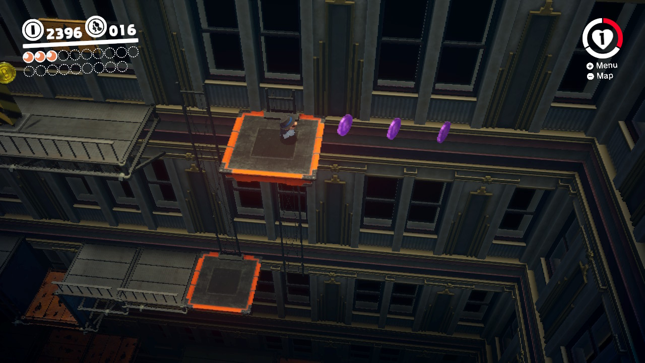 - 3 Coins: Up the third pair of lift platforms in the City Hall Interior, throw Cappy to grab three coins on your right.