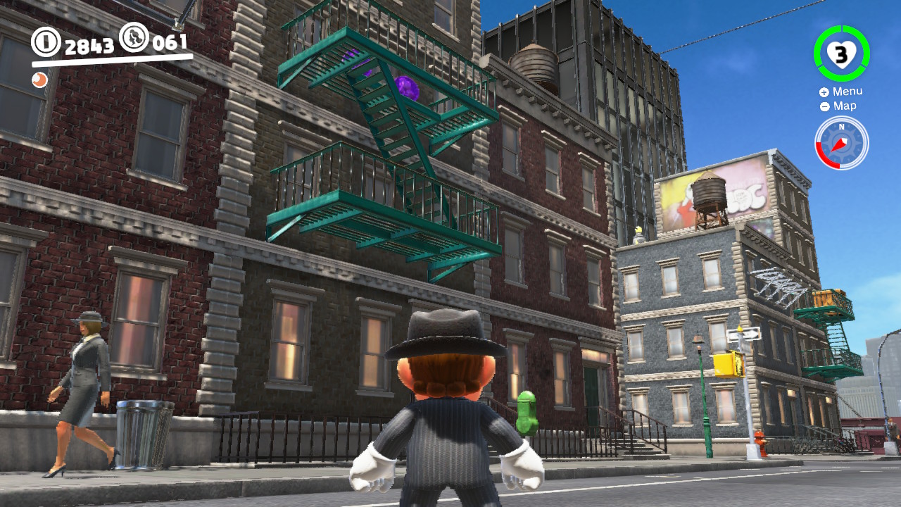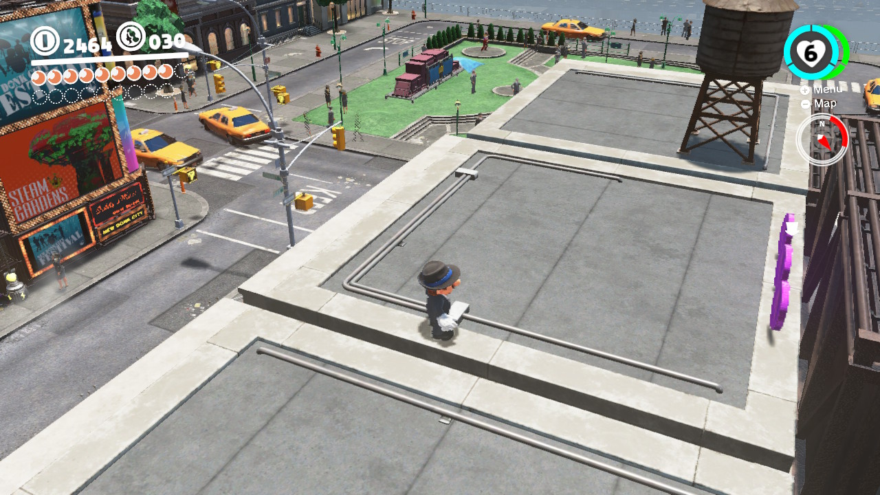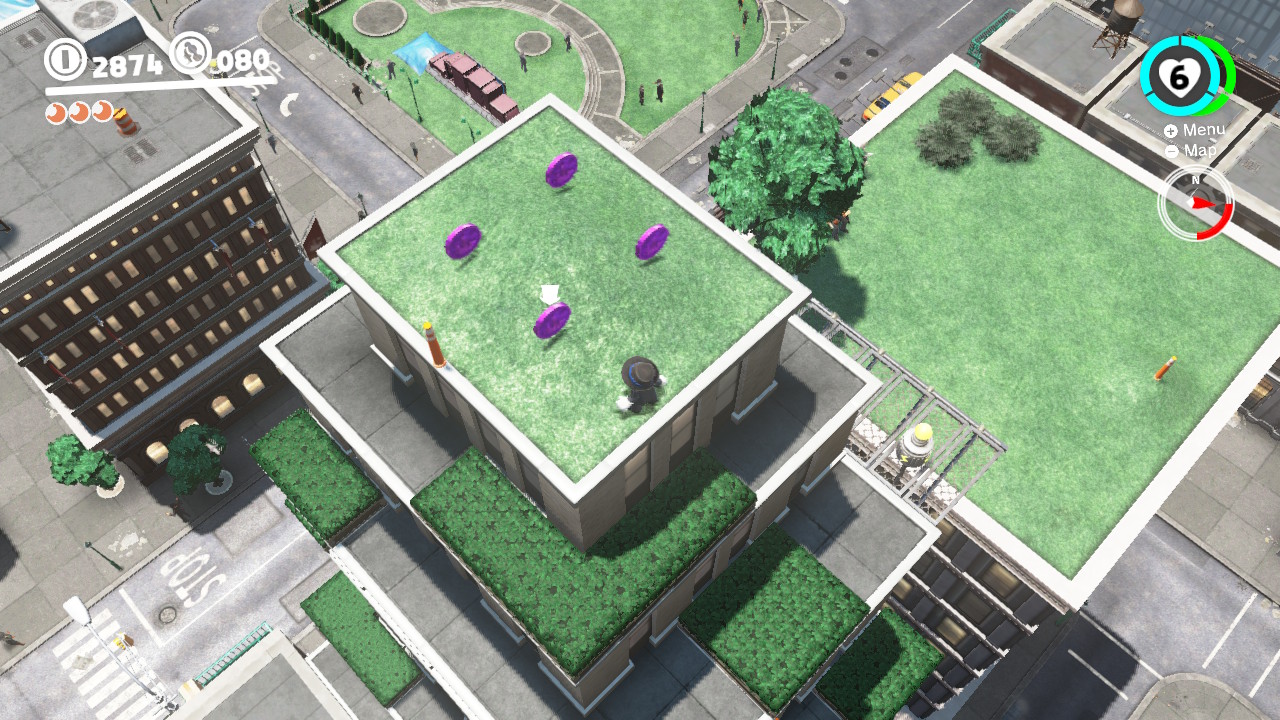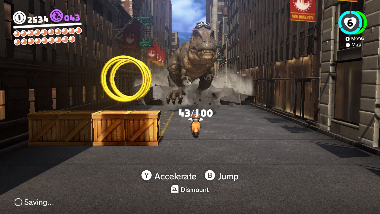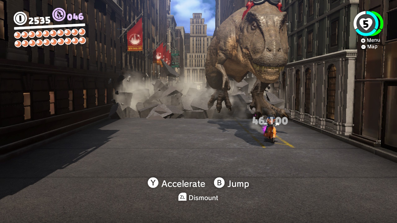 Many of the coins are literally floating high in the sky, and you’ll have to precariously position Mario on ledges to shimmy over and snatch them up. There are a variety of optional activities you can experience, too — like a thrilling scooter escape versus an angry T-Rex! You’ll have to replay that one a few times to grab all the purple coins. Don’t forget to search every inch of the City Hall interior, too!