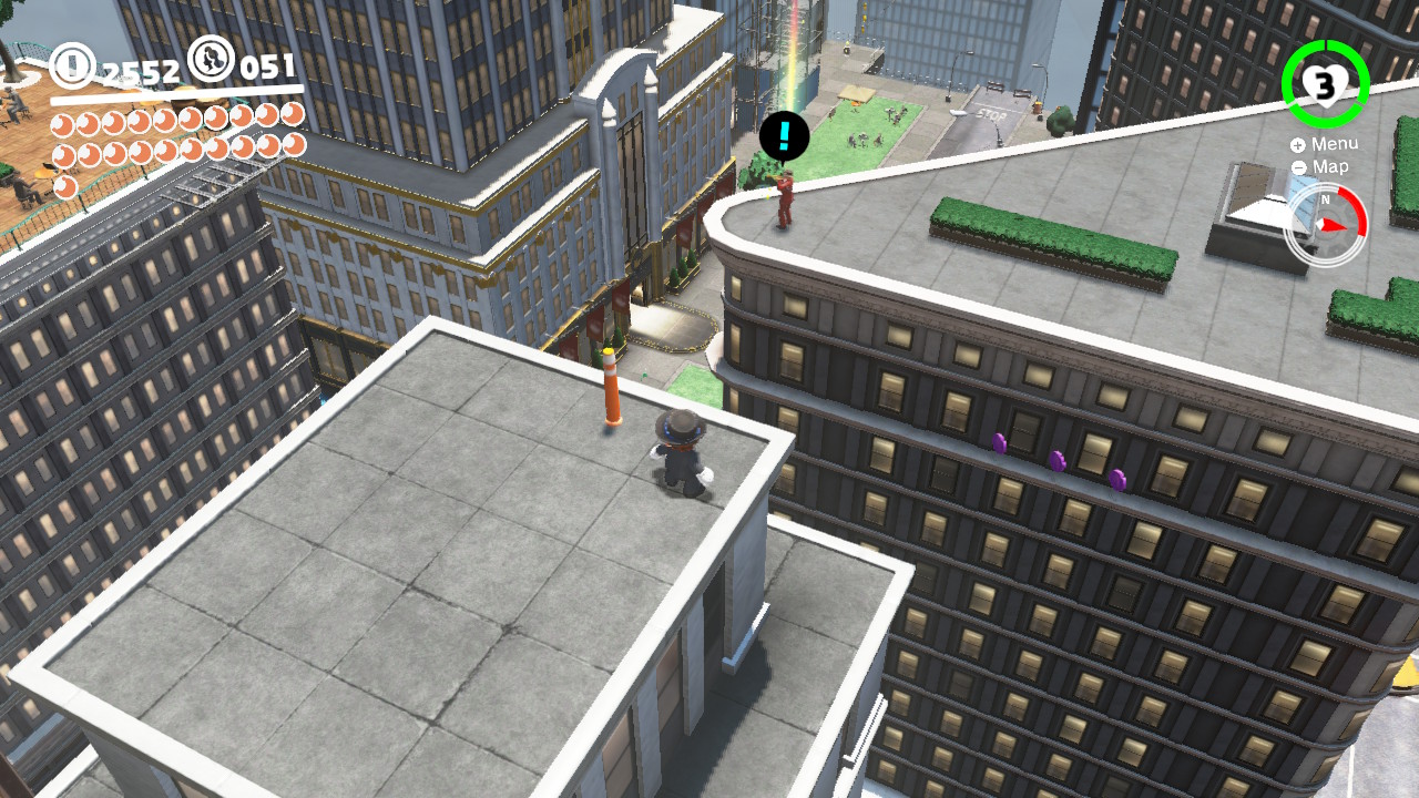 - 3 Coins: At the New Donk City Hall Rooftop flag, wall-jump up the shaft to reach three coins, visible from the boss arena at the top of the building.
