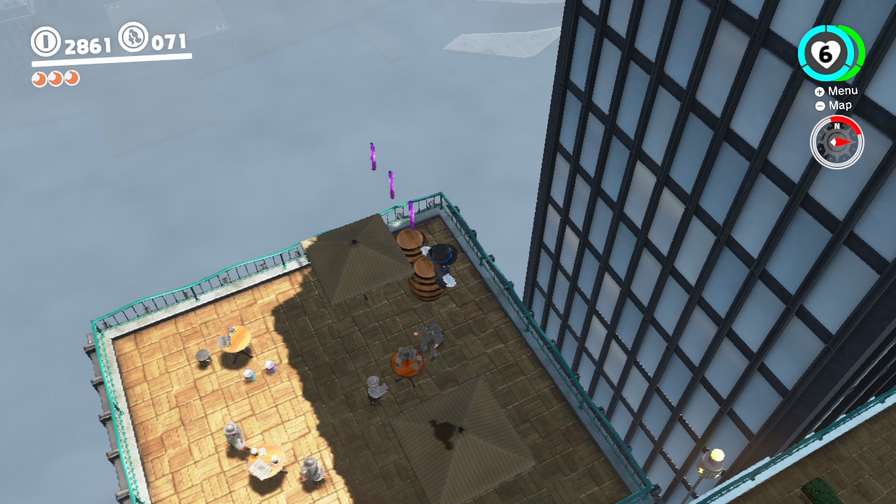 - 3 Coins: Reach the rooftop north of the Outdoor Cafe flag, then jump on the umbrellas.