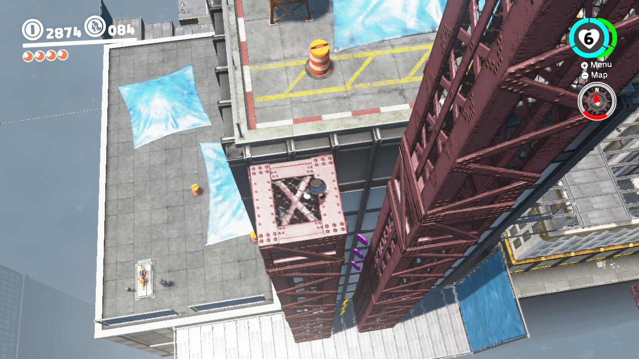 - 2 Coins: Found above the “Girder Sandwich” Power Moon. From the City Hall Plaza, ride the electricity wire up to the east building rooftop and run along the girders sticking out east.