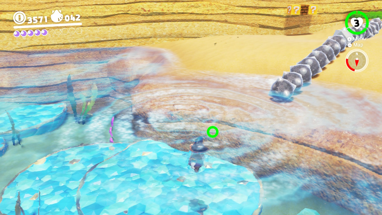 - 3 Coins: Further east, you’ll find a beach with rolling spikes. Under the water next to the shore here, there are three more coins.
