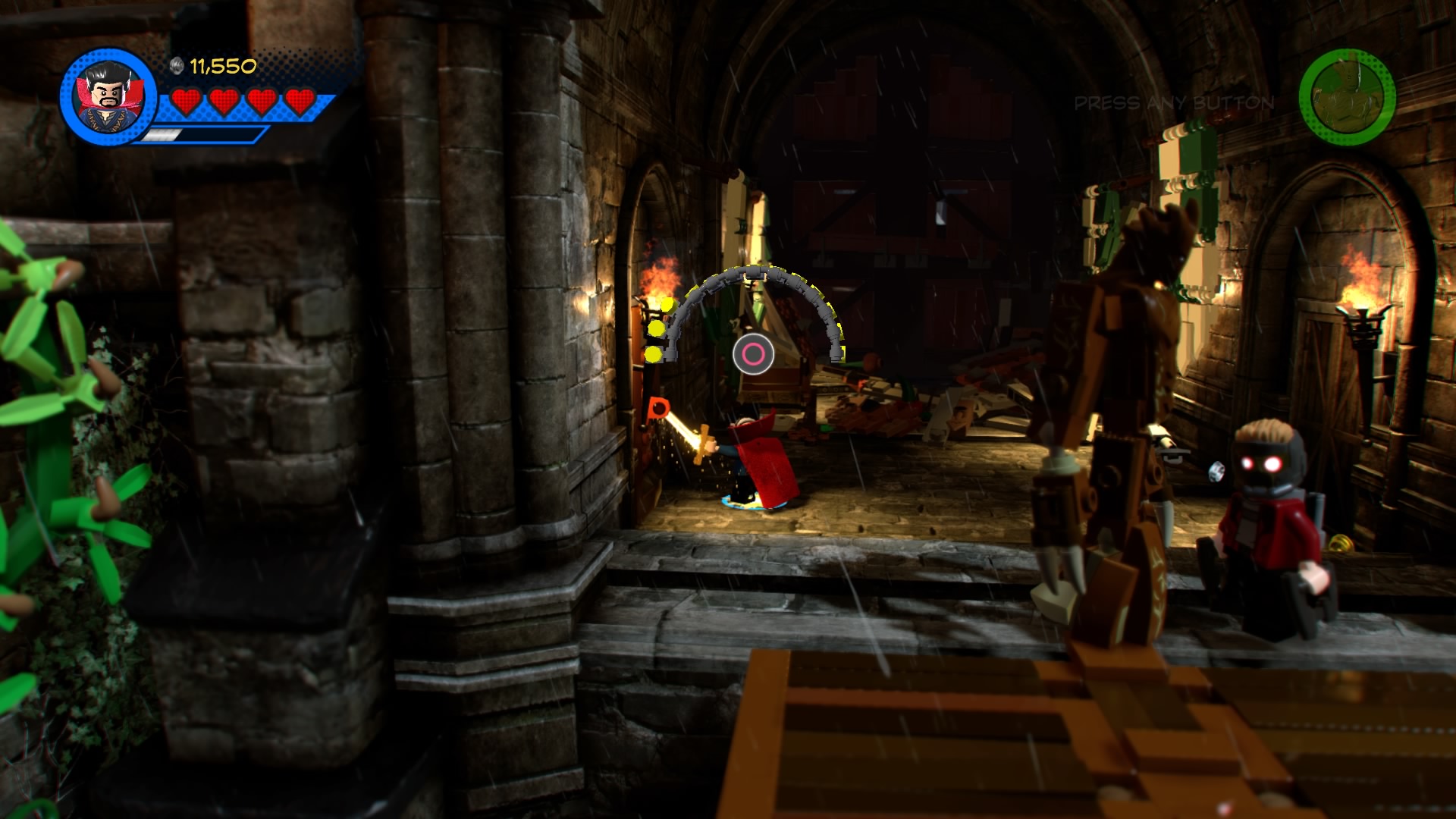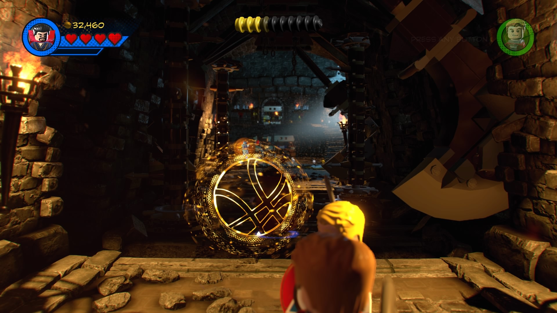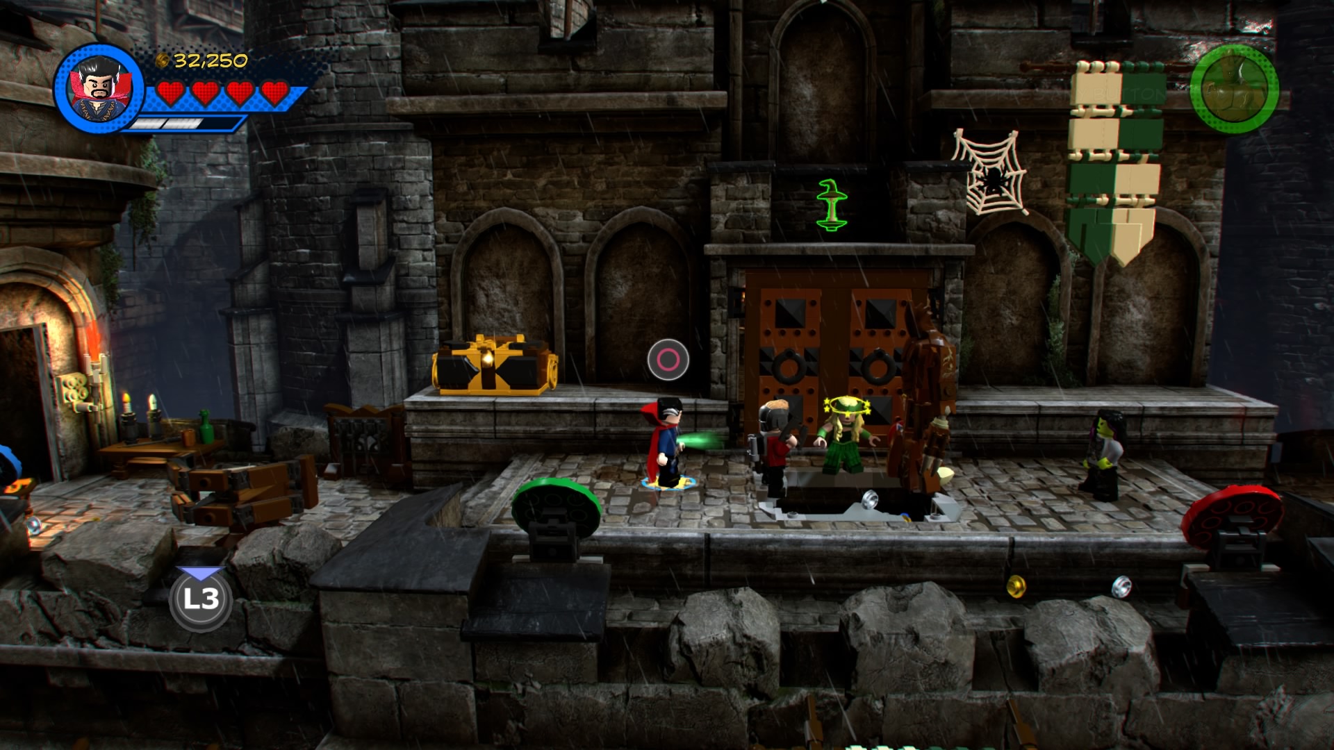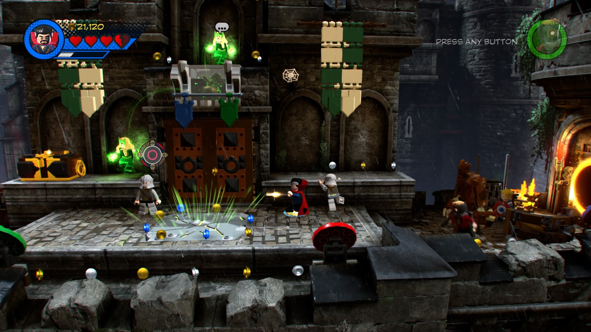 To get inside the castle, swap to Doctor Strange and interact with the glowing green lift to the left of the gate. He can interact with time LEGO objects – reverse time by spinning the stick. Spin the stick until the lift drops to the ground, then enter with your biggest hero – Groot. When they’re inside, swap to Doctor Strange again and use your time powers to raise the lift all the way to the top. Interact with the spinner pad and roll right to slowly open the main gate.