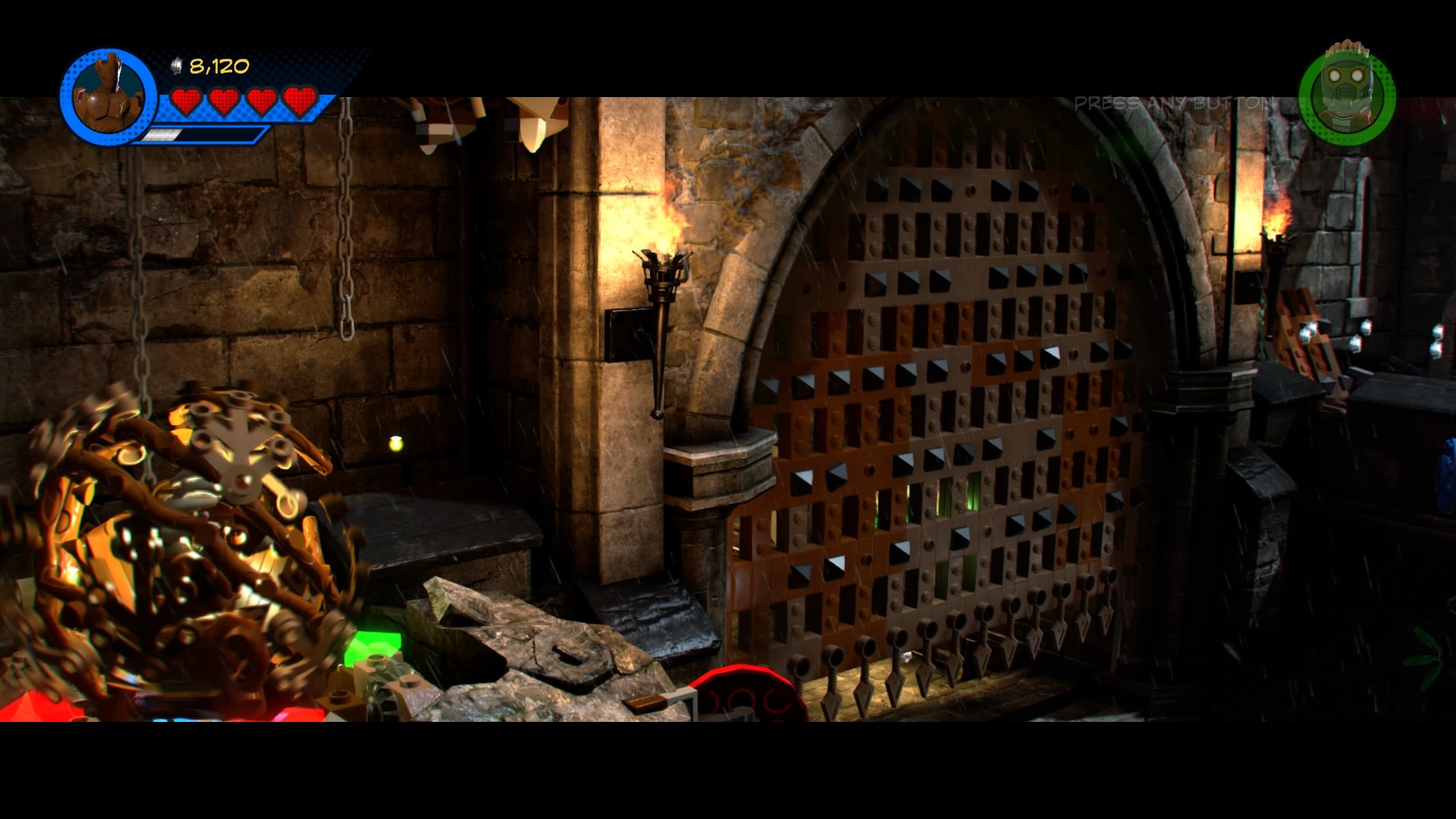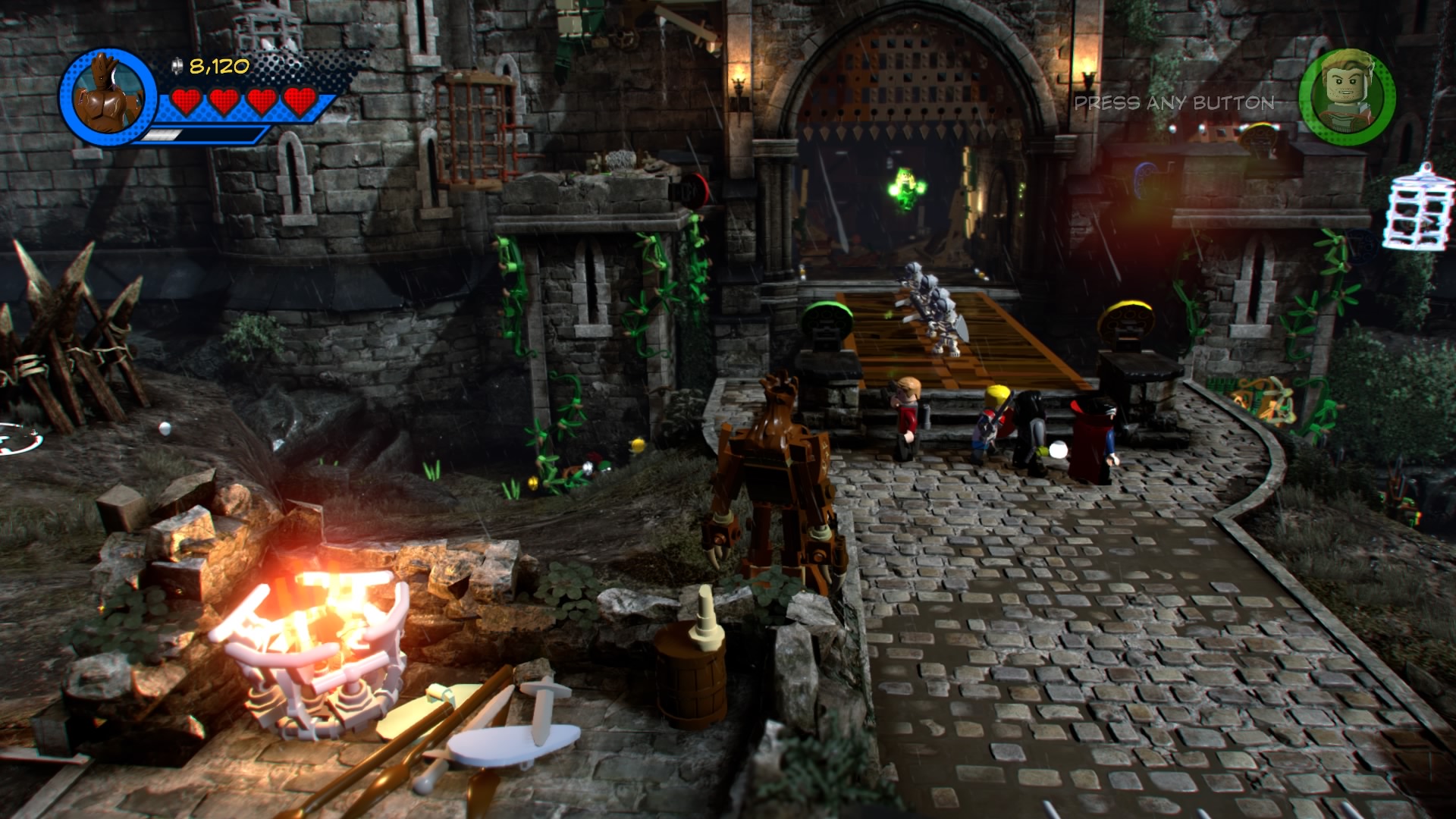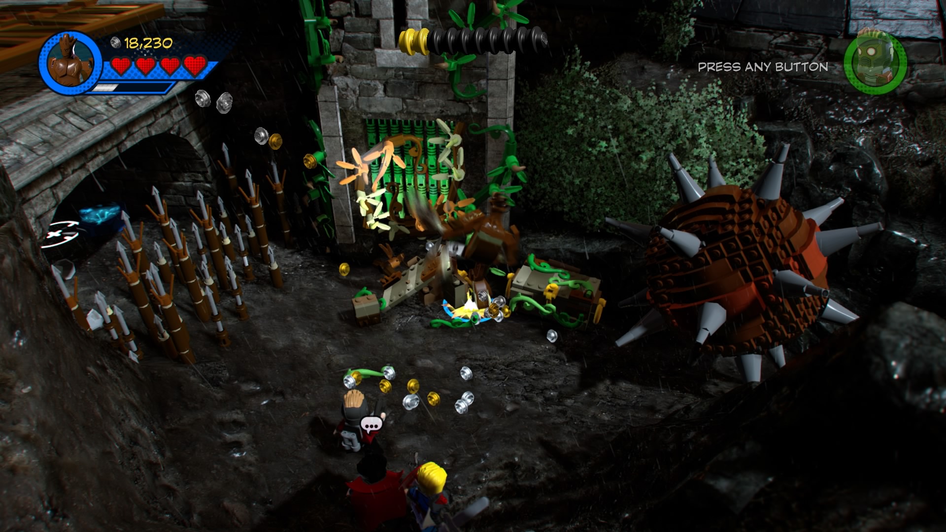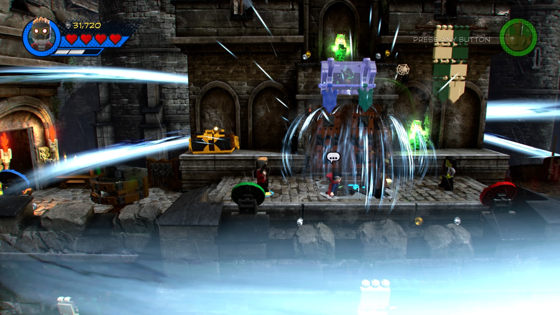 To get inside the castle, swap to Doctor Strange and interact with the glowing green lift to the left of the gate. He can interact with time LEGO objects – reverse time by spinning the stick. Spin the stick until the lift drops to the ground, then enter with your biggest hero – Groot. When they’re inside, swap to Doctor Strange again and use your time powers to raise the lift all the way to the top. Interact with the spinner pad and roll right to slowly open the main gate.