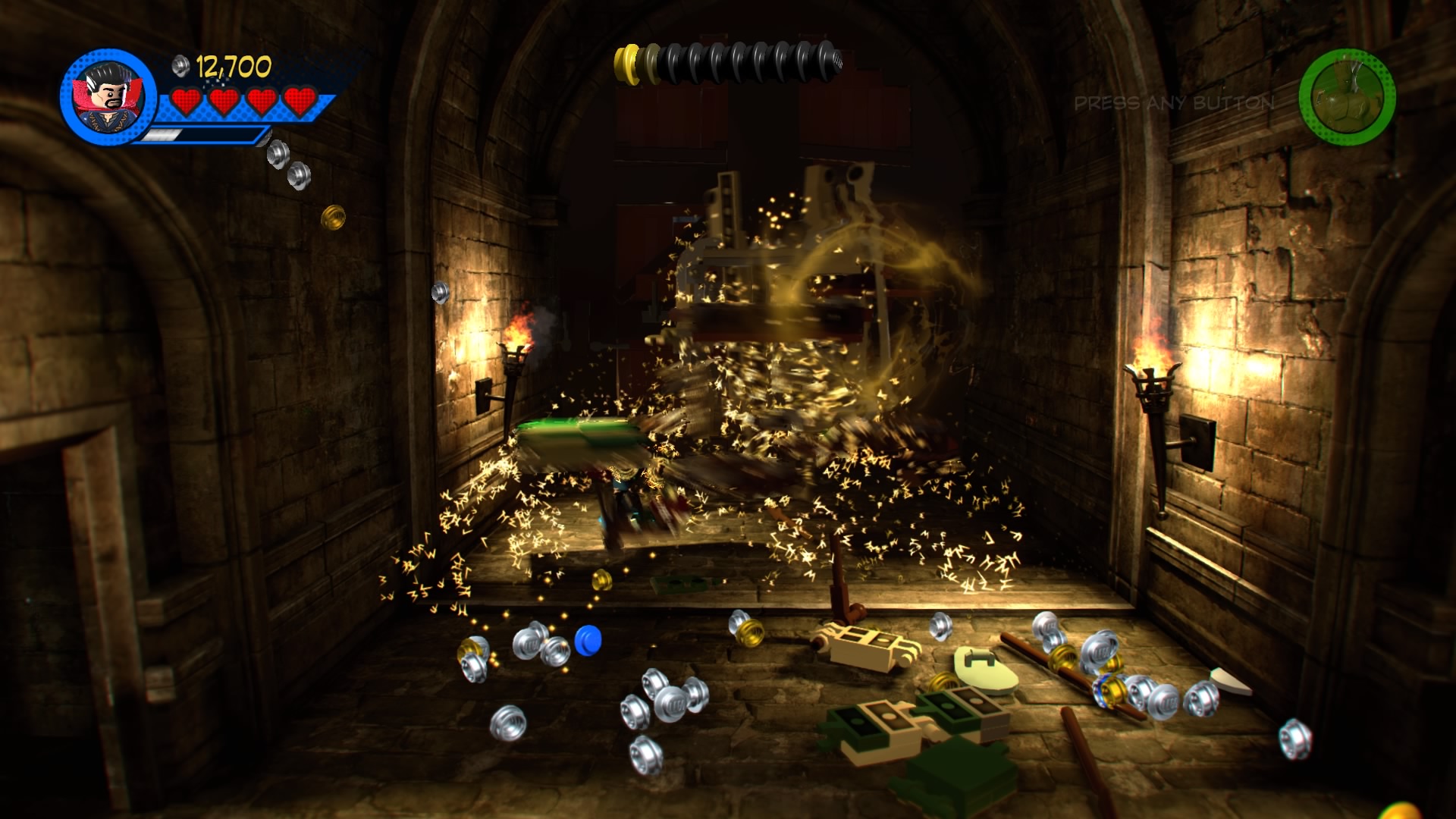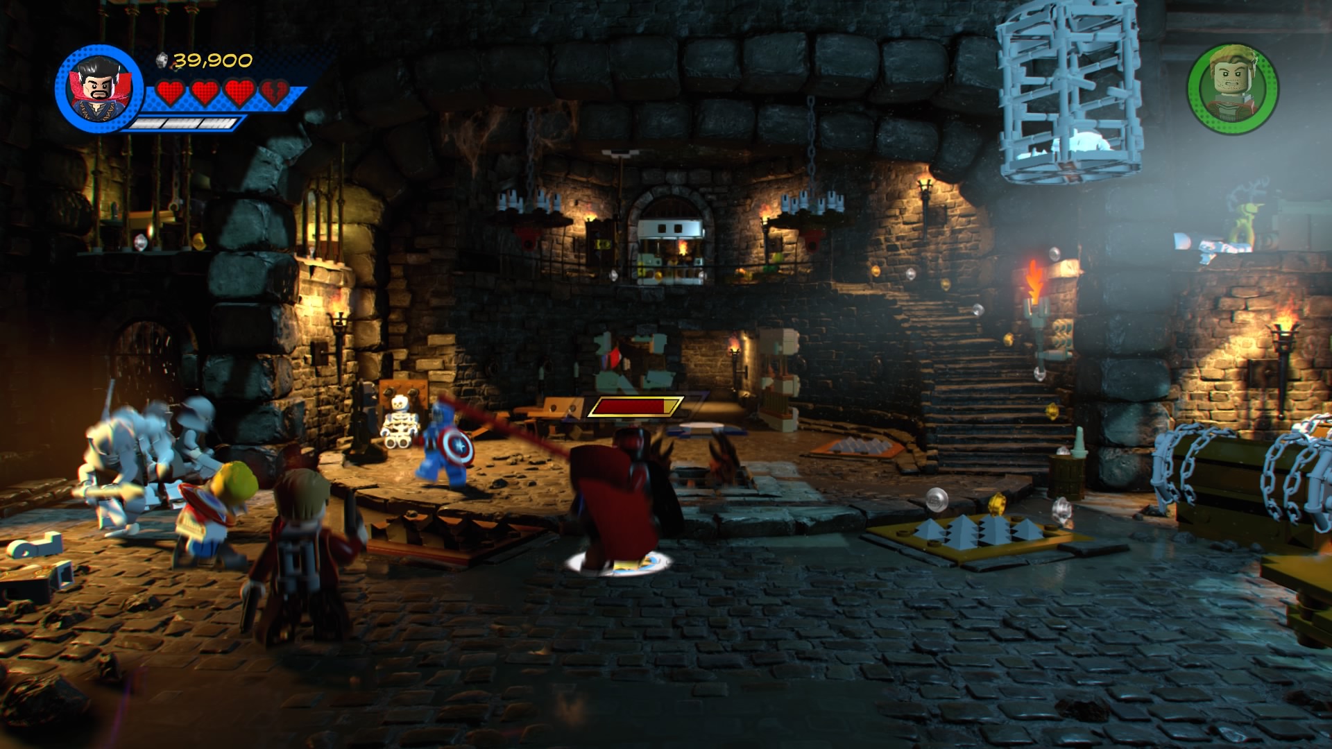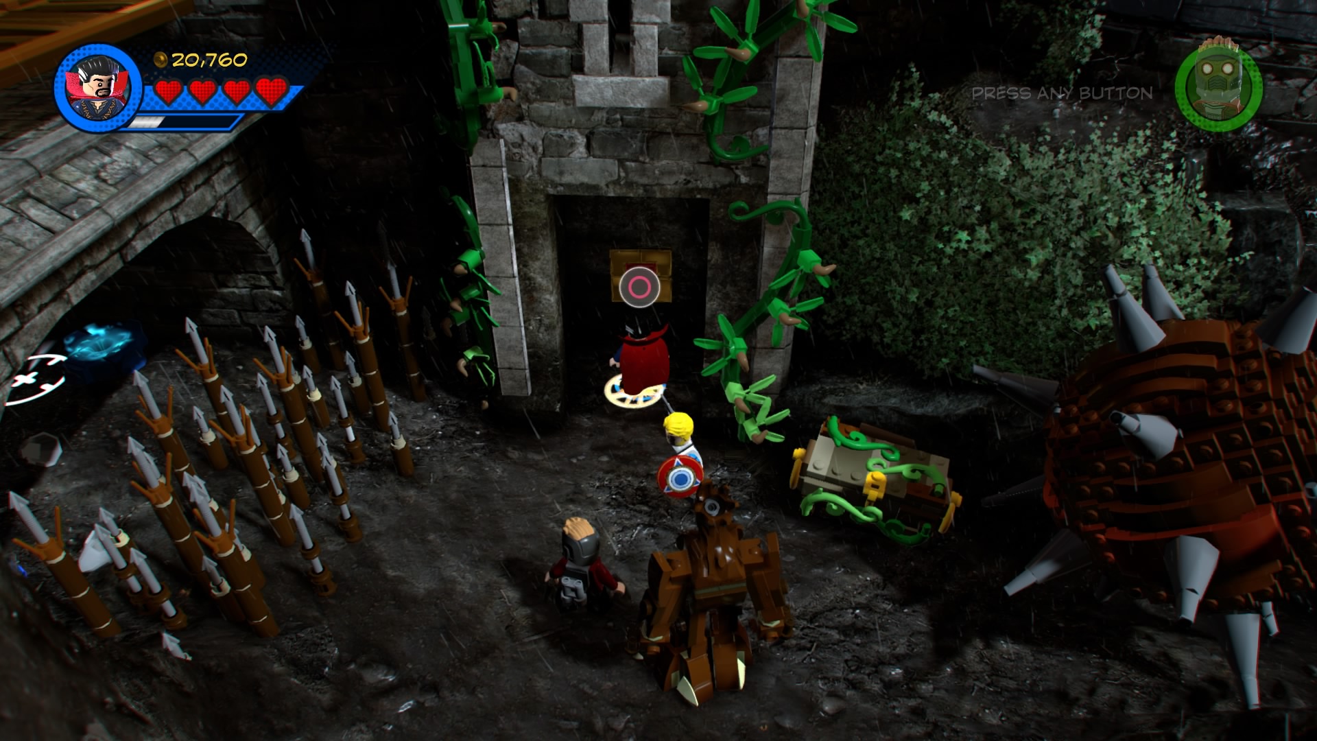Go down there and slice away the green vines (Captain Avalon) and then interact with the magical wall to open a portal with Doctor Strange. Up above, you’ll need to get the magical apple to take away Enchantress’ power. With Team Captain America, smash the floor with Groot under Enchantress’ perch and throw a gravity mine to destroy the metal LEGO object blocking the apple. Use Doctor Strange’s time powers on the apple to make it disappear, then smack a de-powered Enchantress once to defeat her completely. After that, the team will delve into the Dark Knight’s dungeon of doom!
