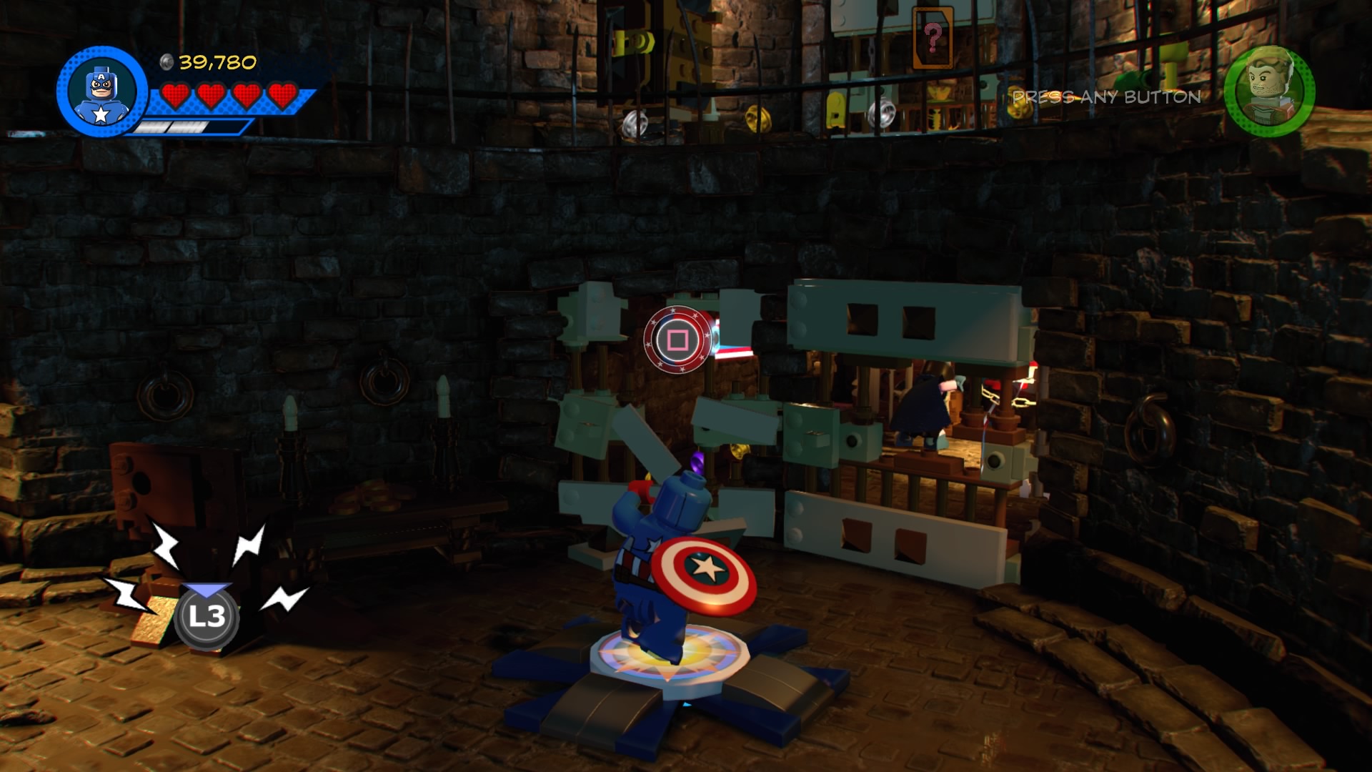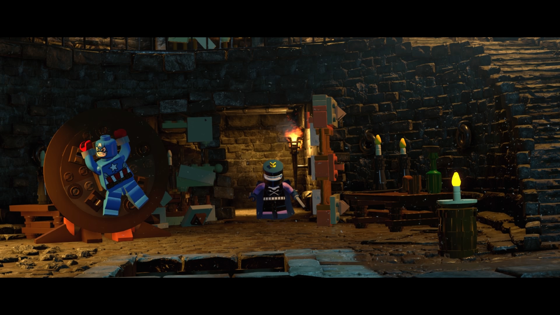 Down in the dungeon, you’ll need Doctor Strange again. He can stop the deadly traps down the first hallway with his magic. Deal with the evil knights ahead, then save Captain America from the wheel using Doctor Strange’s magic once again. With Captain America, build the hopping bricks and use the Cap Shield Bad, then target the red bumper to hit the Cap Shield Slot and unlock the door to the Dark Knight.