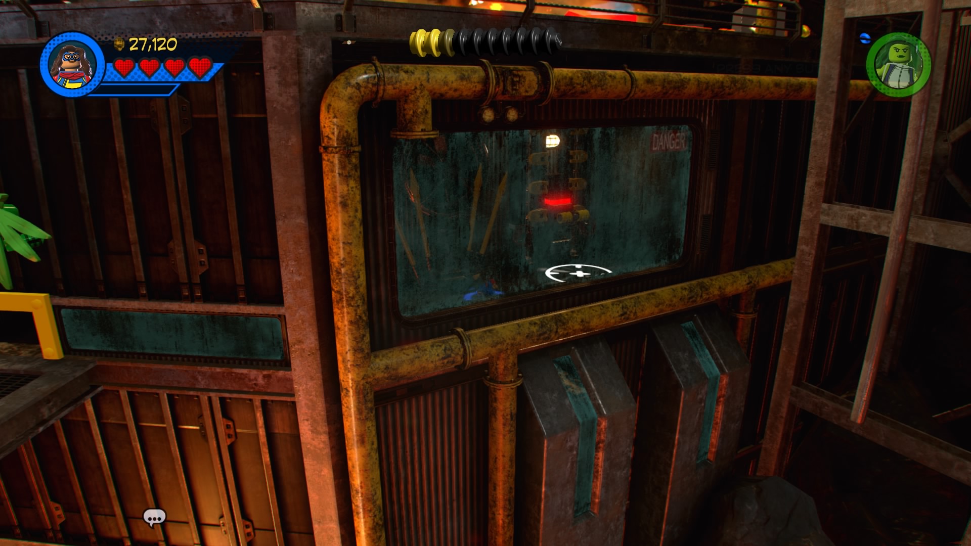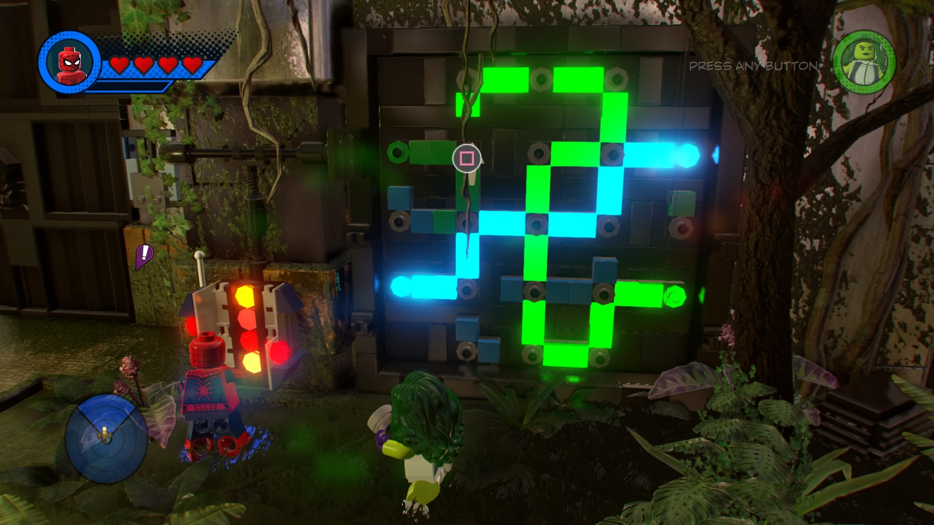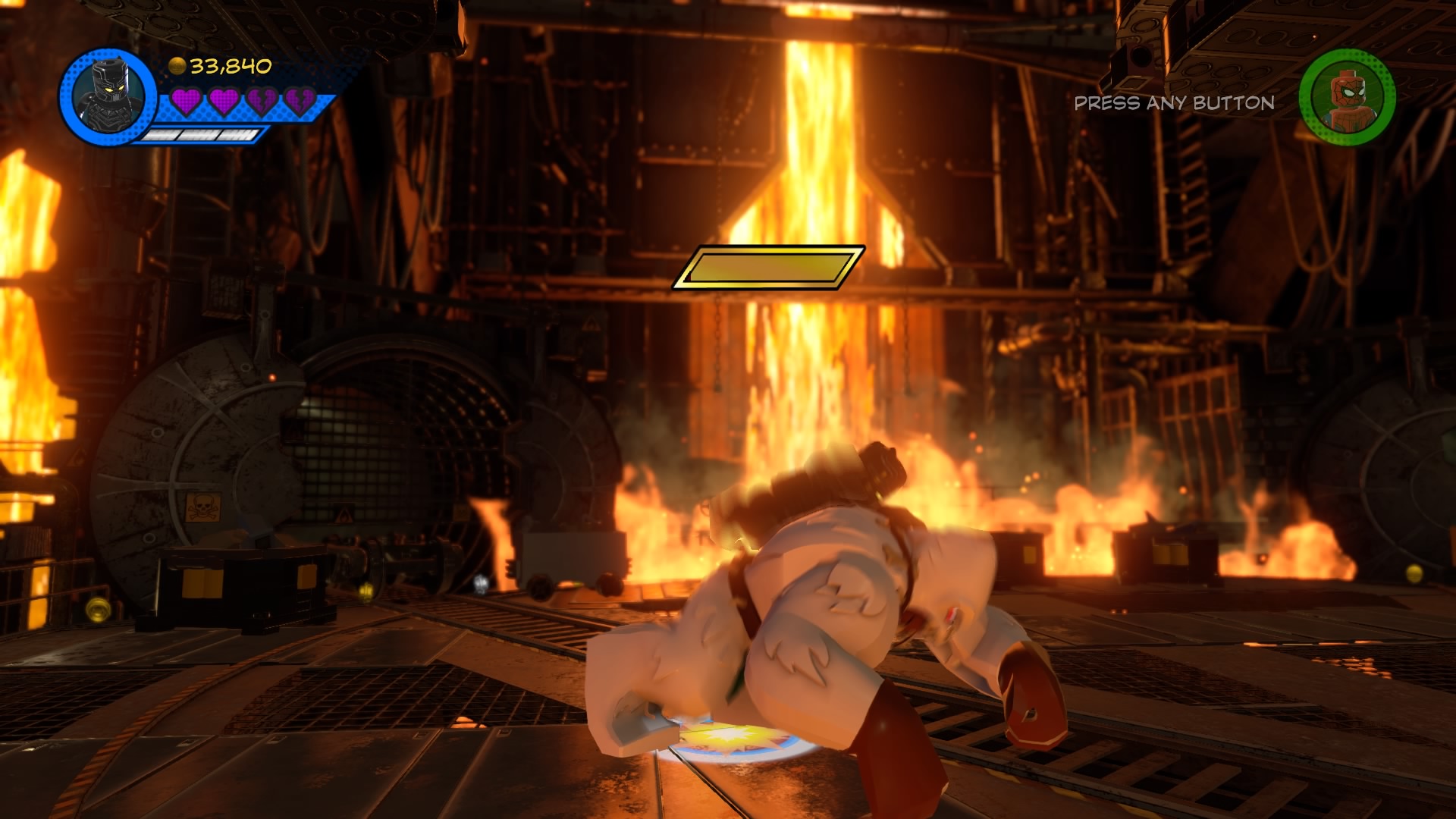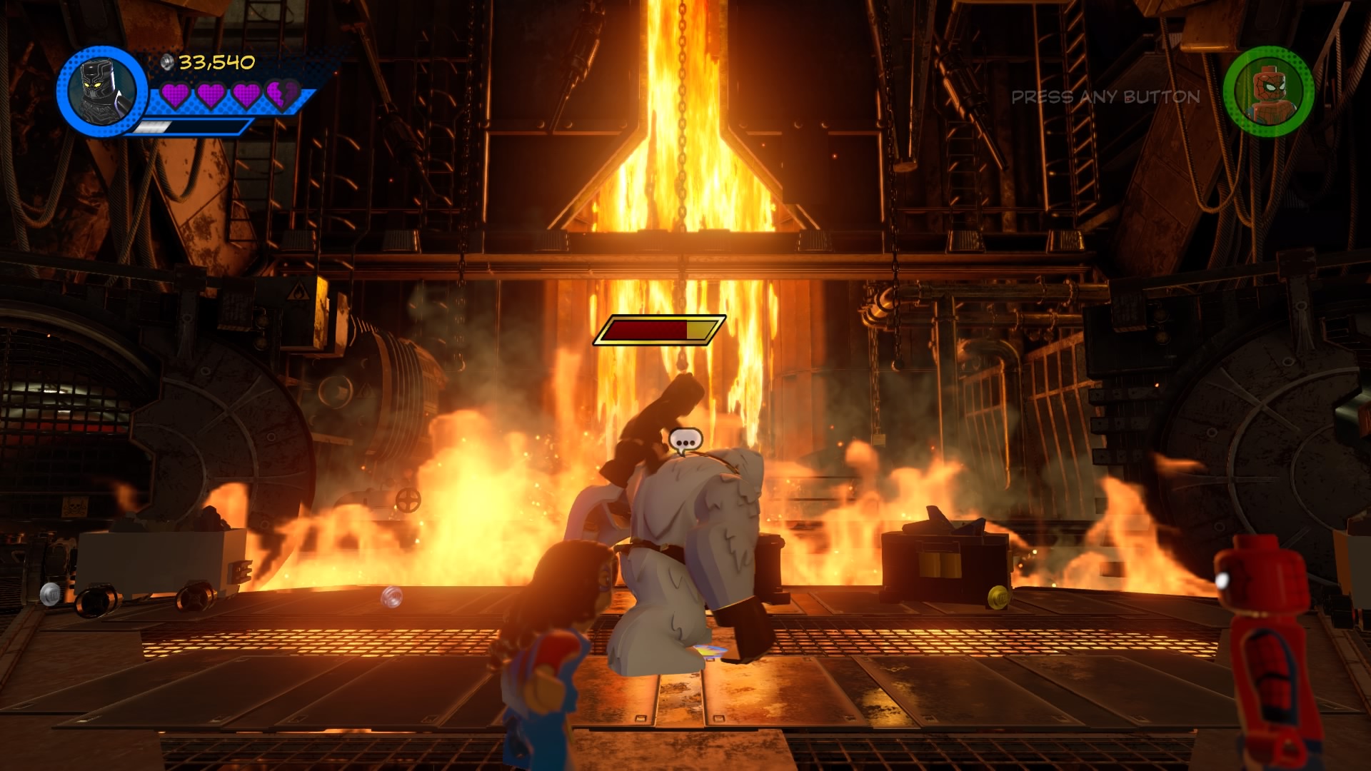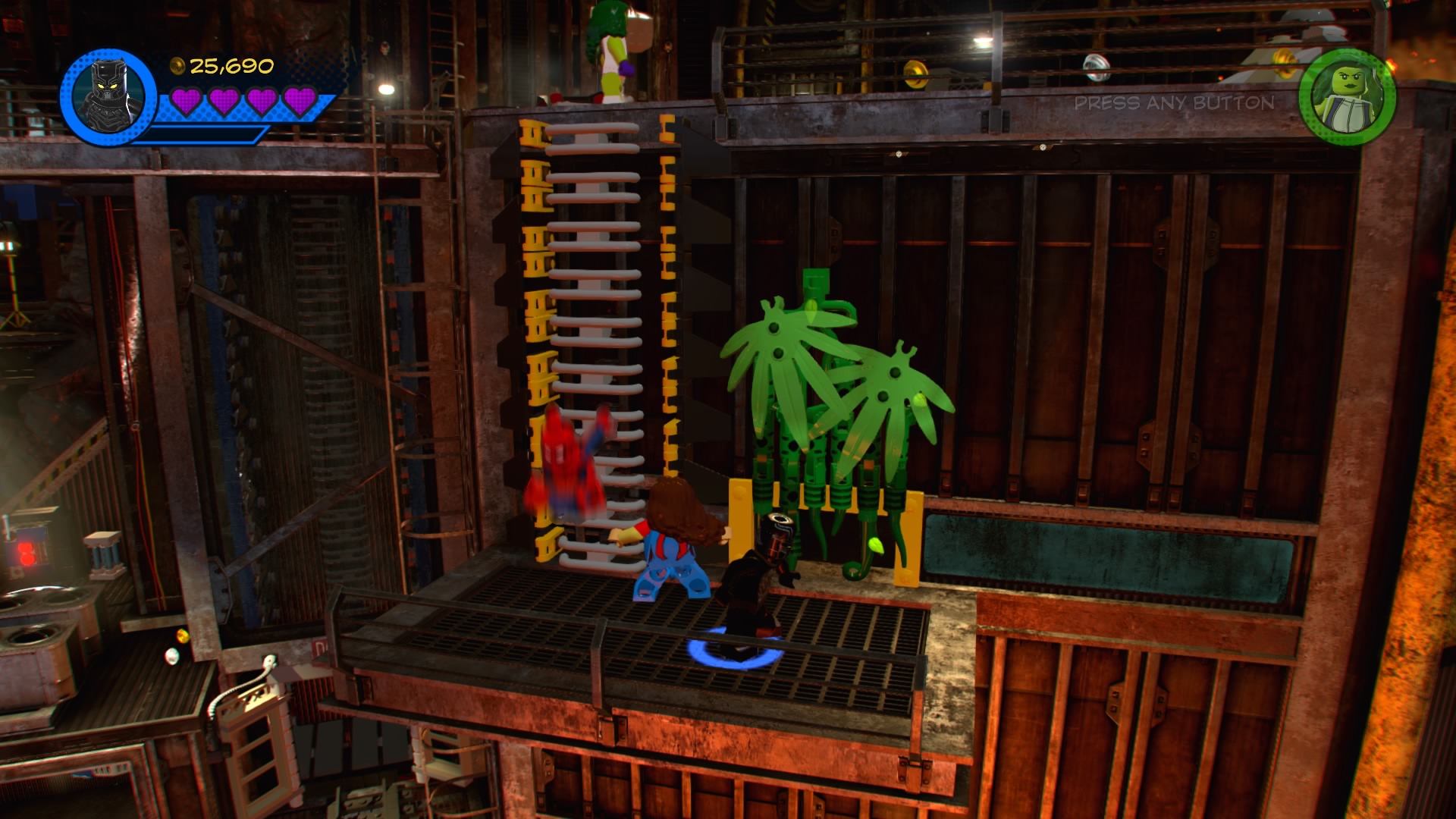 Climb up to the top where gangs of goons are protecting the exit door with flamethrowers! Ignore them for now, and look for the glowing target-sign on the ledge. Hit it to unveil a ladder, and cut through the vines with Black Panther. Squeeze into the narrow space with Mr. Marvel (she can shrink, remember?) and flip the switch in the booth below the molten lava.