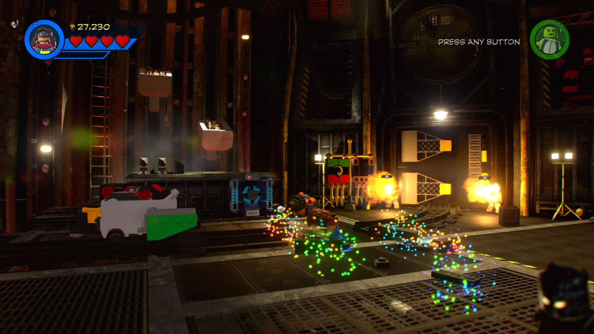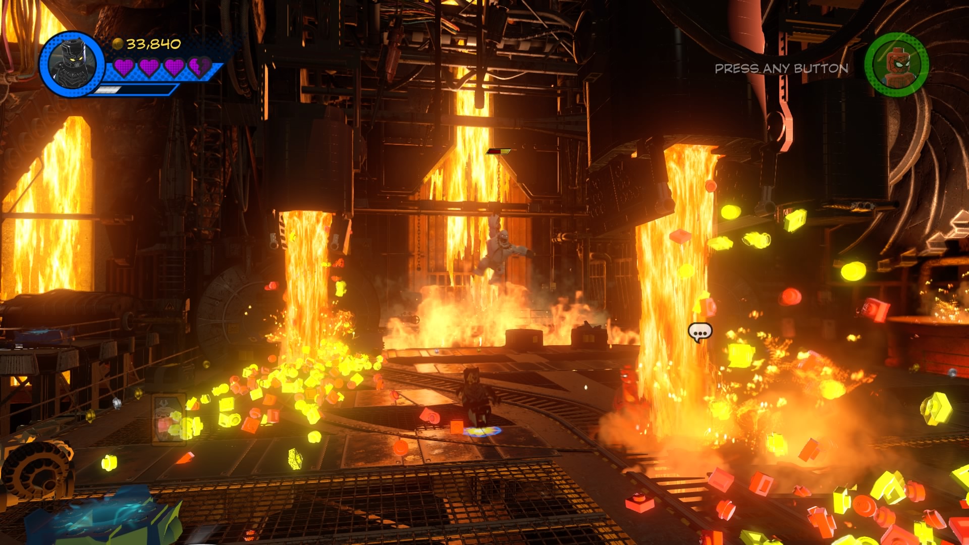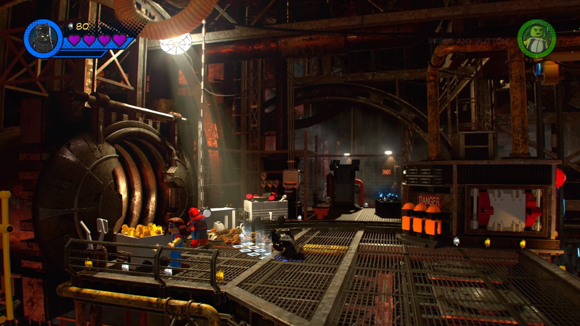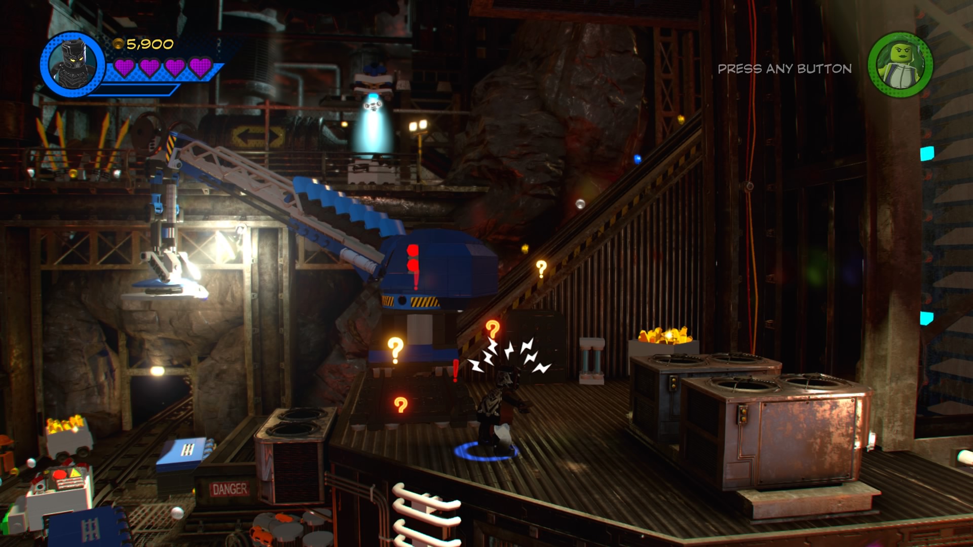 At the start of the stage, Black Panther will join your squad. Klaw, the villain of this level, is busy stealing a giant supply of vibranium. Start by tracking the “?” trail with Black Panther until you dig up a pile of hopping bricks. Construct and push the green LEGO cart. Now you just have to get on the other side of the room. Build the second pile of hopping bricks and jump on the lever to stop the platforms, making a path for you to jump across.
