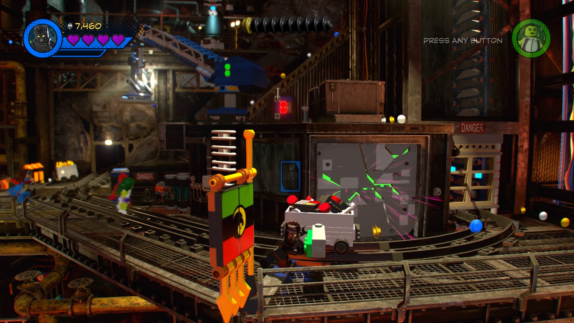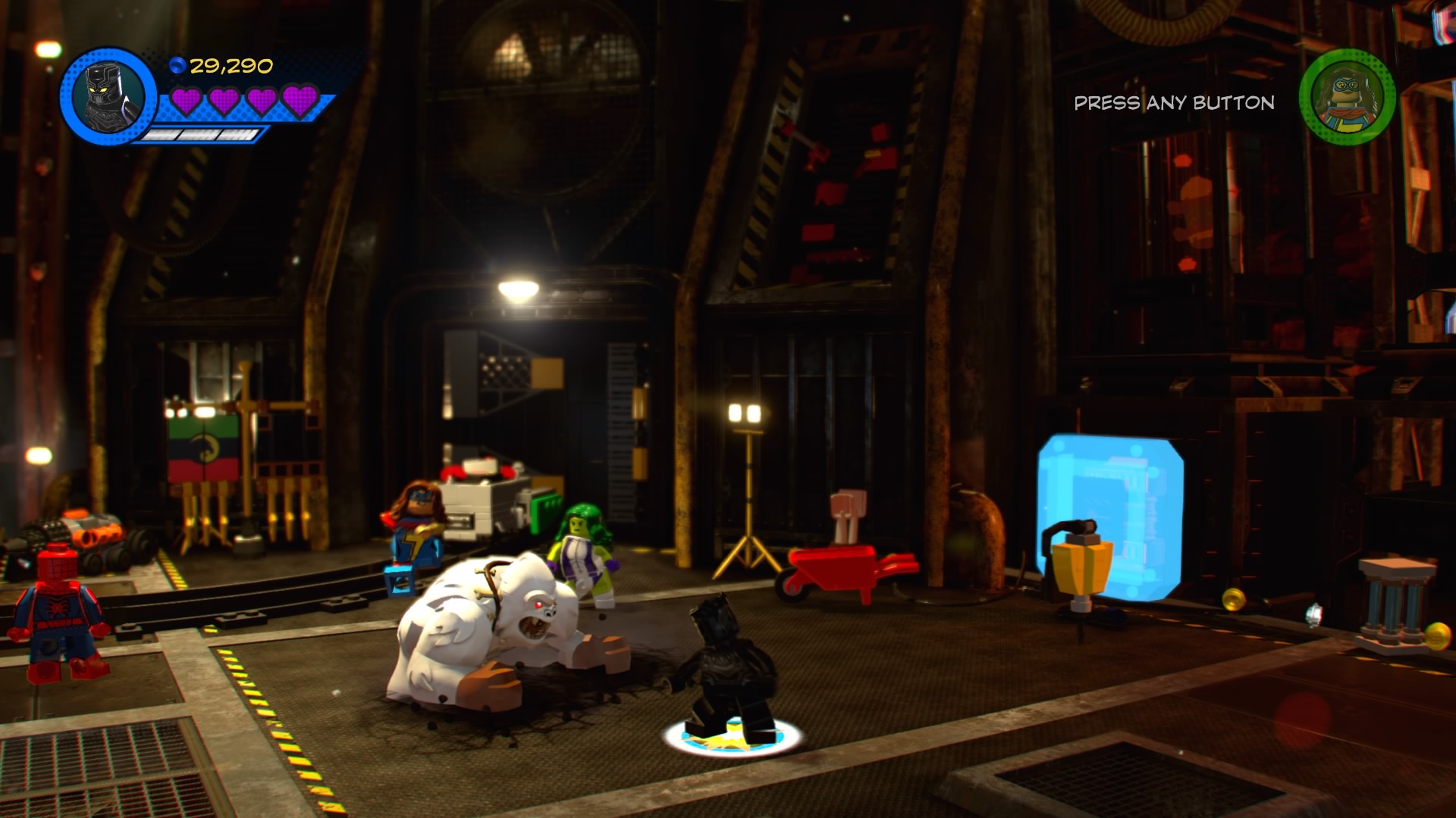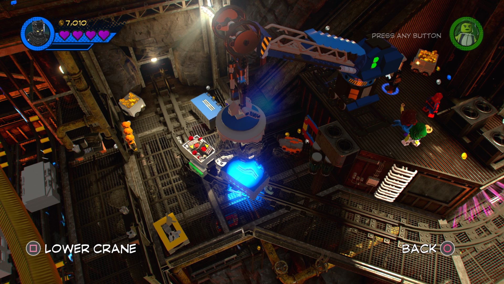 On the other side, use She-Hulk to pull the Power Handles and then climb the ladder down the tracks with Blank Panther. Sense the “?” to make a crate fall from the sky, depositing another pile of hopping bricks. Construct and use the new control panel to lift up the blue LEGO box blocking the minecart. When it’s destroyed, you can jump back down to the tracks and push the cart further ahead.