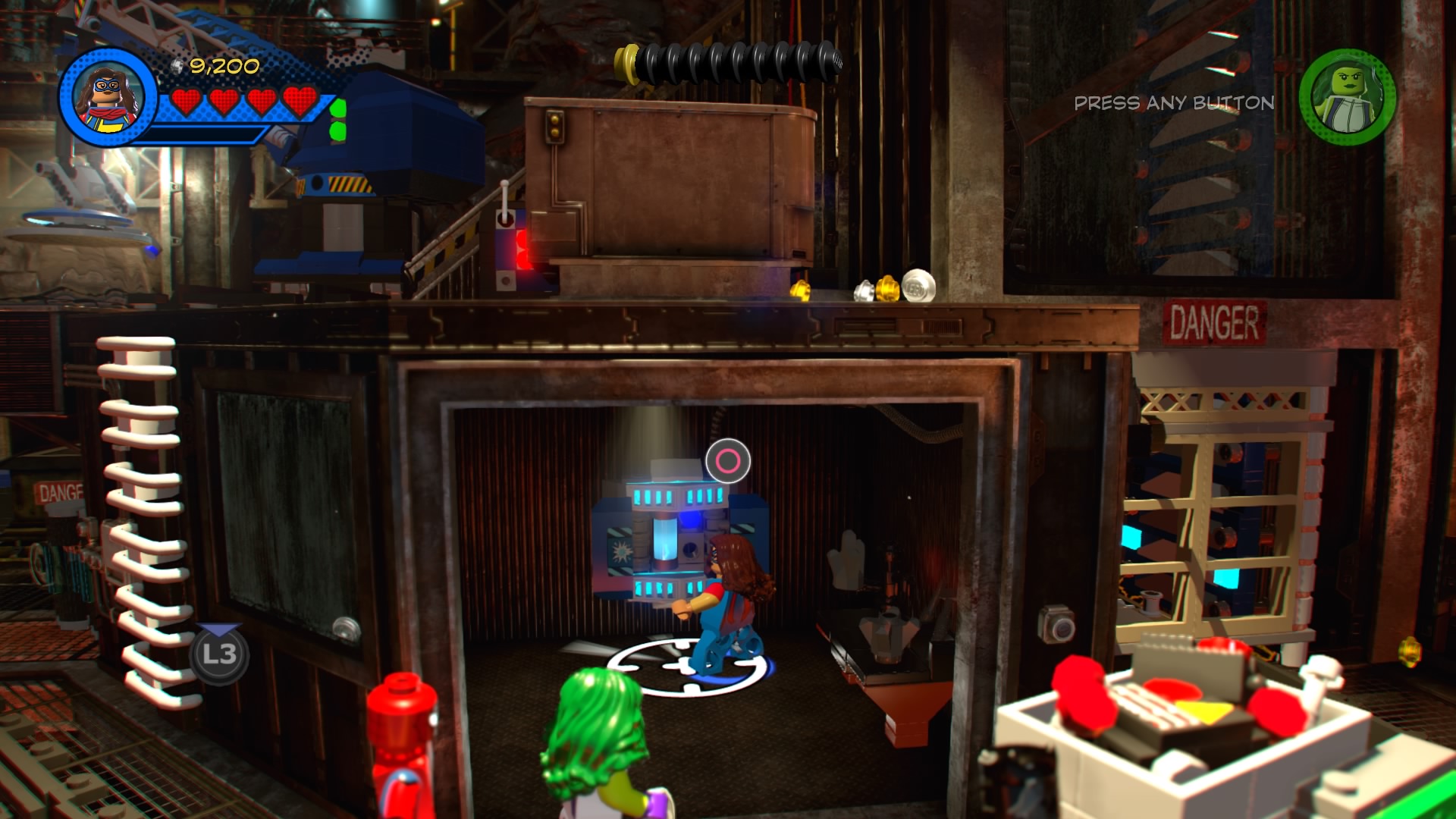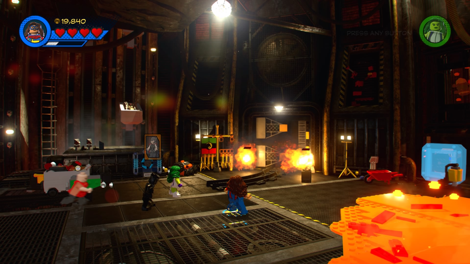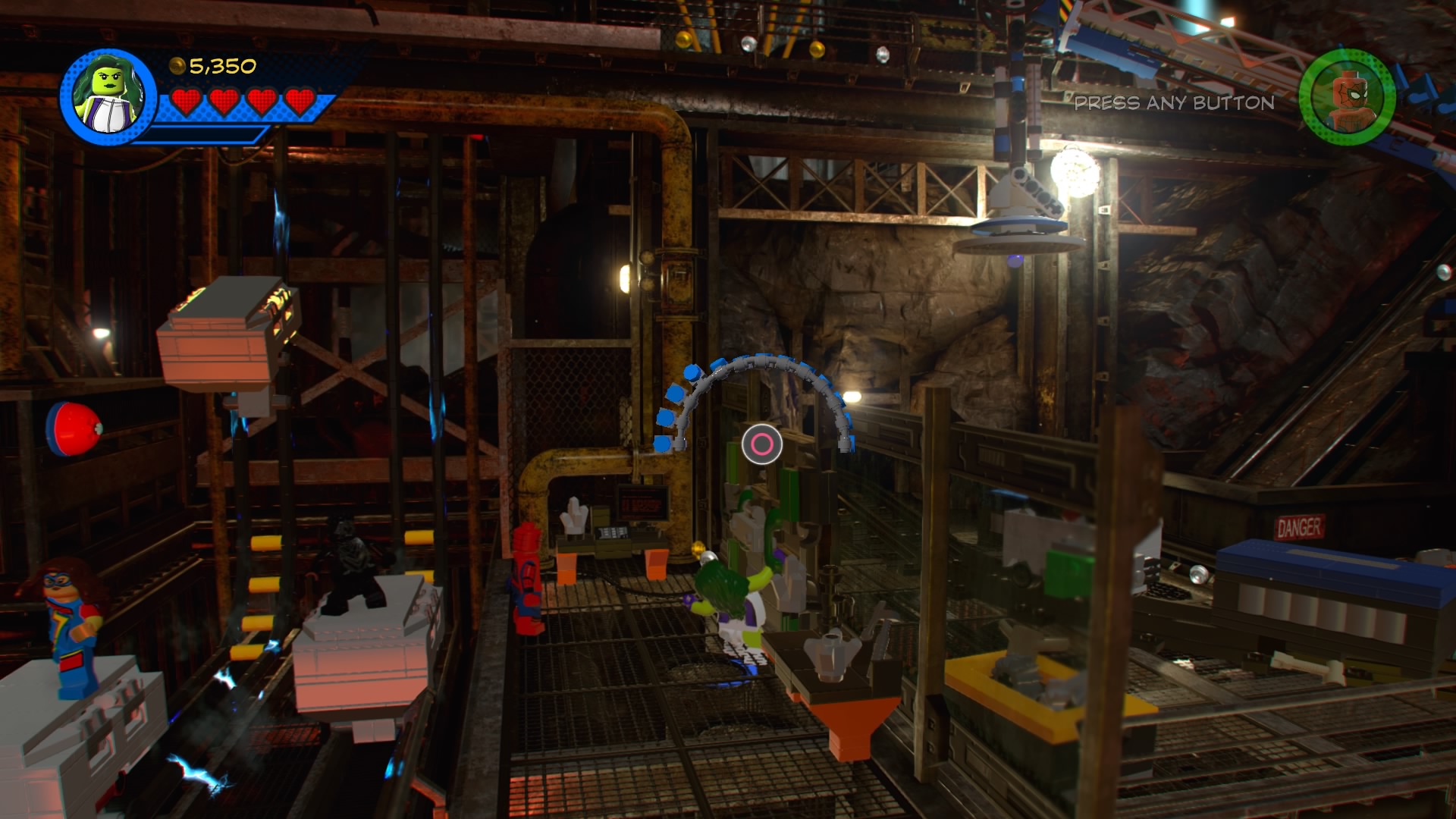 On the other side, use She-Hulk to pull the Power Handles and then climb the ladder down the tracks with Blank Panther. Sense the “?” to make a crate fall from the sky, depositing another pile of hopping bricks. Construct and use the new control panel to lift up the blue LEGO box blocking the minecart. When it’s destroyed, you can jump back down to the tracks and push the cart further ahead.