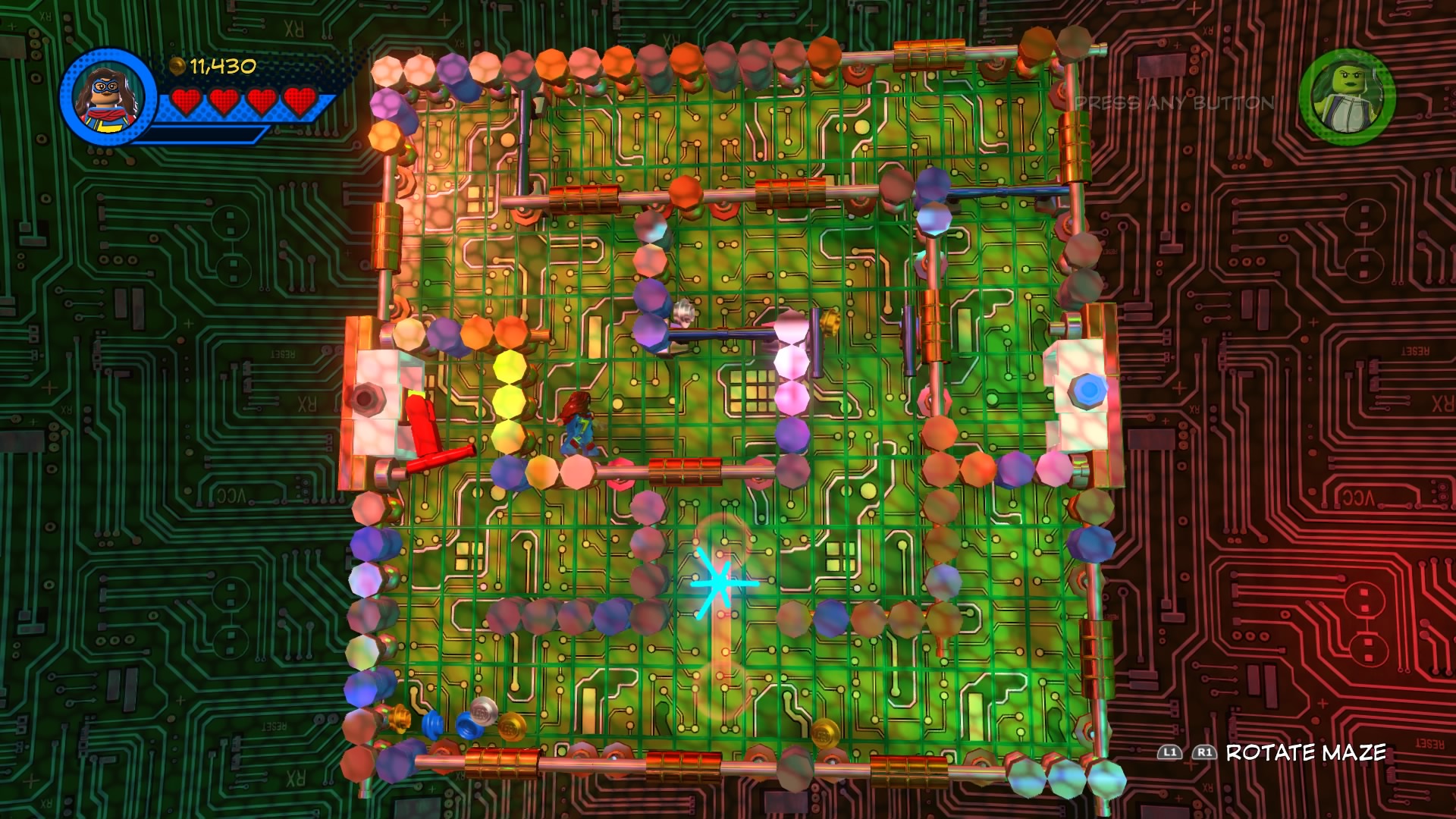 Too bad the elevator is disabled. Swap to Ms. Marvel and smash through the cracked wall that’s glowing red-purple, then interact with the Shrink Panel to enter a tiny maze. Press [L1 / LB] and [R1 / RB] to rotate the entire maze and reach the switch at the end. After hitting it, you’ll restore power to the elevator and be able to push the cart on.