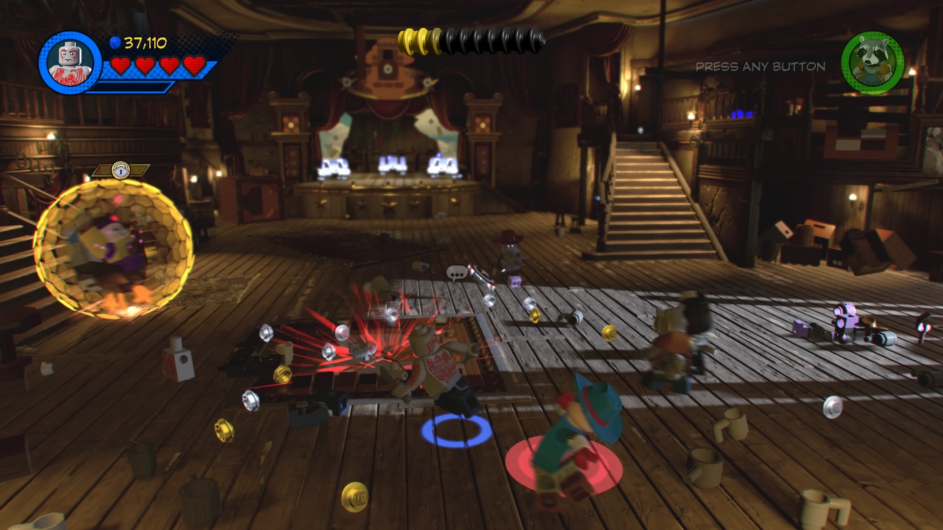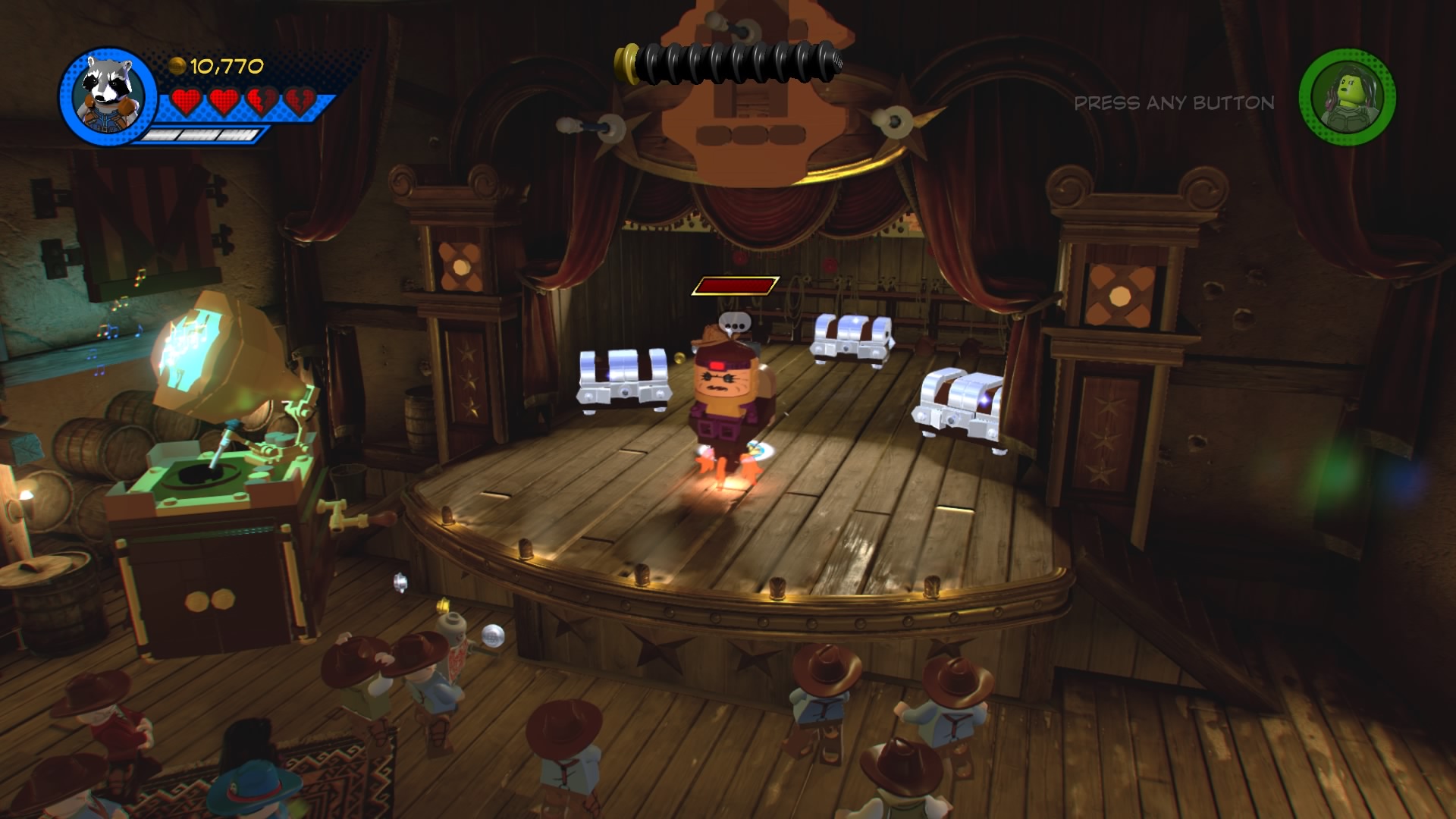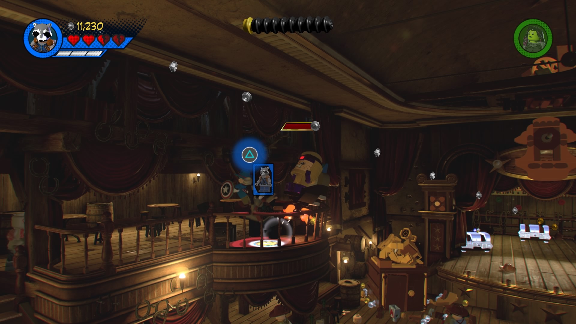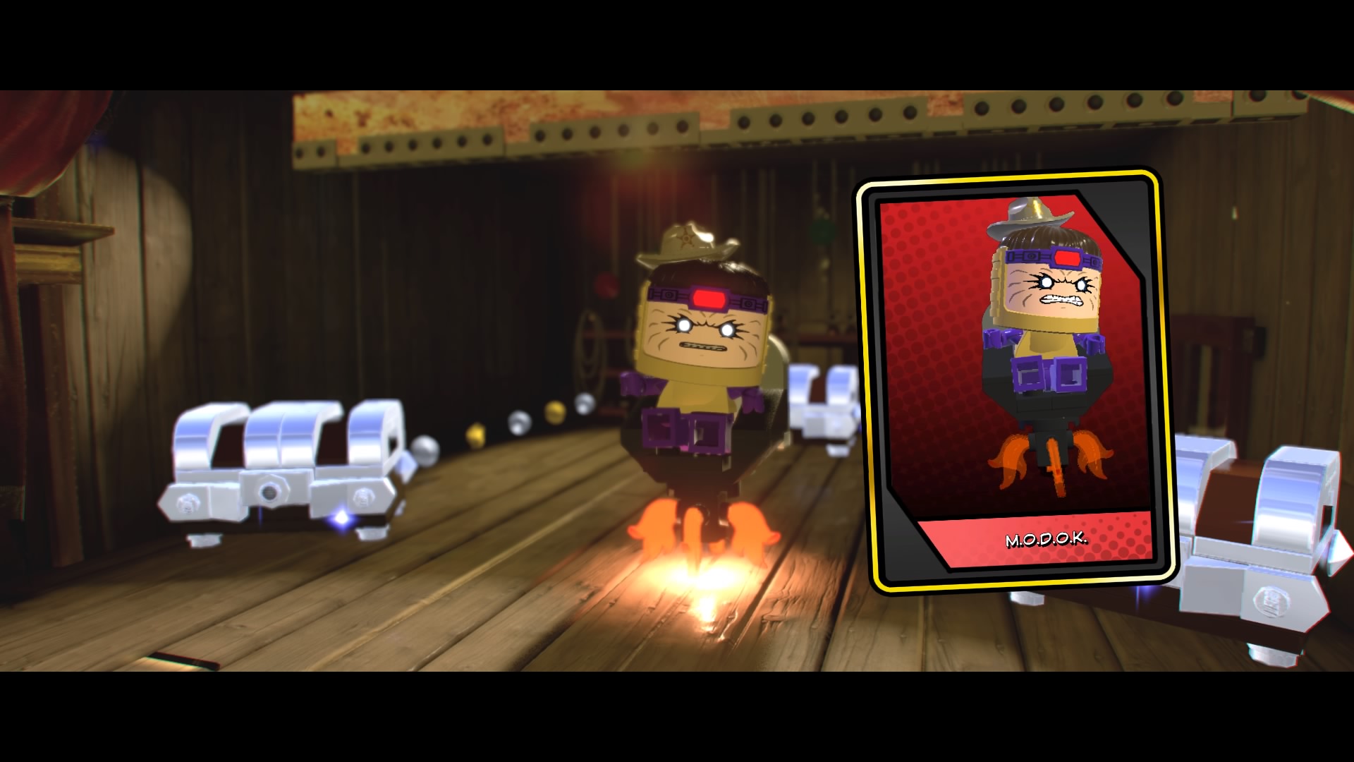 MODOK, that weird flying machine-man-thing is in the saloon! Destroy the glowing LEGO objects and construct the hopping bricks near the stage to create an electricity panel. Zap it with Rocket Raccoon to disable the shield, now you can beat up MODOK! Follow him around the saloon, smacking him around until he retreats and new poles appear above the stage.