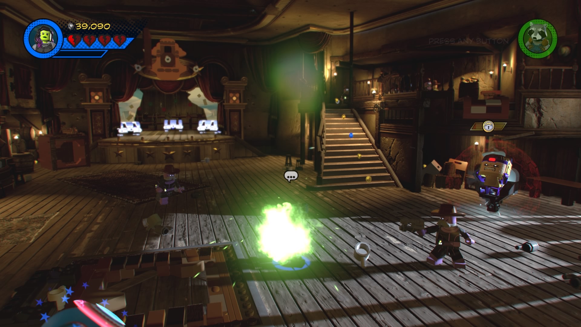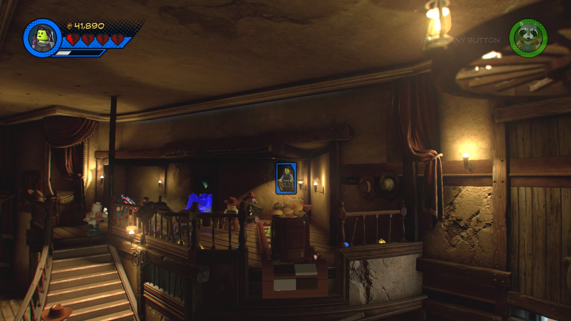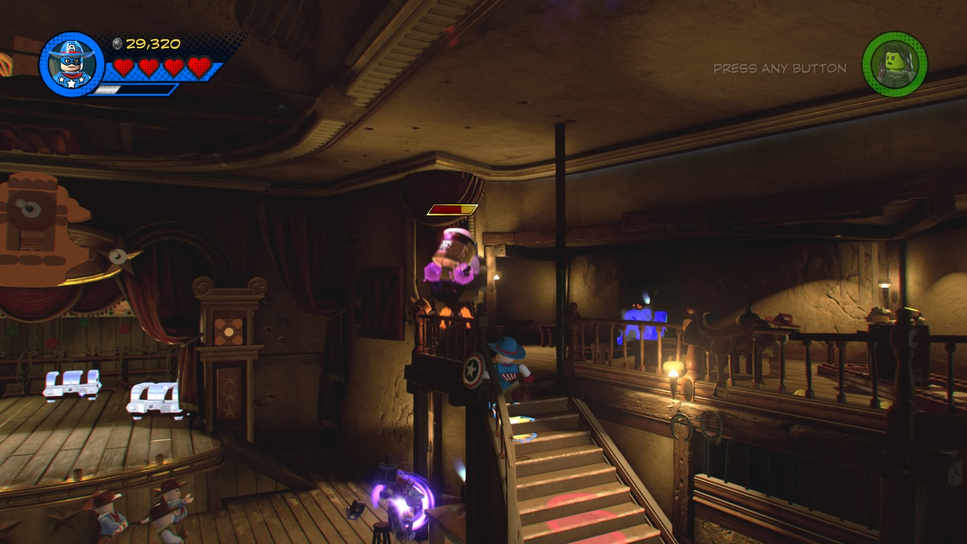 MODOK, that weird flying machine-man-thing is in the saloon! Destroy the glowing LEGO objects and construct the hopping bricks near the stage to create an electricity panel. Zap it with Rocket Raccoon to disable the shield, now you can beat up MODOK! Follow him around the saloon, smacking him around until he retreats and new poles appear above the stage.