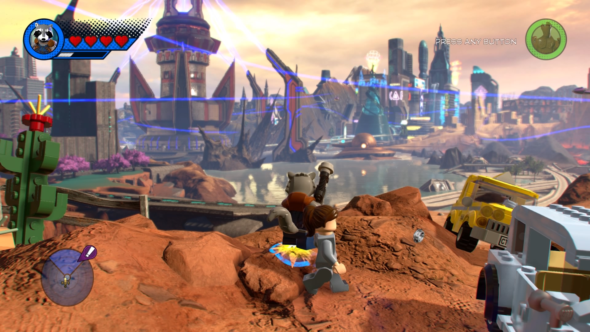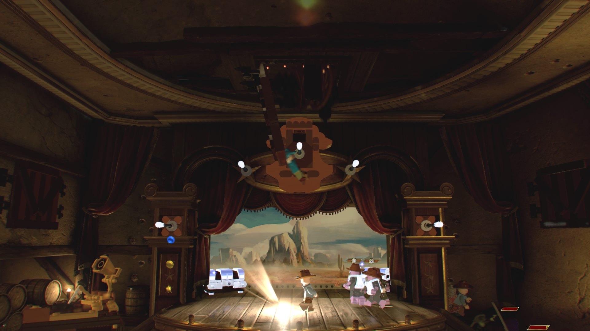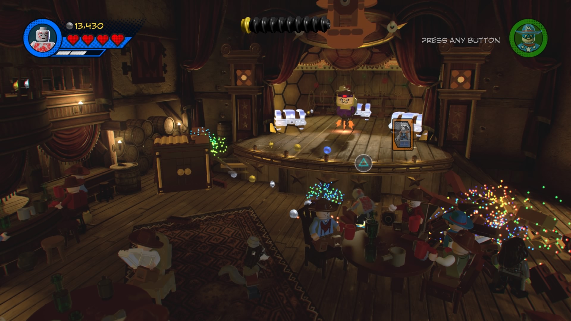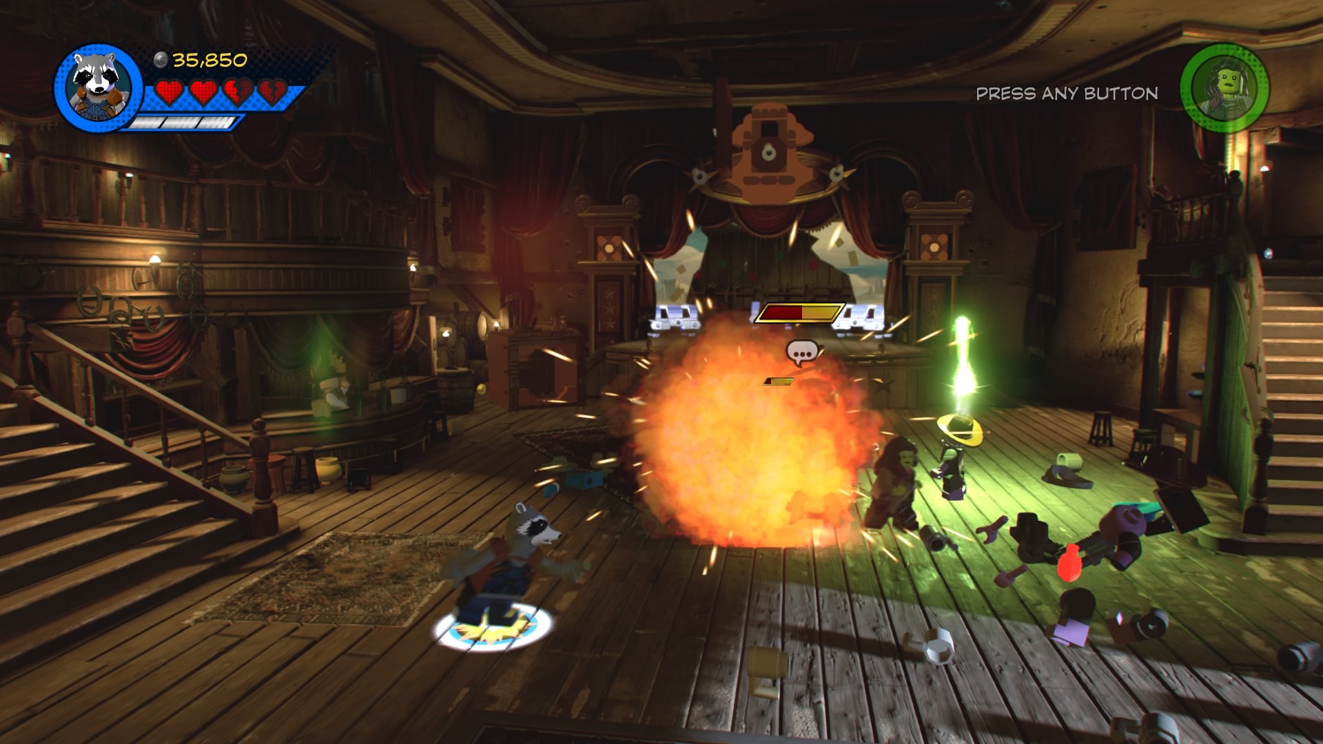 MODOK, that weird flying machine-man-thing is in the saloon! Destroy the glowing LEGO objects and construct the hopping bricks near the stage to create an electricity panel. Zap it with Rocket Raccoon to disable the shield, now you can beat up MODOK! Follow him around the saloon, smacking him around until he retreats and new poles appear above the stage.