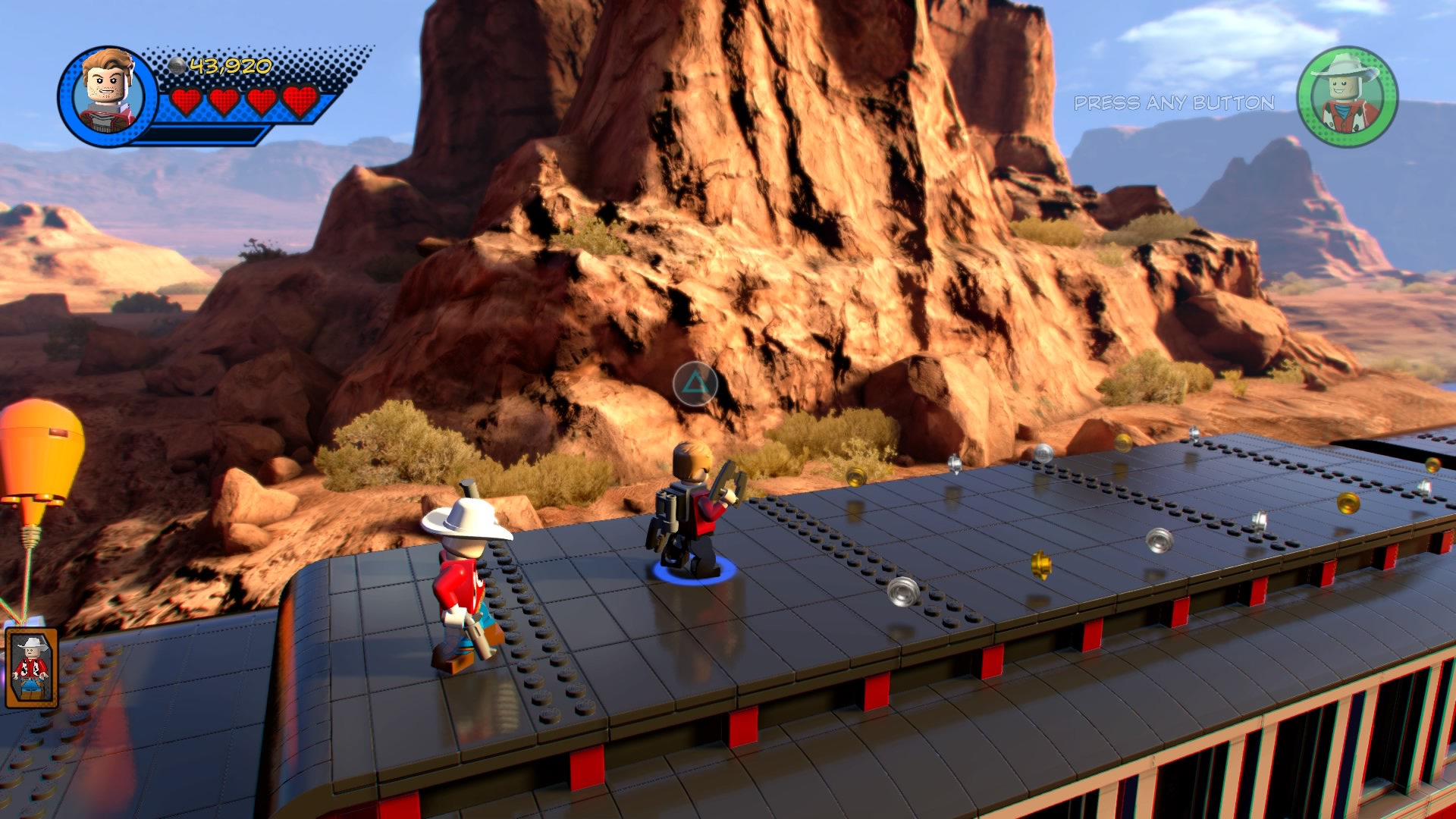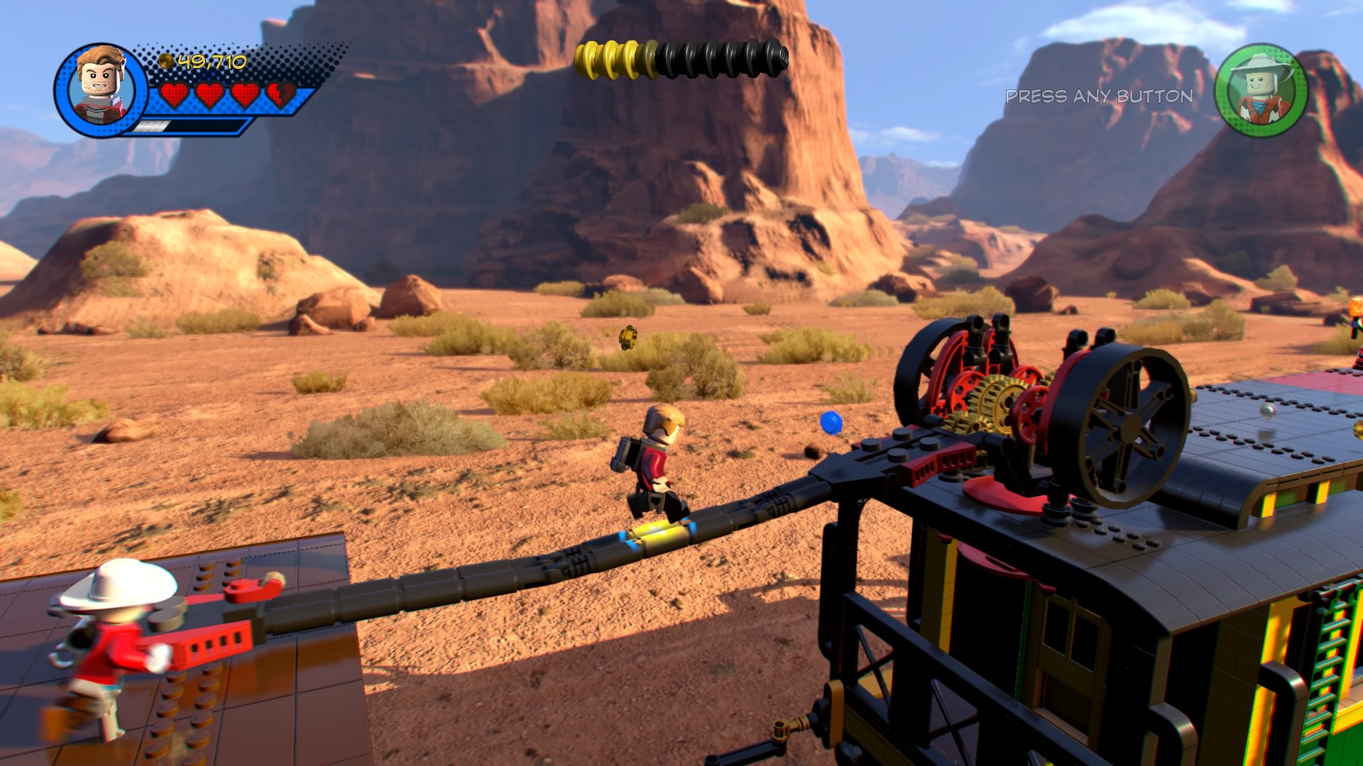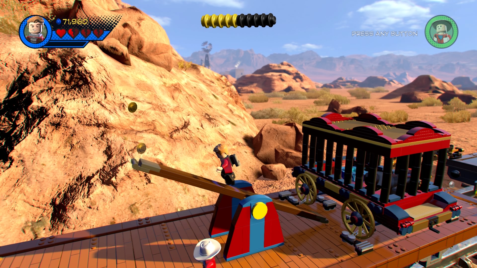 It’s up to Star-Lord and his new pal Kid Colt to board the runaway train and save their Guardian pals. Move right and use the twirl poles to get by the snake charmer’s pets. Defeat the charmer and smash the LEGO crate to clear the path and build the hopping bricks to create a Gravity Booster. Toss a Star-Lord mine onto the booster to pull down a crane and create a path across the large gap.