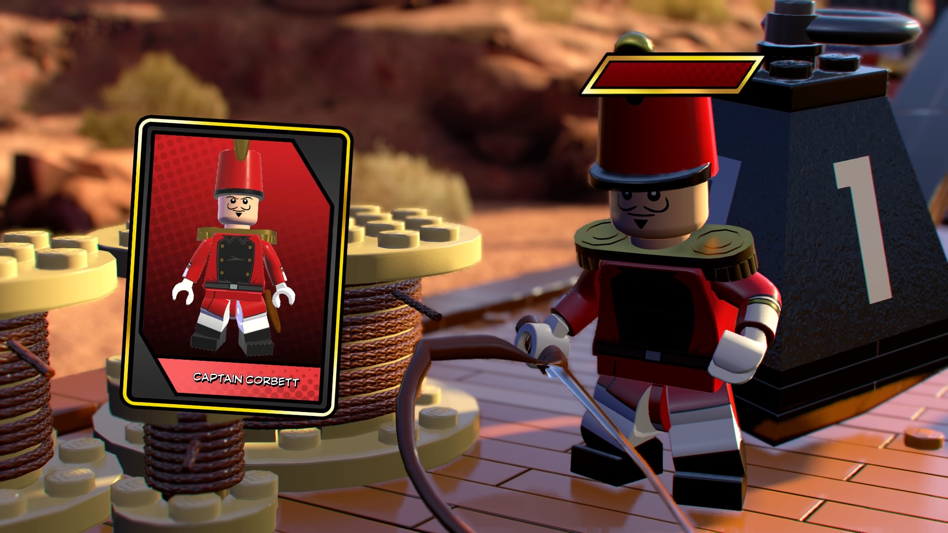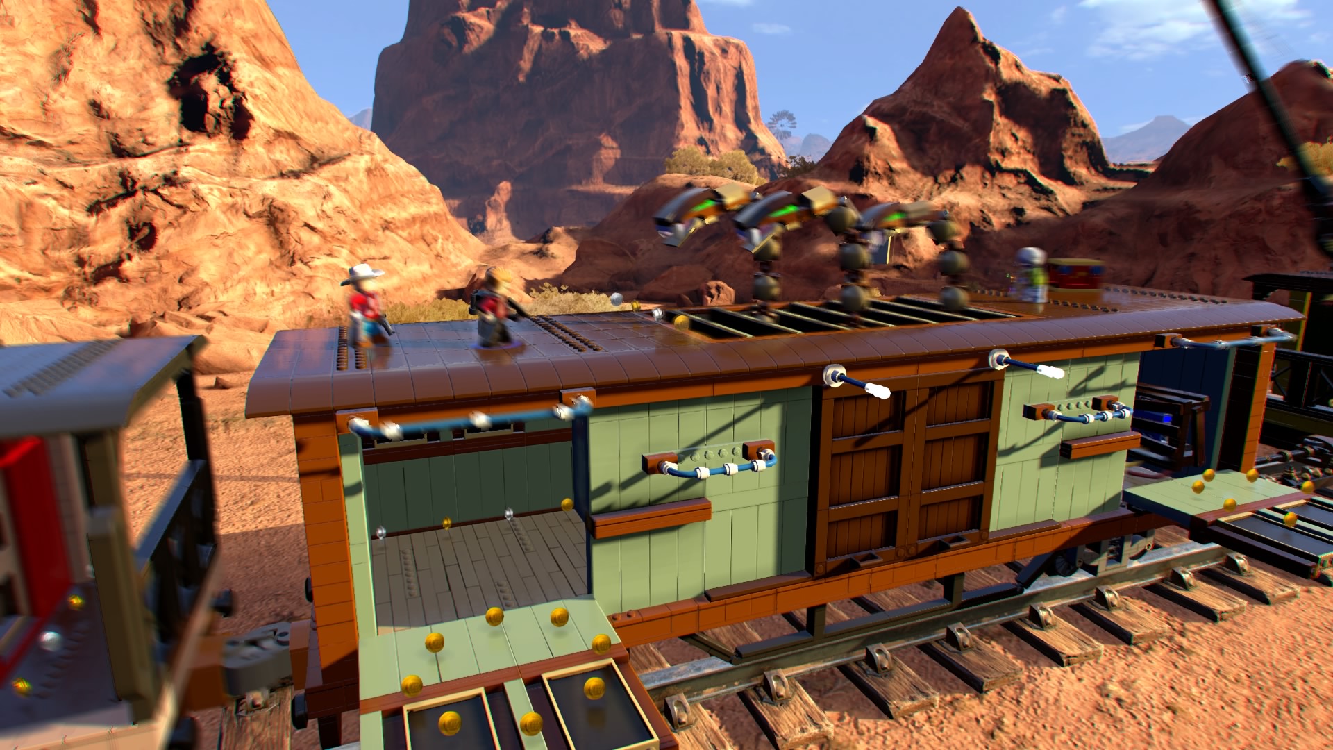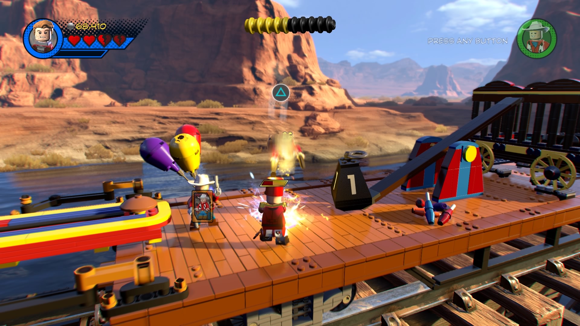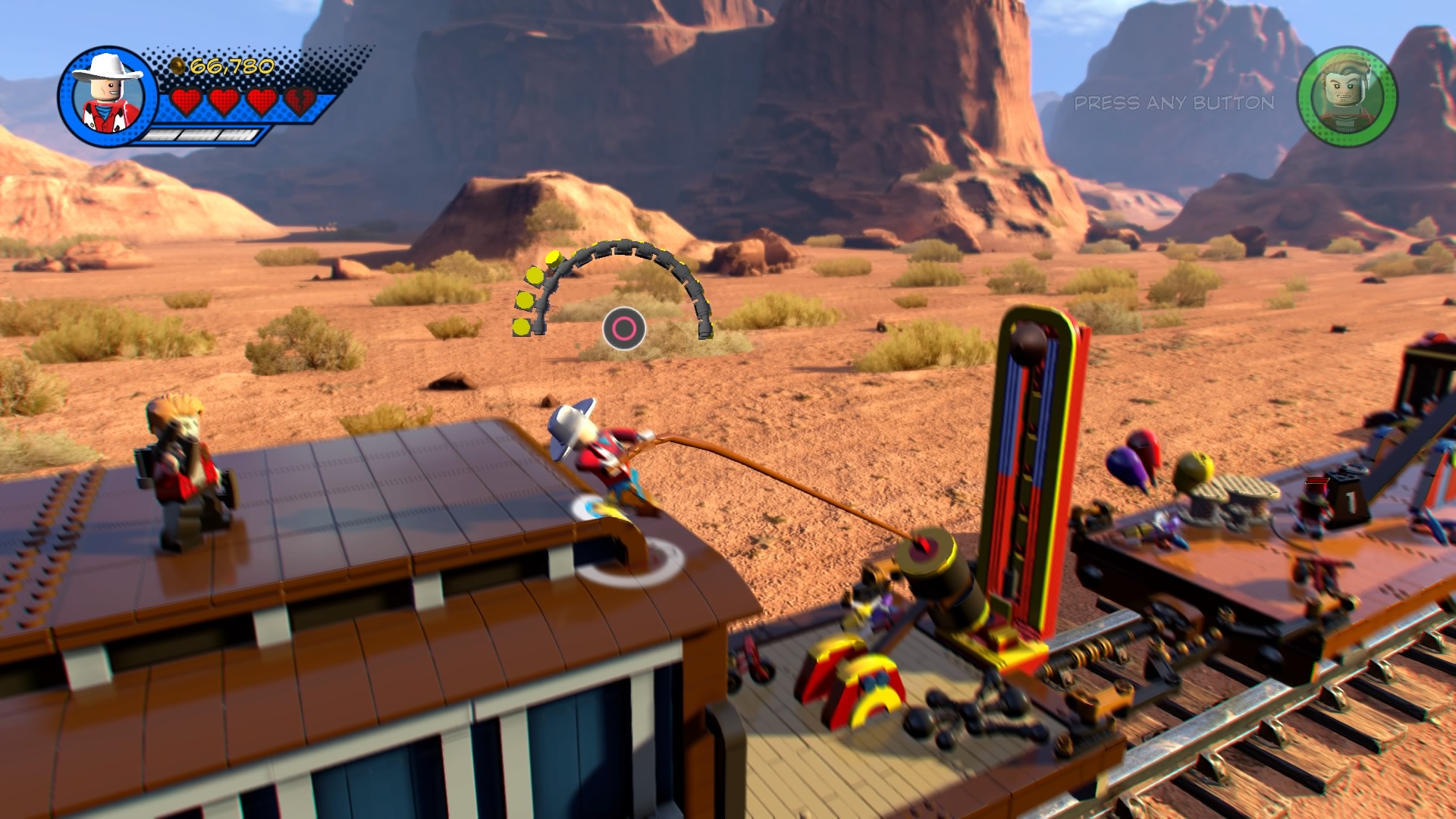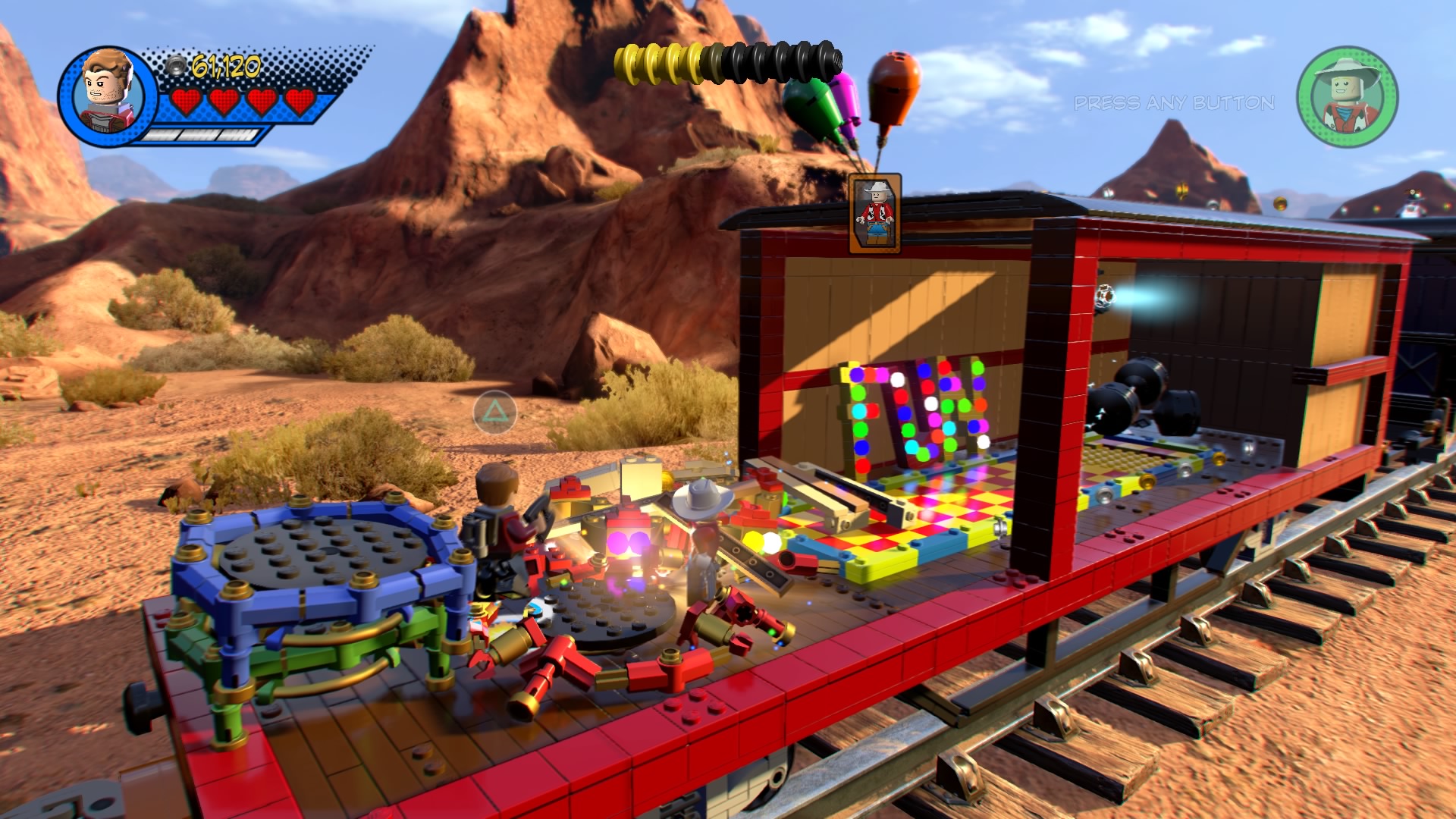 Blast your way through the fire-breathers and hop through the burning rings to reach a pile of trampolines. Smash all the LEGO objects nearby and build the hopping bricks into a new red trampoline. Push it to the end of the tracks and bounce up to the train car roof. Use Kid Colt’s explosive TNT to blast the armored goons and then pummel the ringleader Captain Corbett until he retreats.