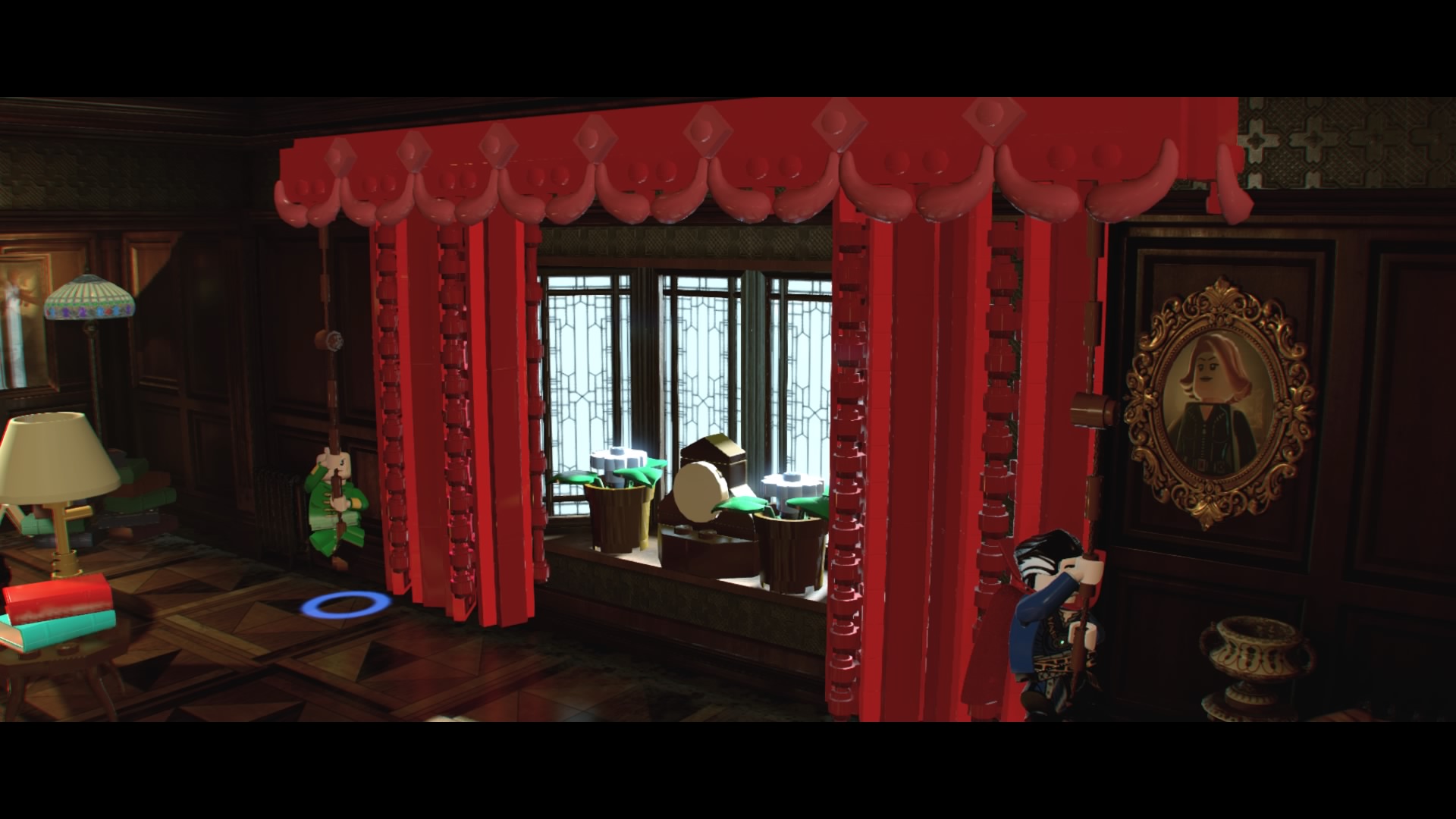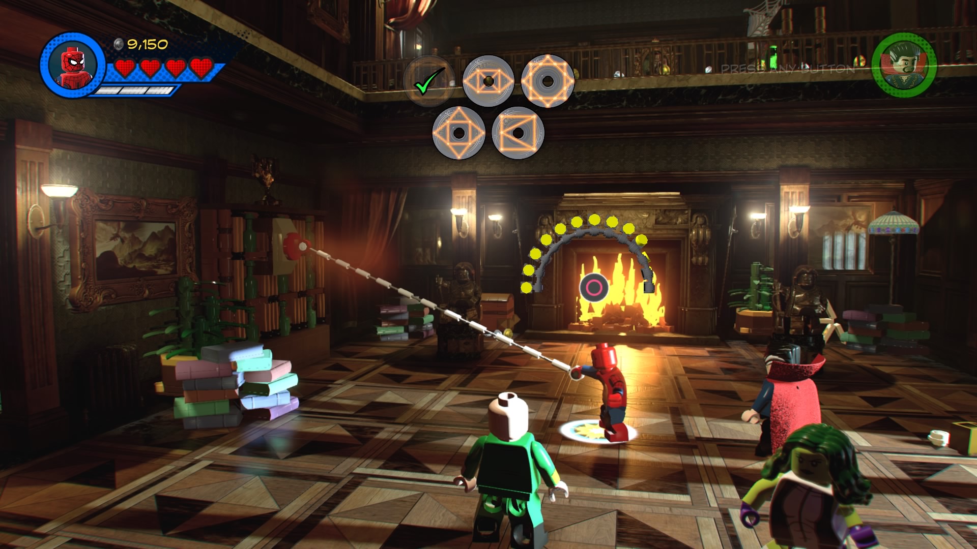 Rune #2: Go to the room to the right of the first floor, then pull the two red cords on the window. Smash the clock, then break the glowing chair surrounded by enemies. Build, then use Spider-Man to pull the red handle. Construct another pile of hopping bricks to summon a mud-man that puts out the fireplace, revealing a sigil.