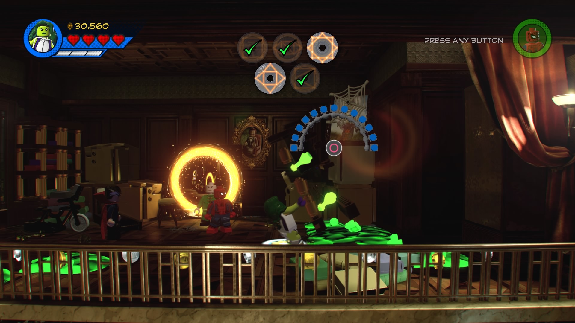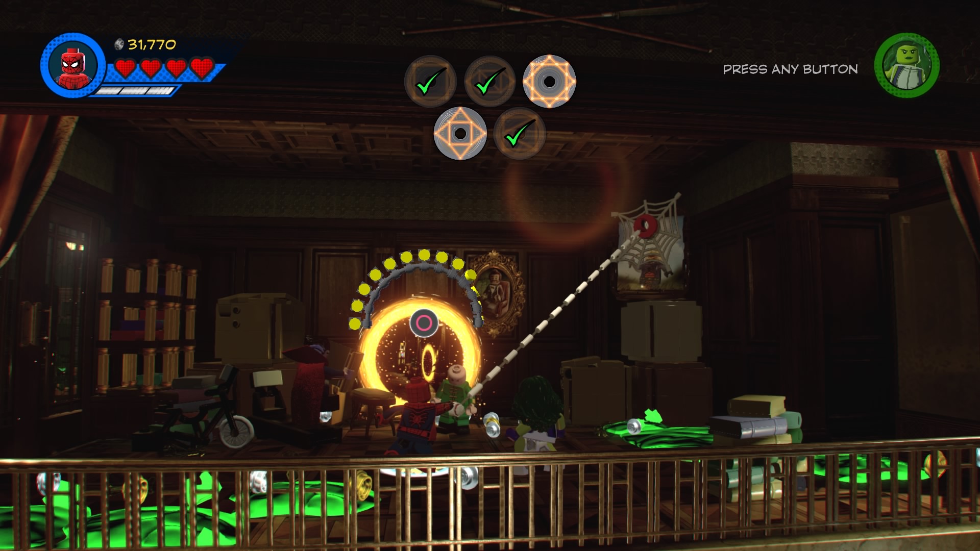 Rune #4: Still on the second floor, go to the right side and smash the glowing display case. Build to create a magic portal to the attic. Up here, swap to She-Hulk to pull down the green power handles, then build to create a Spider-Man web handle. Shoot the red object with webs to reveal the fourth rune.