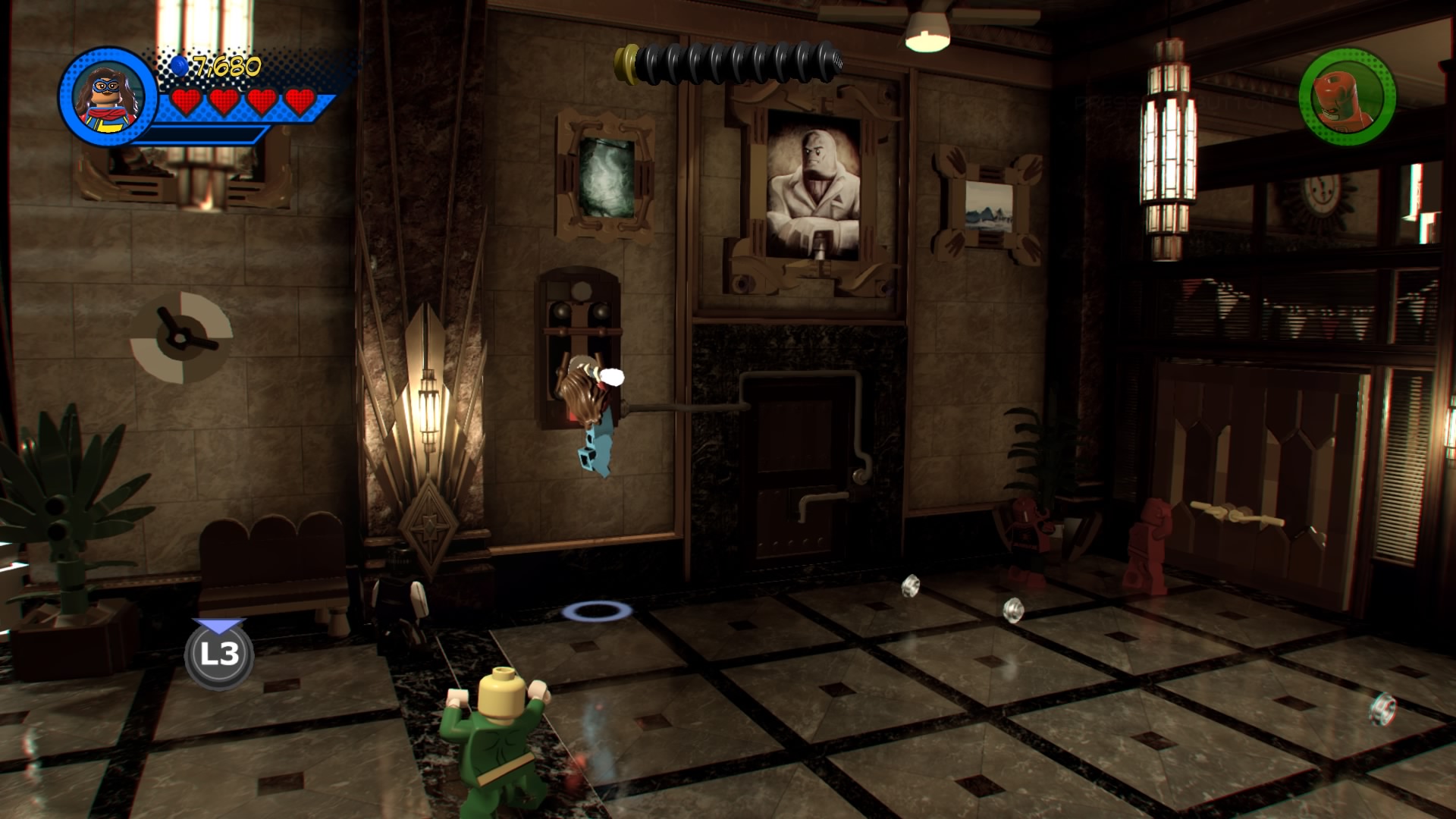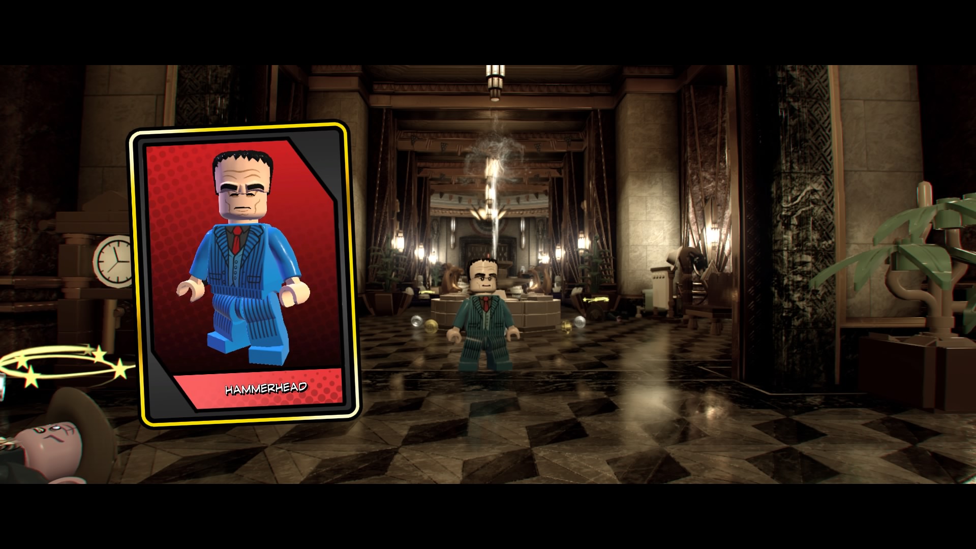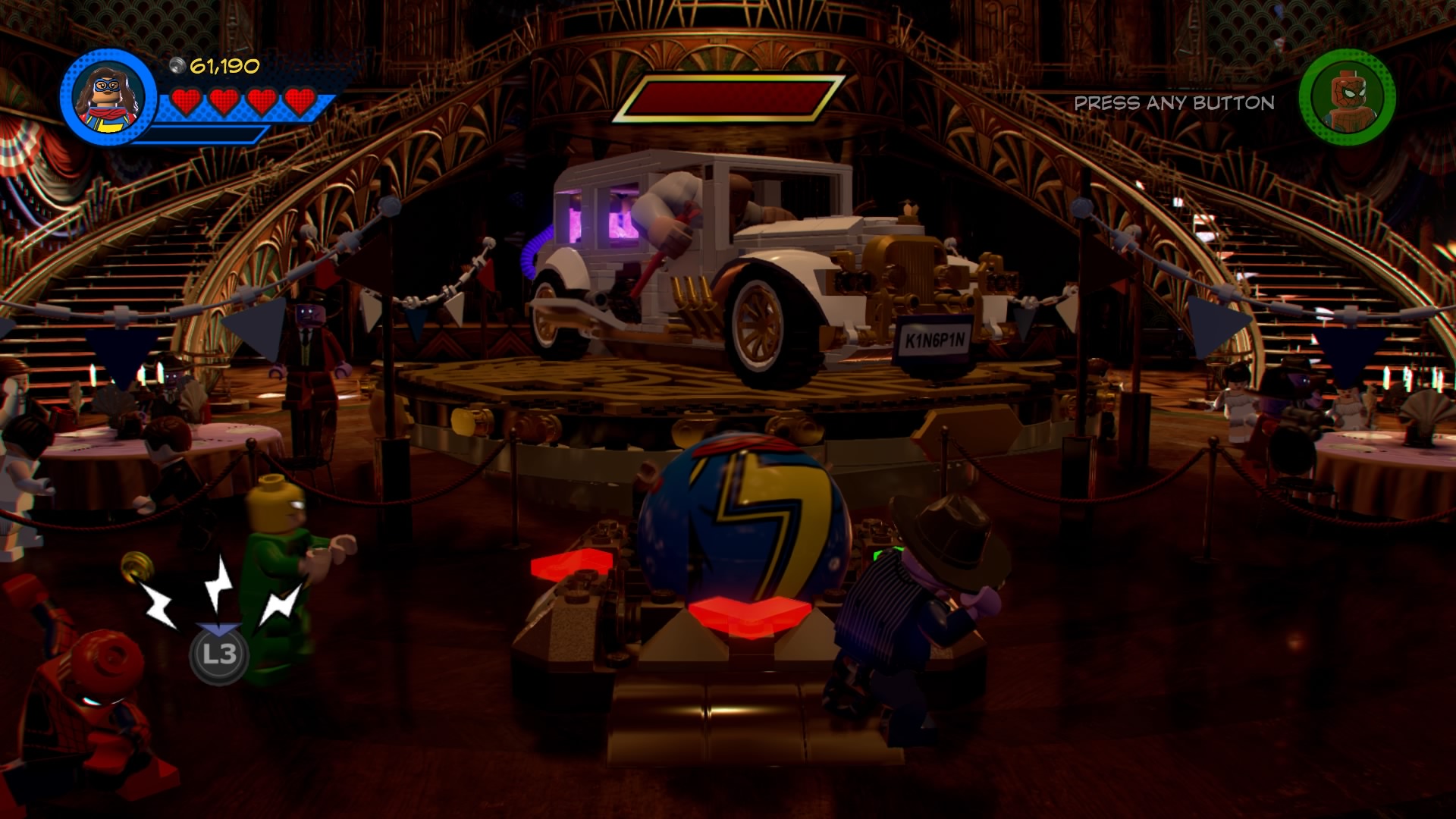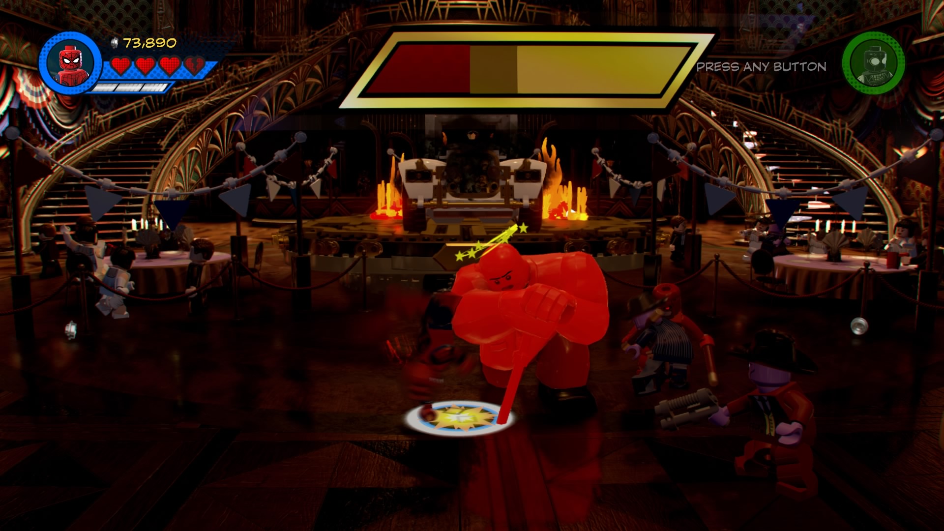 In the fancy hallway ahead, you’ll face off with Hammerhead! He’s a gun-toting lackey, working for Kingpin, and he’s got a small army of goons. Fight to the lobby outside Fisk’s office and swap to Daredevil to enter the “?” zone to initiate a boss fight. Hammerhead is pretty simple, so pummeling him is about all the strategy you need. Eventually he’ll become invincible. When he does, build the hopping bricks and activate the LEGO camera with Spider-Man, pulling the red handle.