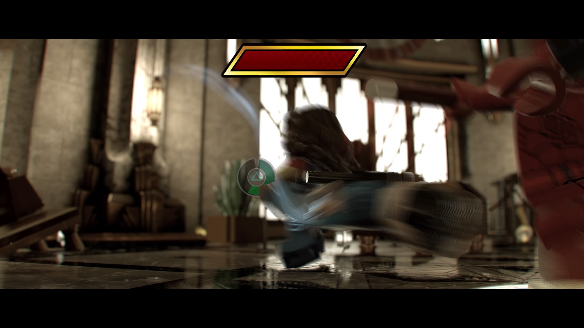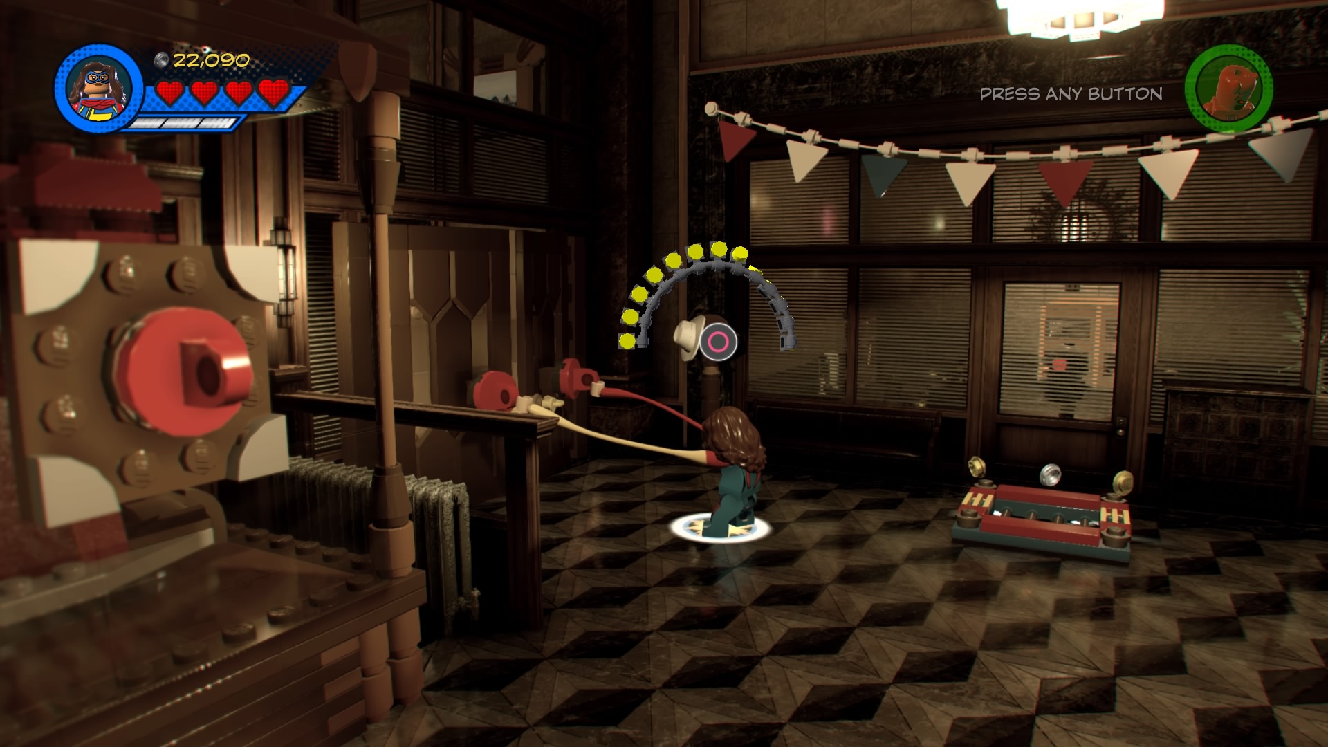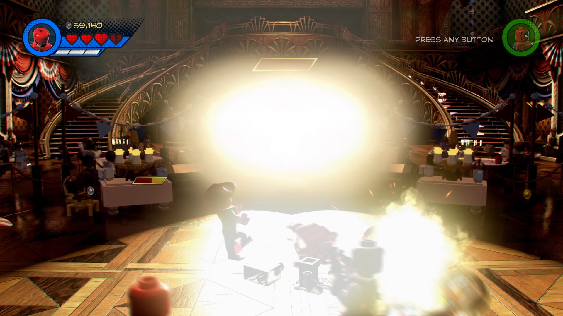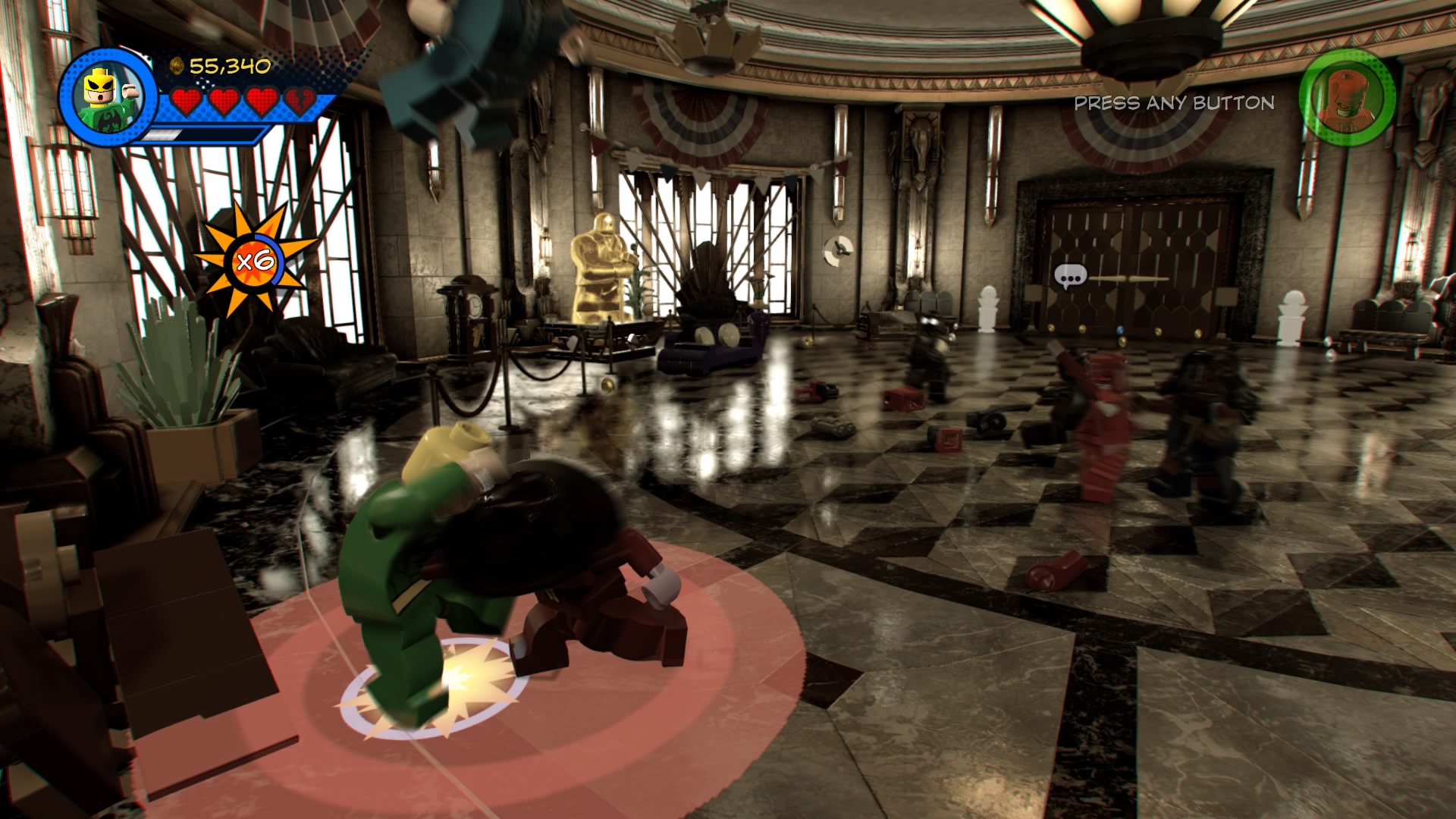 In the fancy hallway ahead, you’ll face off with Hammerhead! He’s a gun-toting lackey, working for Kingpin, and he’s got a small army of goons. Fight to the lobby outside Fisk’s office and swap to Daredevil to enter the “?” zone to initiate a boss fight. Hammerhead is pretty simple, so pummeling him is about all the strategy you need. Eventually he’ll become invincible. When he does, build the hopping bricks and activate the LEGO camera with Spider-Man, pulling the red handle.