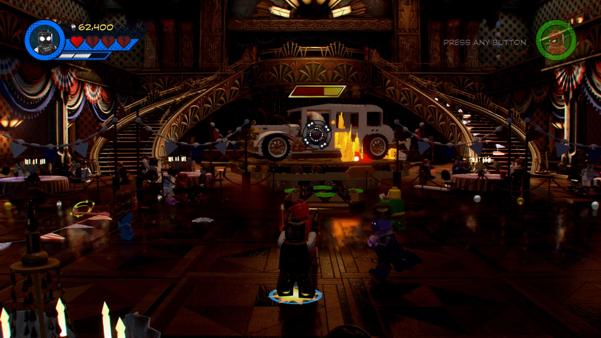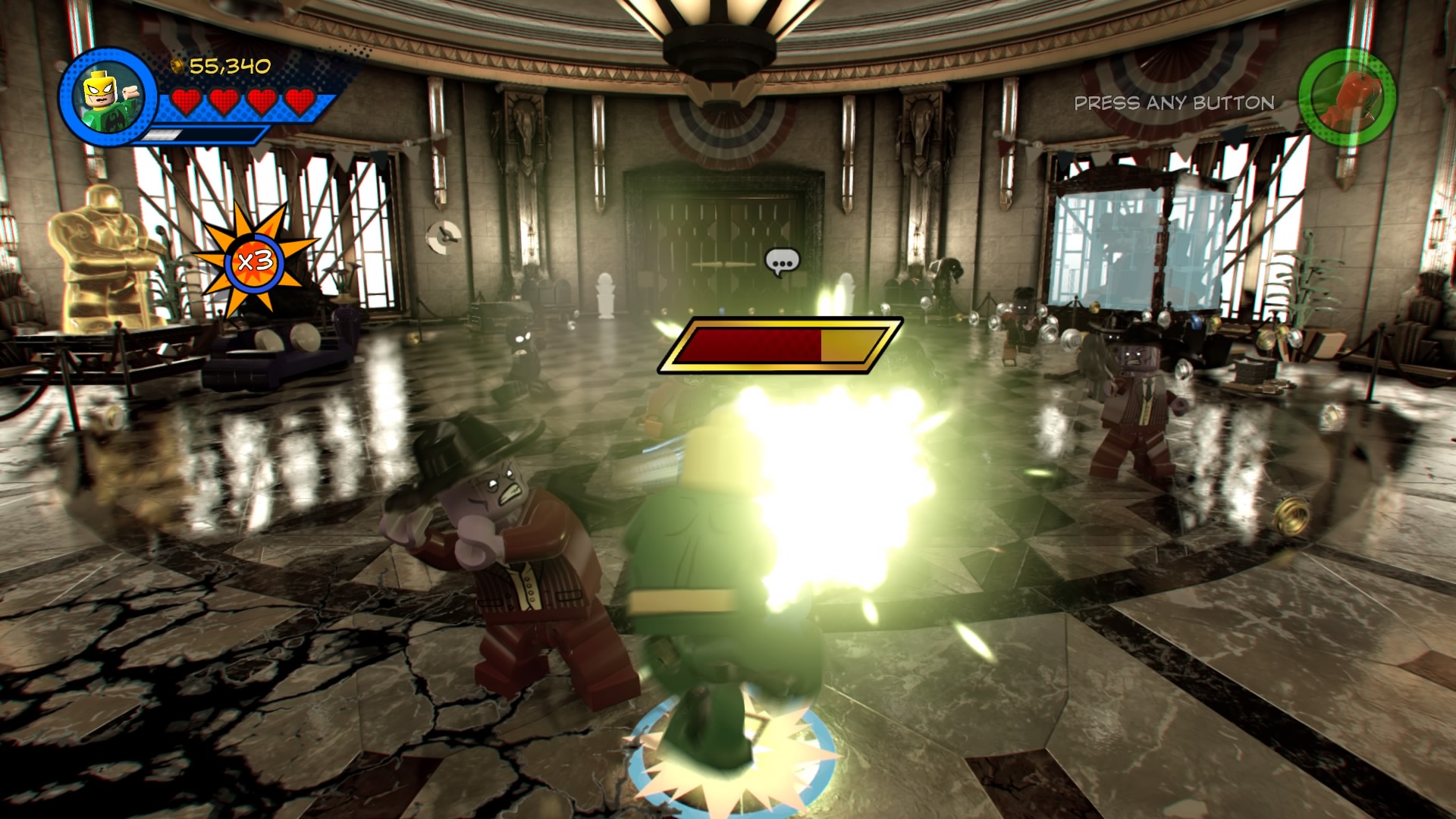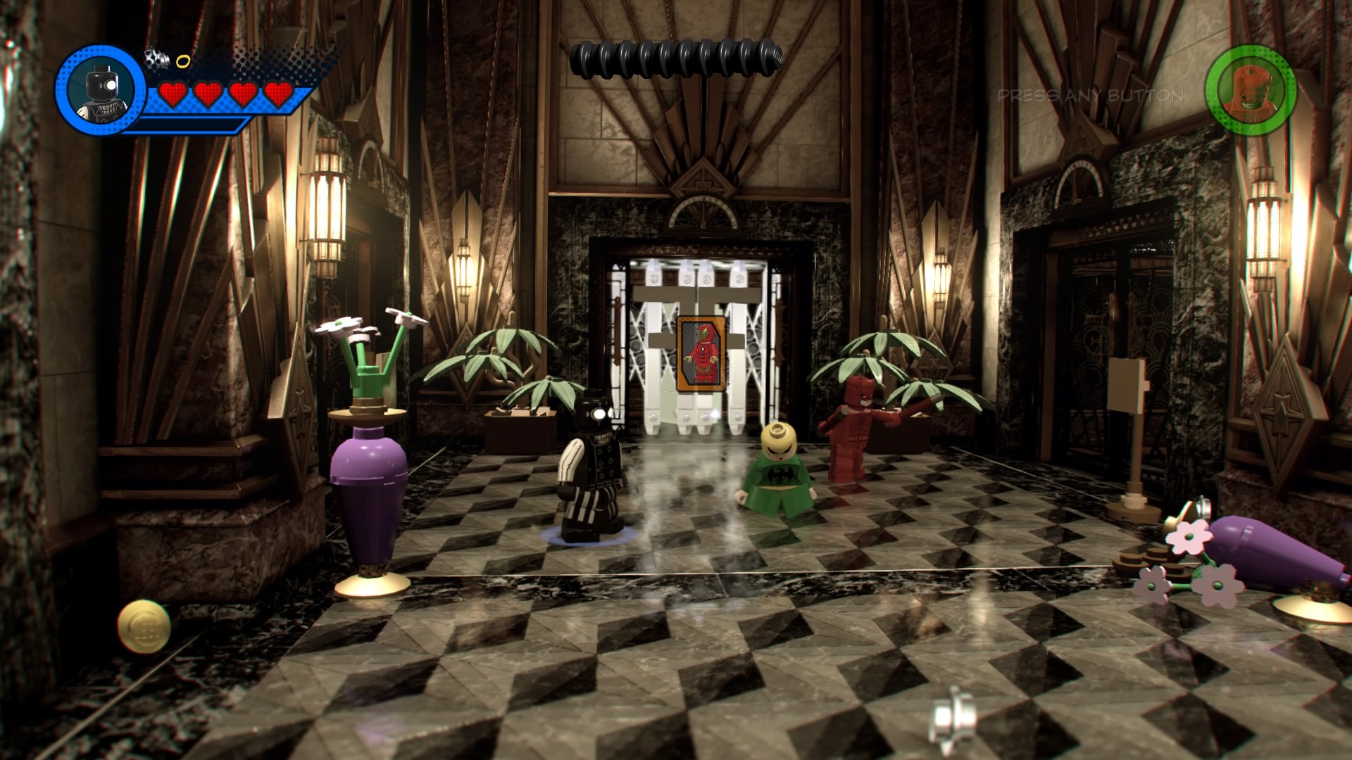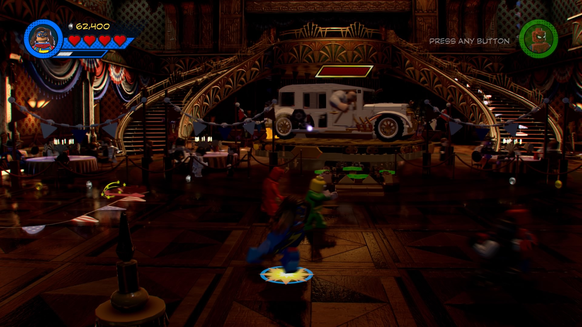 In the fancy hallway ahead, you’ll face off with Hammerhead! He’s a gun-toting lackey, working for Kingpin, and he’s got a small army of goons. Fight to the lobby outside Fisk’s office and swap to Daredevil to enter the “?” zone to initiate a boss fight. Hammerhead is pretty simple, so pummeling him is about all the strategy you need. Eventually he’ll become invincible. When he does, build the hopping bricks and activate the LEGO camera with Spider-Man, pulling the red handle.