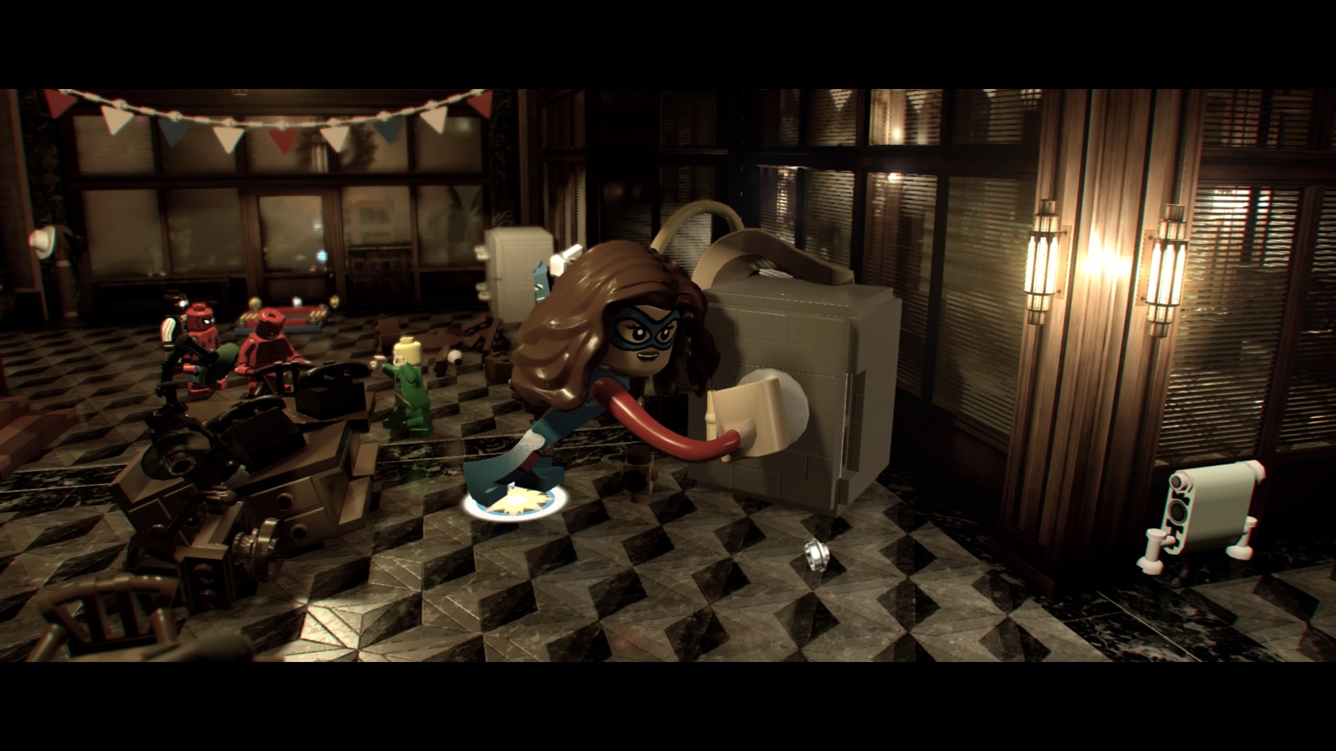 That will disable the security system and free a strange dragon artifact. Iron Fist can use that red LEGO dragon – hold [Circle / B] to charge your Chi, then shoot it into the dragon mouth until it is fully charged. It will spit out more hopping bricks. Construct a Ms. Marvel pad and use it to unlock the safe – it’s filled with more hopping bricks! Build those, and the ringing phone generates yet another batch of hopping bricks. Build those and pull the power handles with Ms. Marvel.