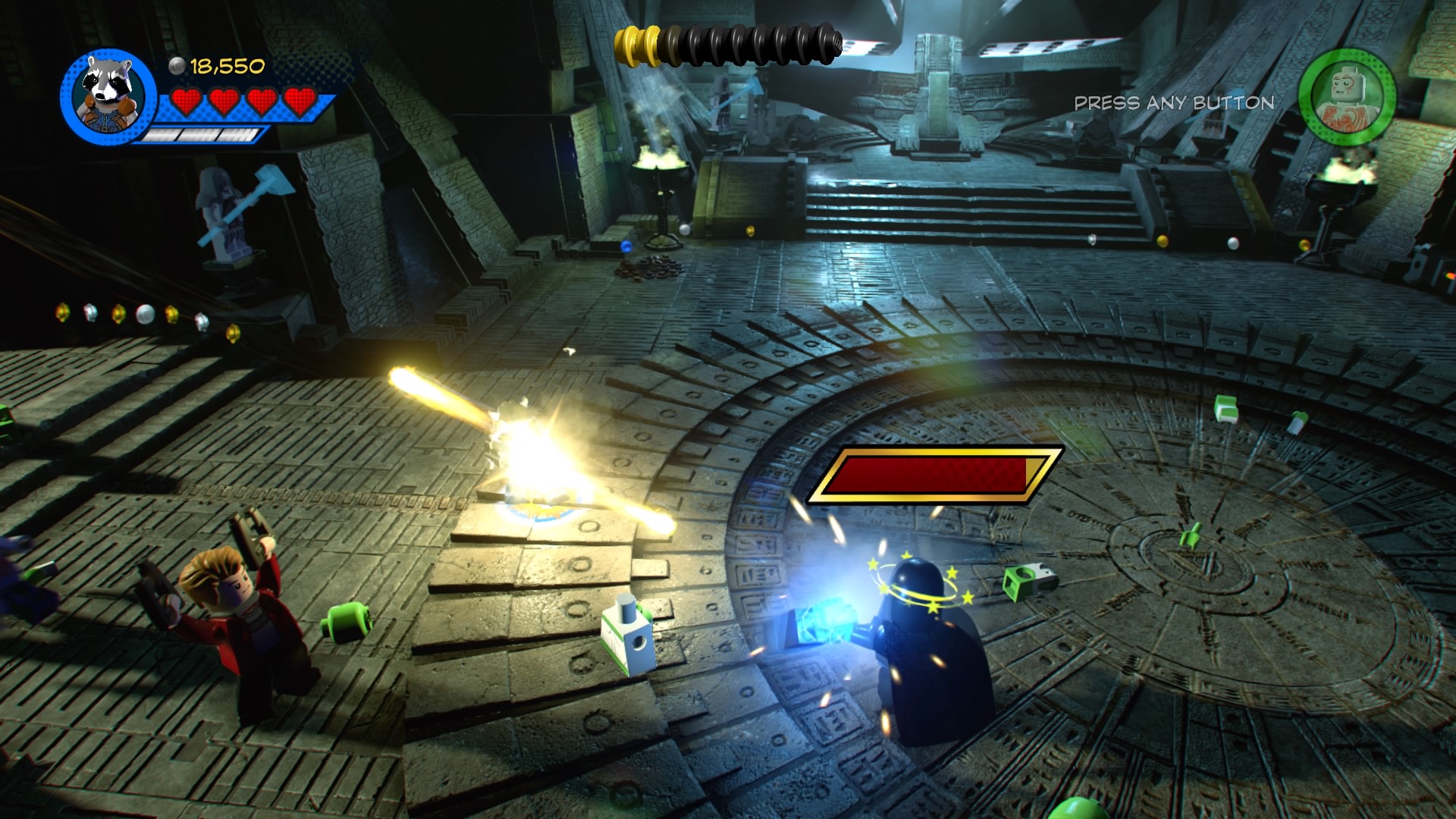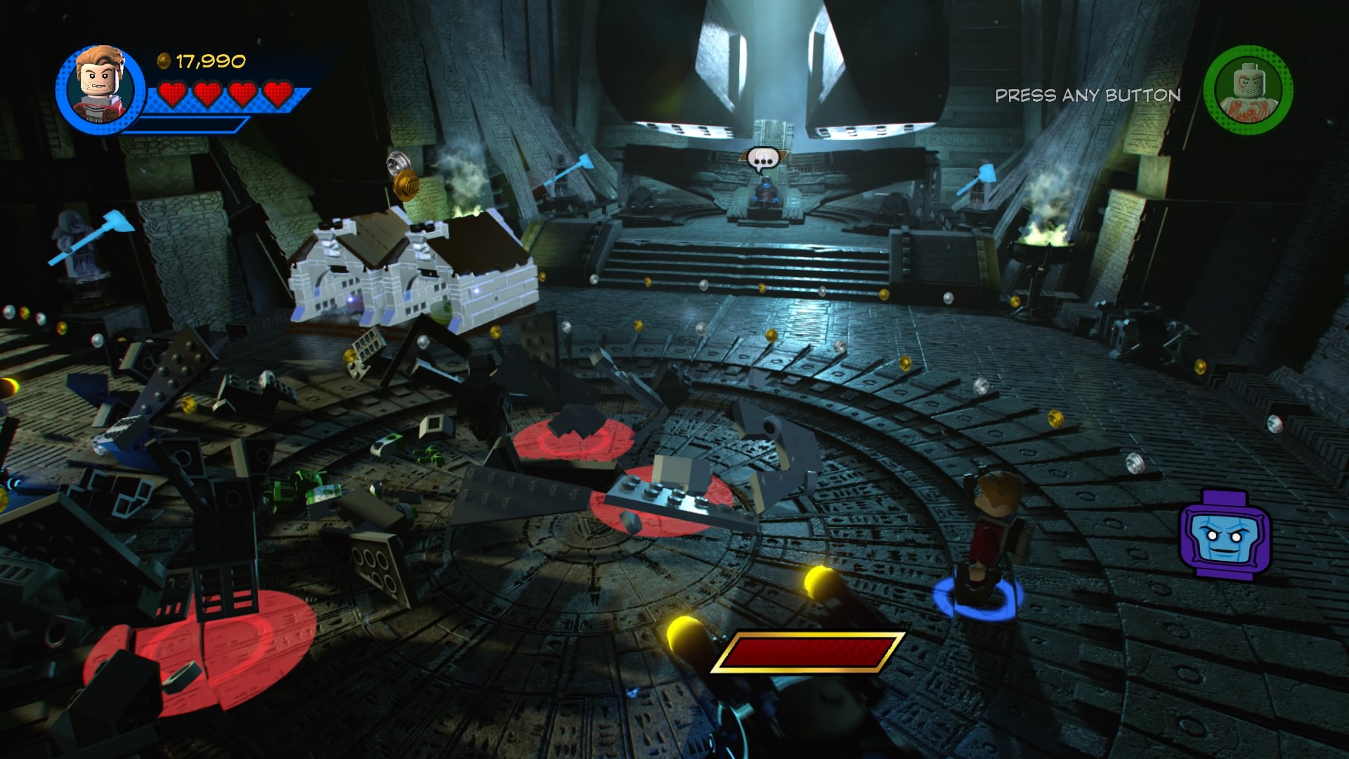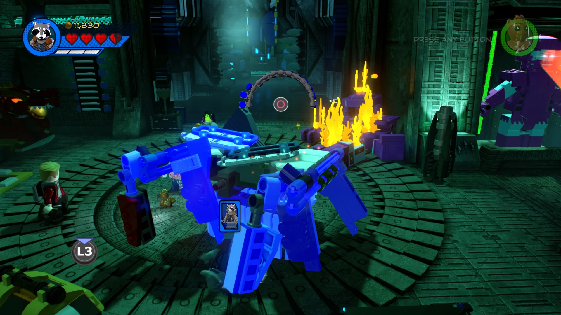 Past the crushers, smash the LEGO object near the final door to create Groot pad. Groot will grow and rip down the doors to the next room – it’s Ronan the Accusar’s throne room. Ronan immediately sends his bite-hungry dogs and minions to fight. There’s no trick here, just blast them until both dogs are defeated! Do the same for Ronan and you’ll complete the level.