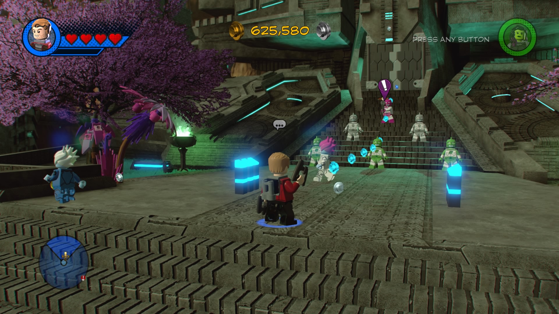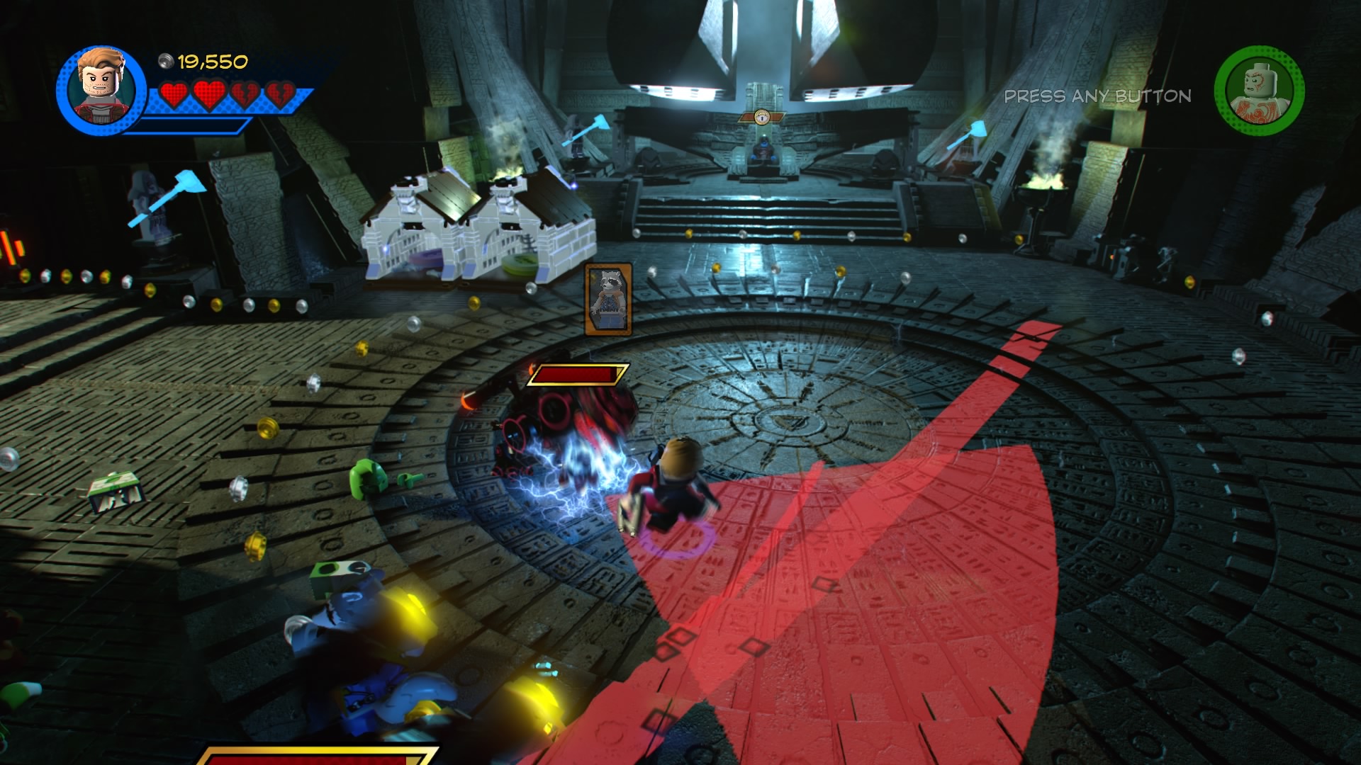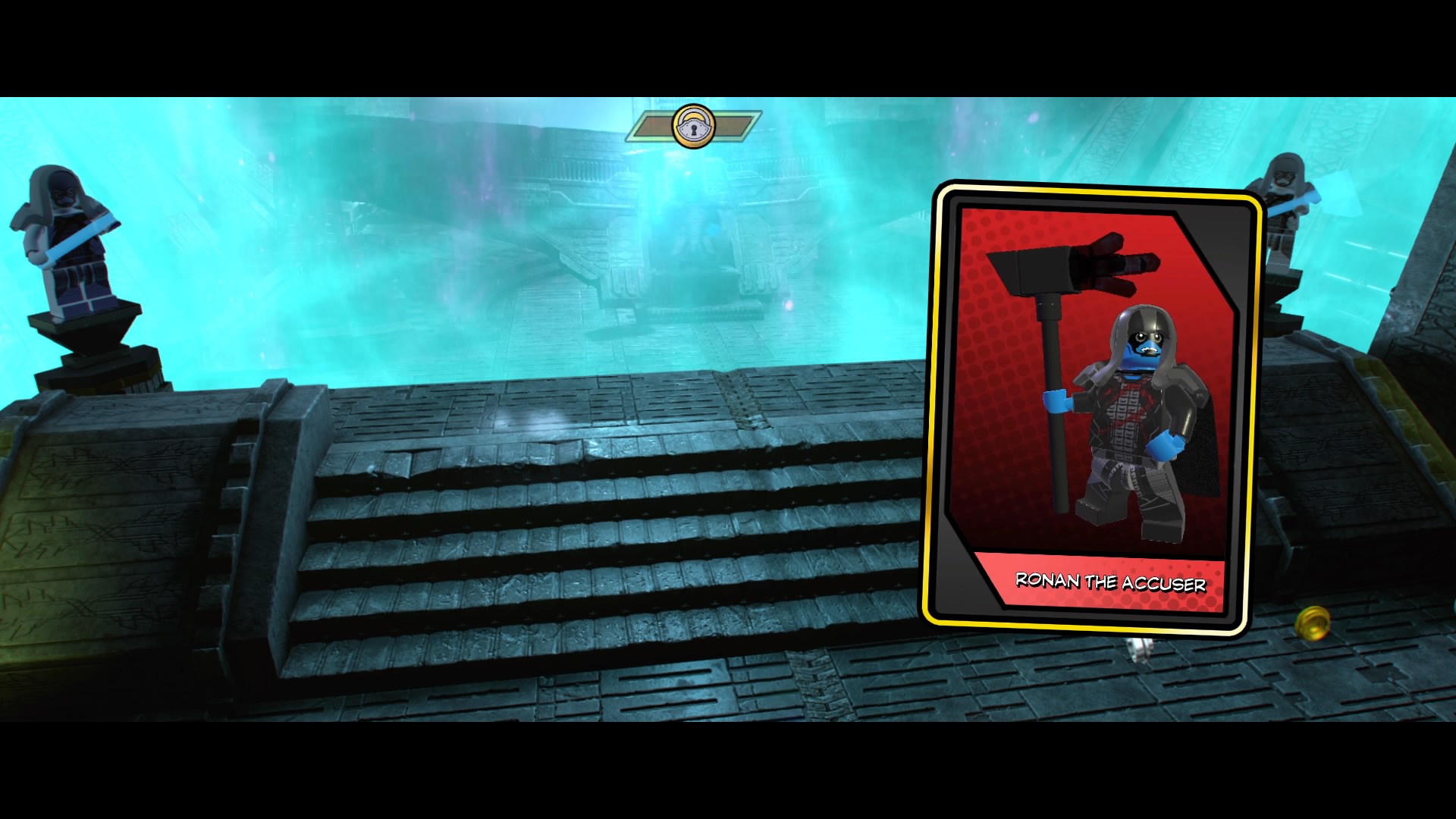 Past the crushers, smash the LEGO object near the final door to create Groot pad. Groot will grow and rip down the doors to the next room – it’s Ronan the Accusar’s throne room. Ronan immediately sends his bite-hungry dogs and minions to fight. There’s no trick here, just blast them until both dogs are defeated! Do the same for Ronan and you’ll complete the level.