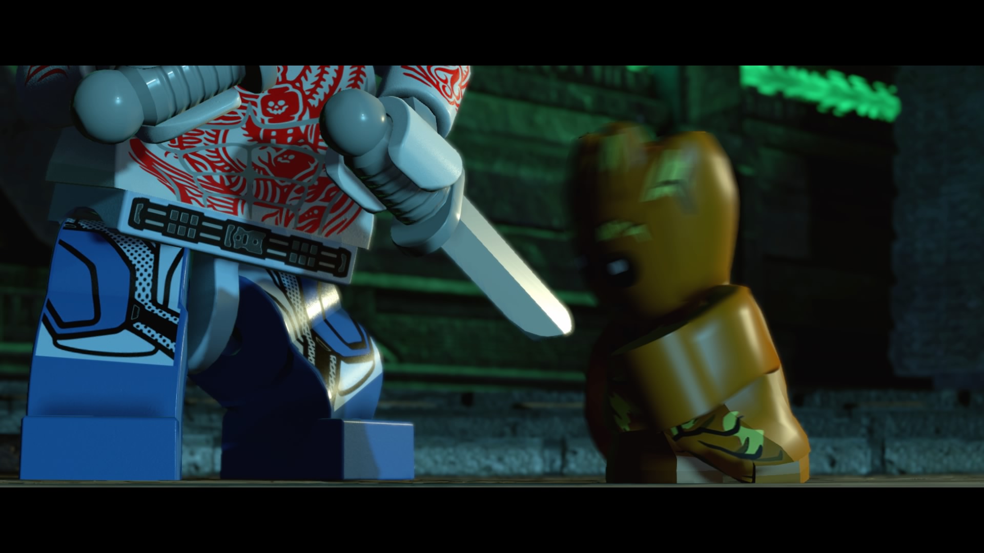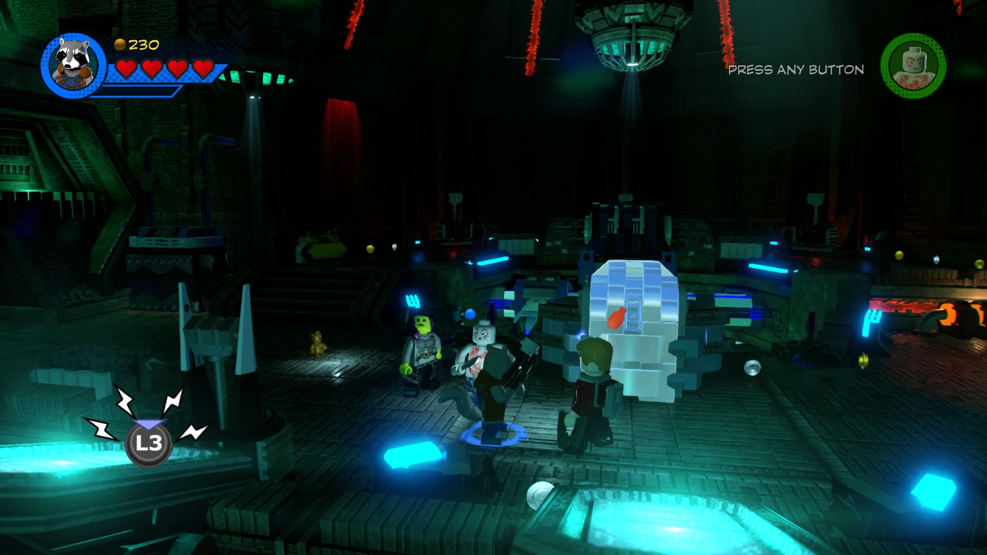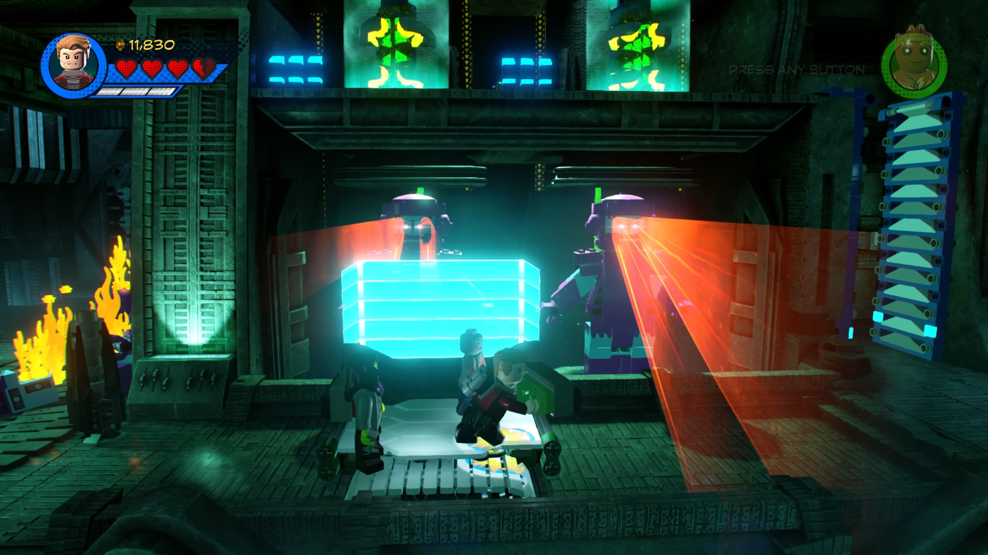 On the other side of the lasers, wall-jump up the narrow shaft and stand on two of the red buttons to disable the generator shields. Now you can smash the green LEGO shields to stop those annoying lasers. With the lasers disabled, smash the cracked glowing-red LEGO wall with Drax and use the Electricity Panel with Rocket Raccoon’s lightning beam.