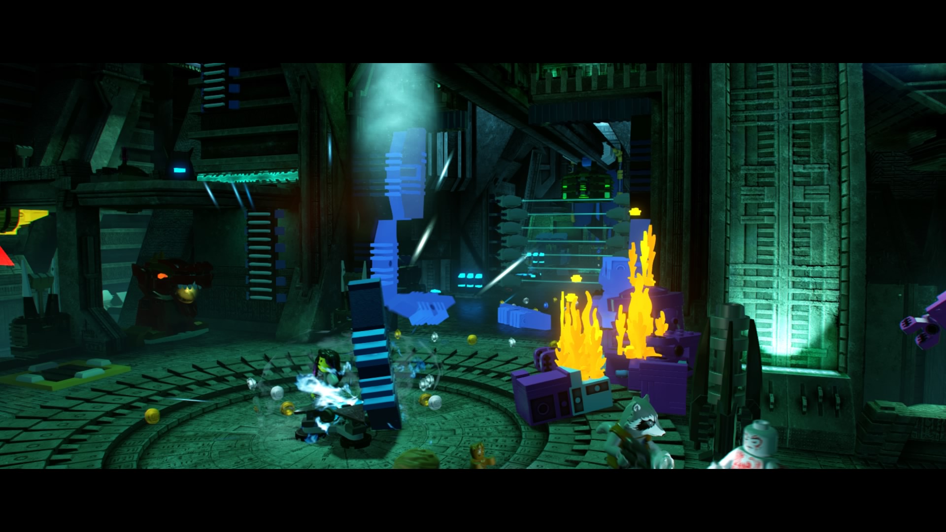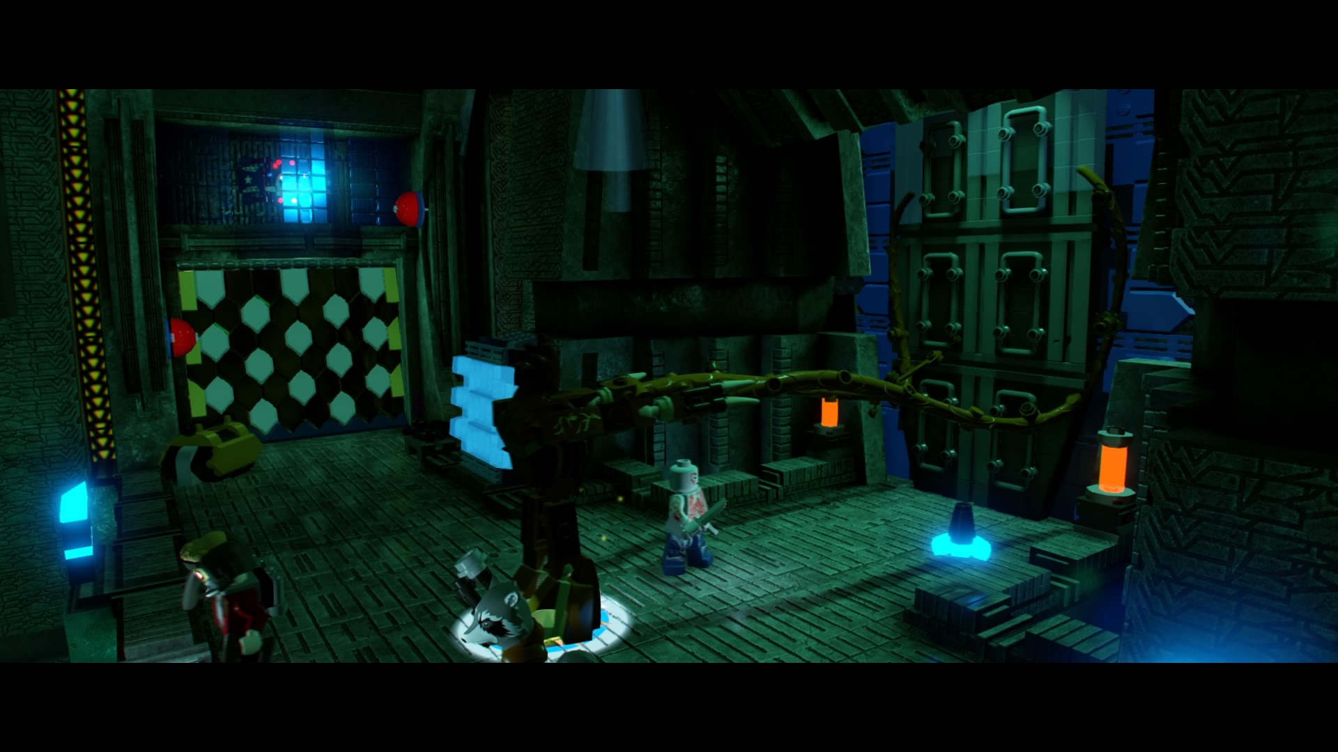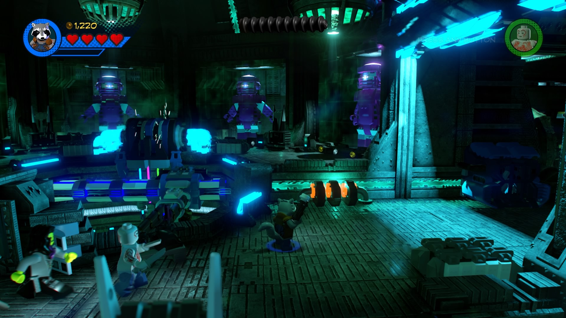 In the dark Kree facility, swap to Rocket Racoon and blow up the silver LEGO metal object in the center-foreground area. Use the control panel behind that metal stuff and use the crane to place all the power cells – match the colors to solve the puzzle. The door to the right will open, but two giant robots will project lasers blocking the way forward.