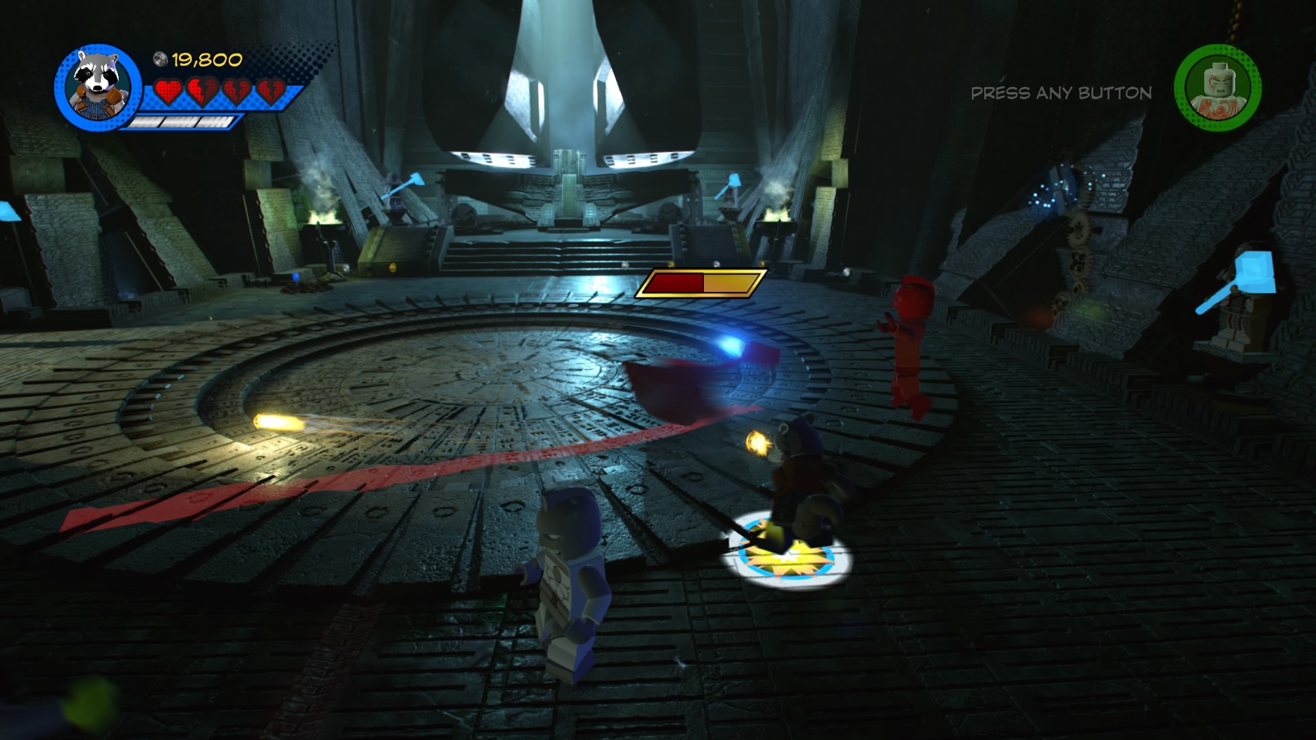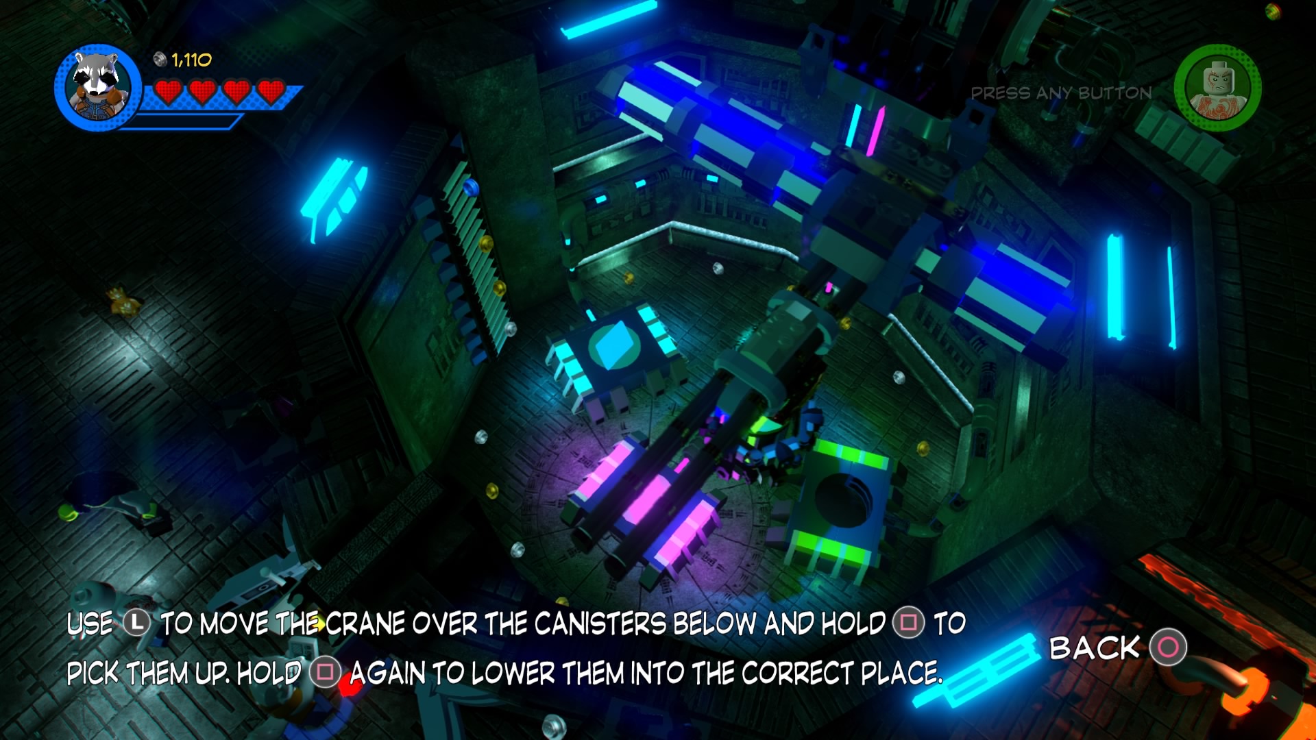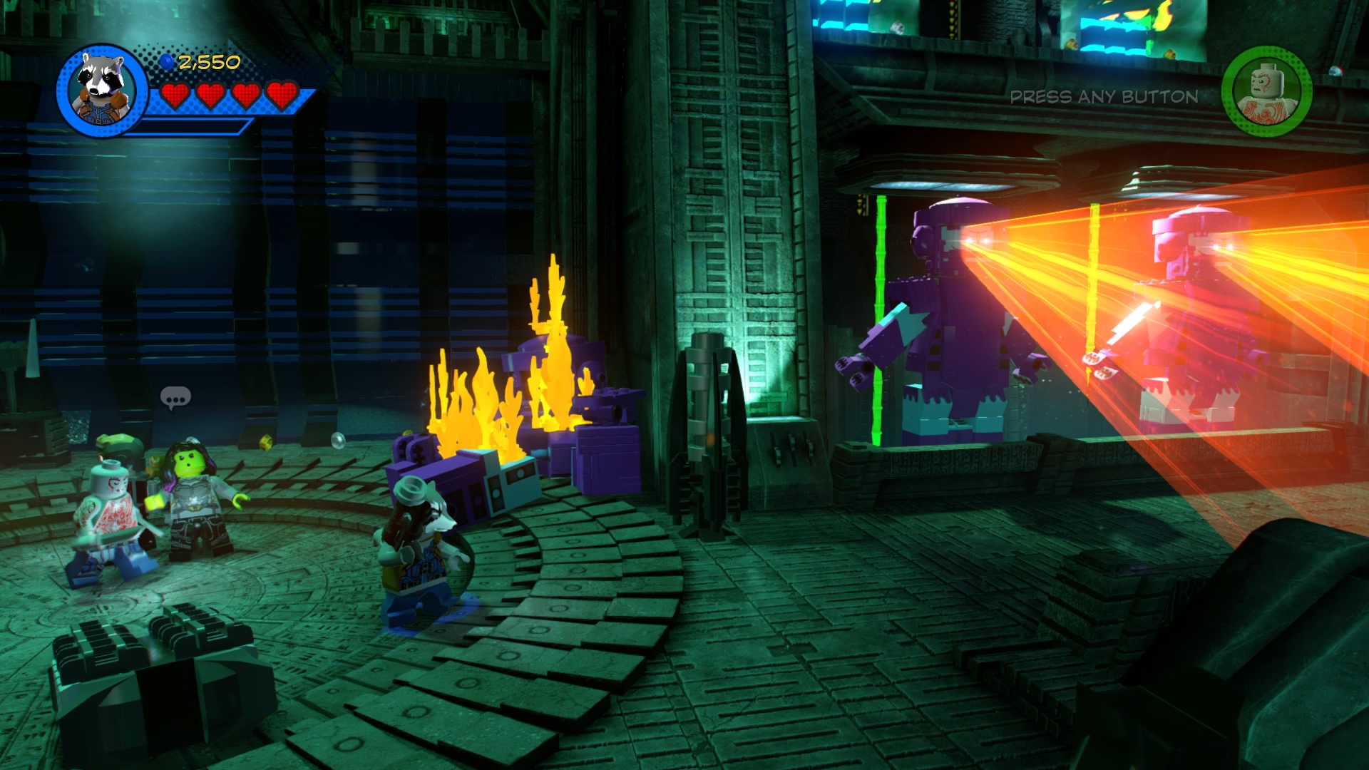 In the dark Kree facility, swap to Rocket Racoon and blow up the silver LEGO metal object in the center-foreground area. Use the control panel behind that metal stuff and use the crane to place all the power cells – match the colors to solve the puzzle. The door to the right will open, but two giant robots will project lasers blocking the way forward.