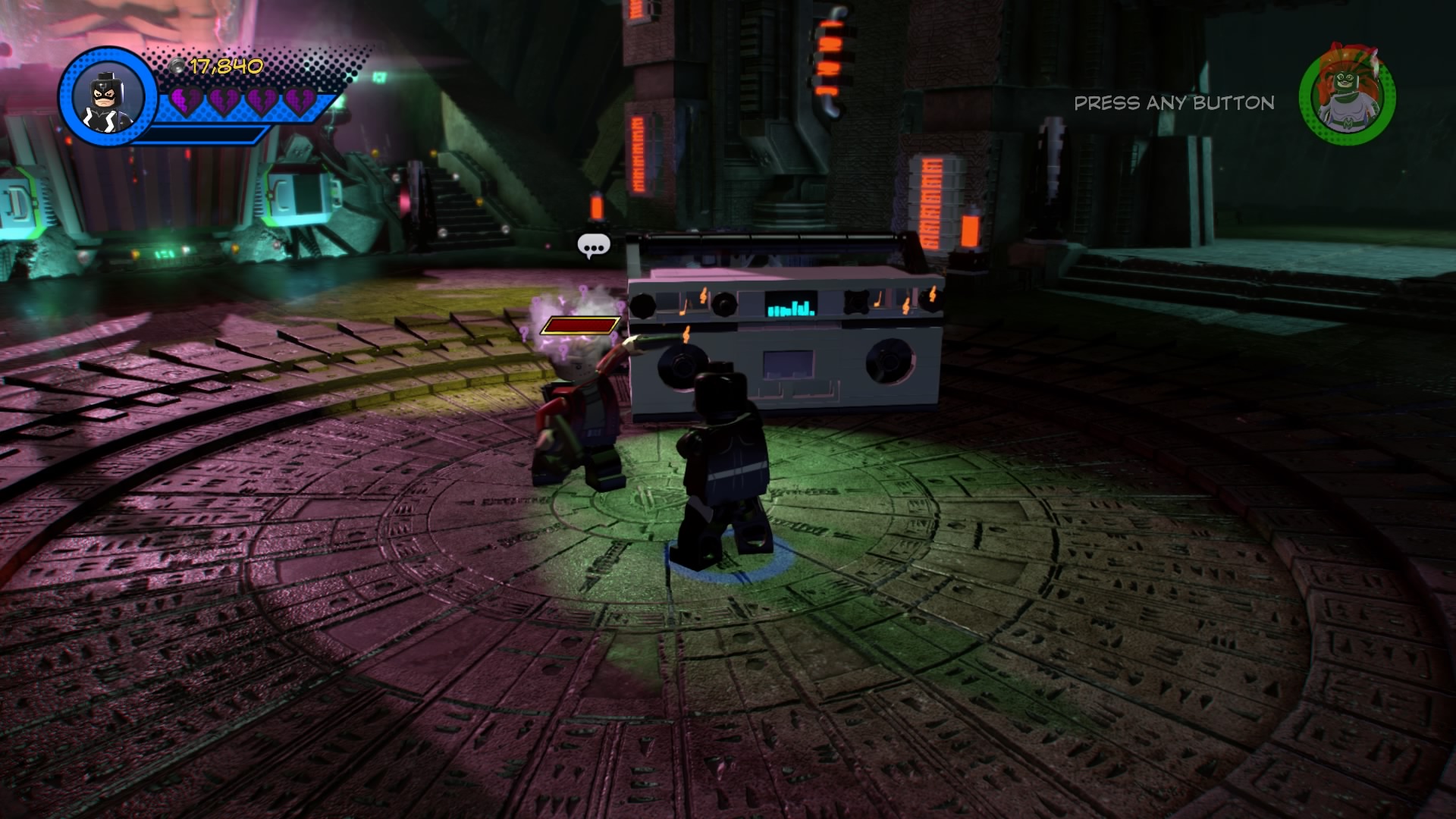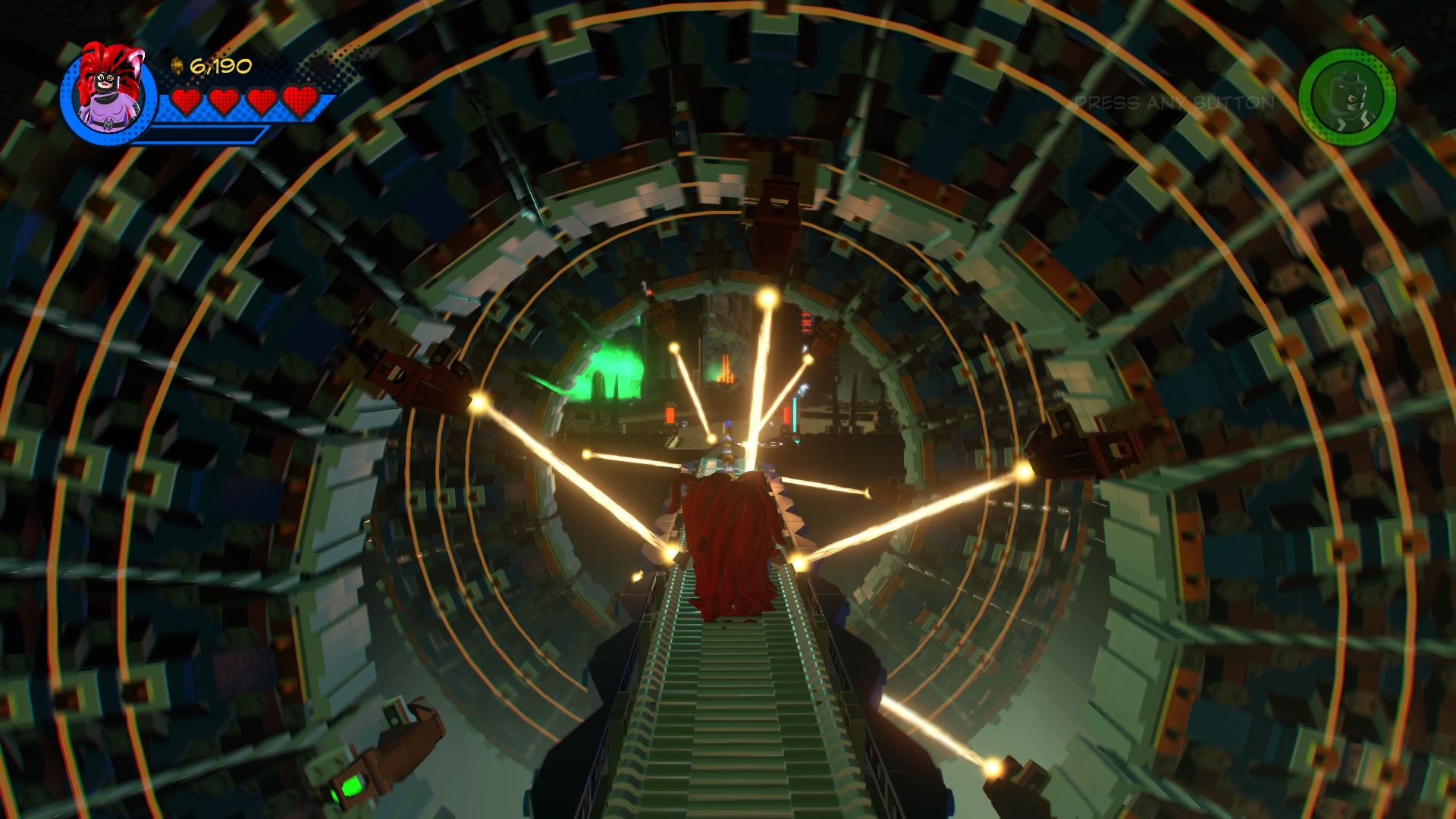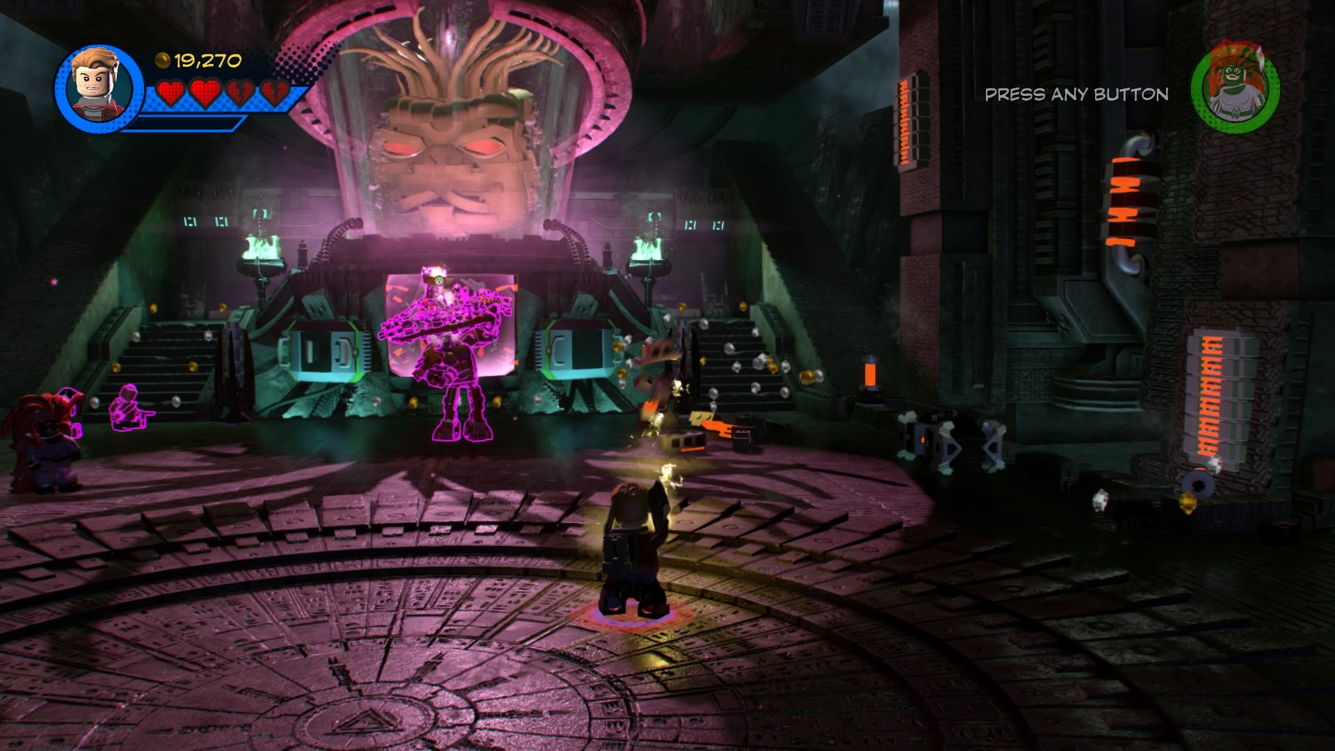 Inside the floating-head chamber, you’ll have to fight Star-Lord! Beat him up until Star-Lord tosses a gravity mine, making a pile of hopping bricks appear. Construct them into a radio, and Star-Lord will challenge you to a dance-off. Press the buttons that appear onscreen as you cut a rug, and Star-Lord will escape his mind control! Swap to Star-Lord right away when you’ve saved him.