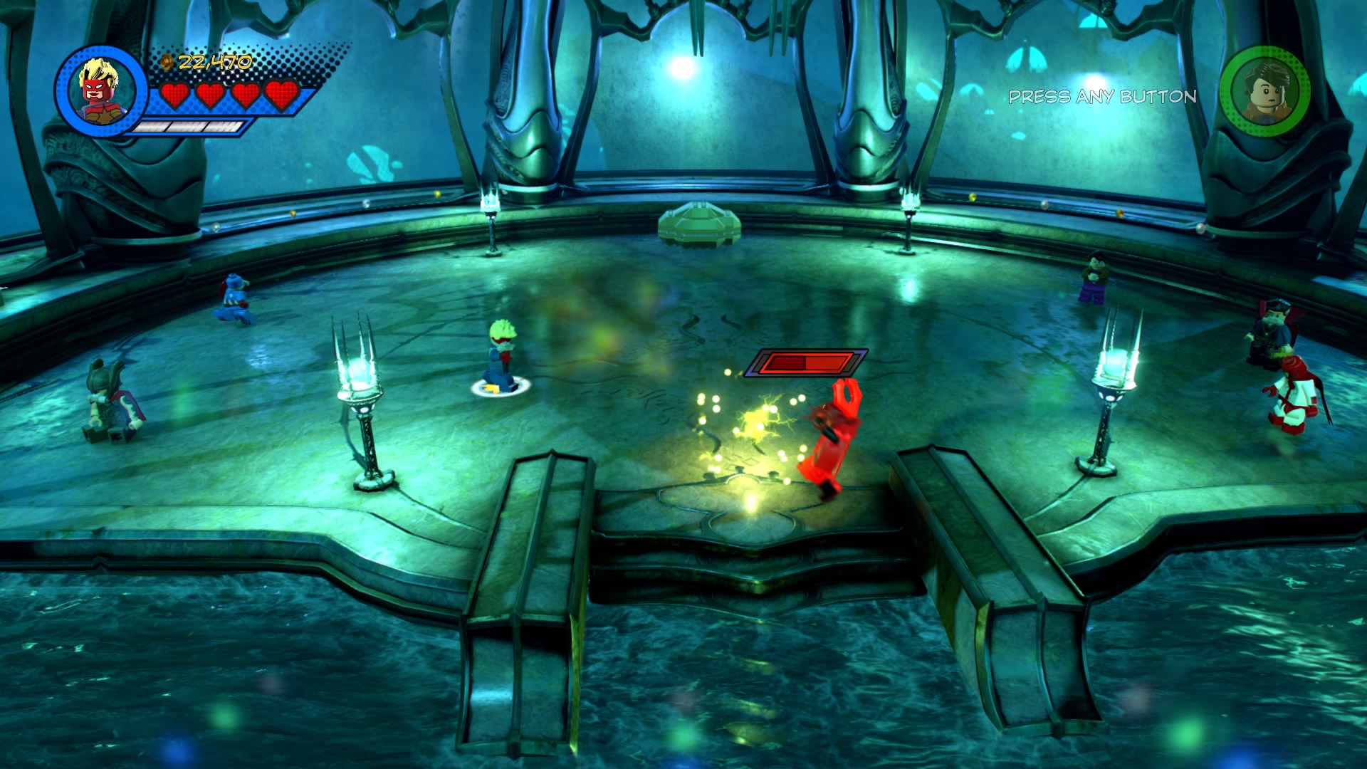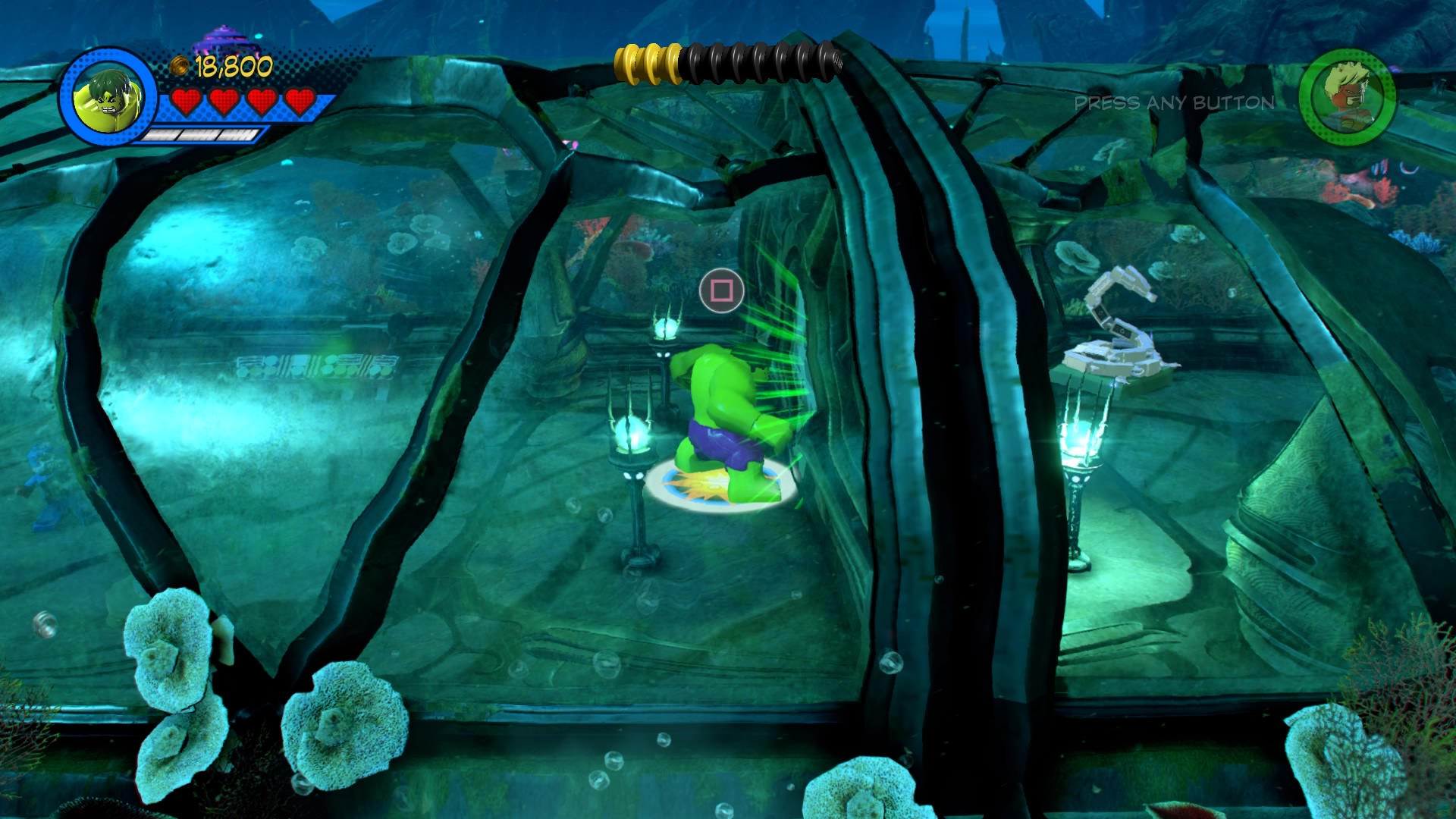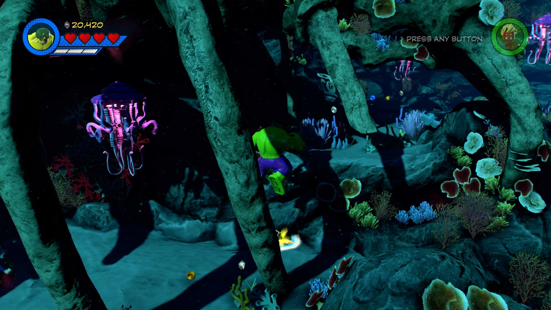 Swap to Doctor Strange and use his magic on the LEGO valve near the door. Move it to the airlock then smash the cracked green LEGO wall with Hulk, naturally. The hall with fill with water, but you can still chase Attuma! Go through the giant fish skull’s jaws and swim up in the cave filled with jellyfish. Attuma’s throne room is at the top, and he’s ready for a big brawl.